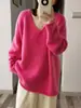 Suéter de punto de lana pura con cuello en V para mujer, suéter holgado de color sólido, elegante, informal, combinable, de manga larga, para otoño e invierno.