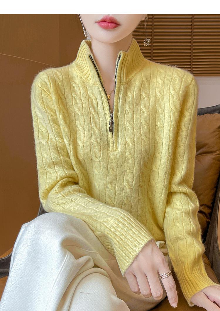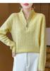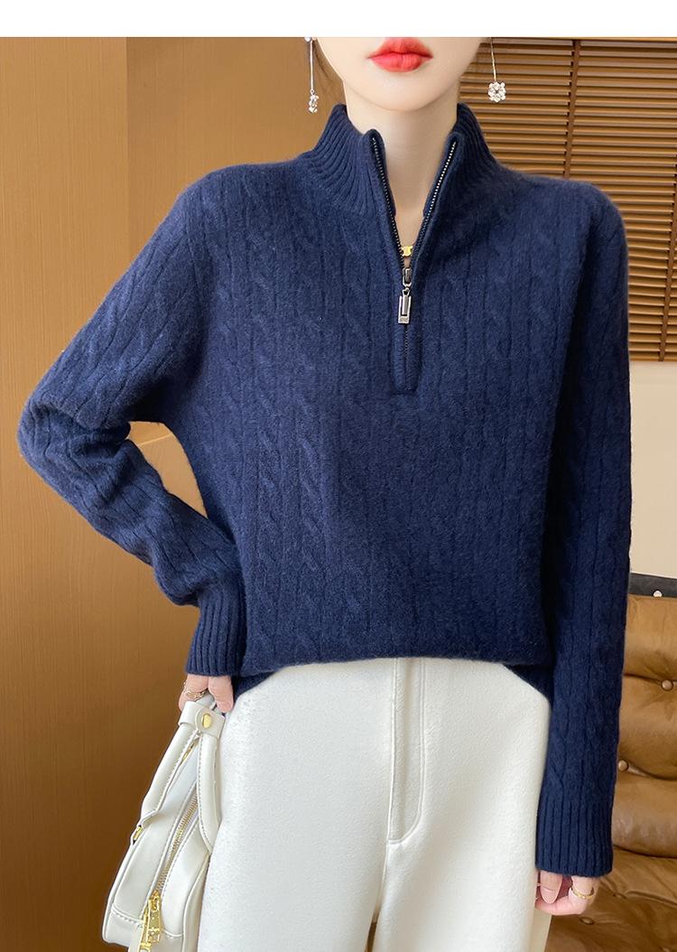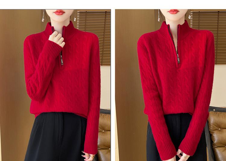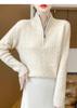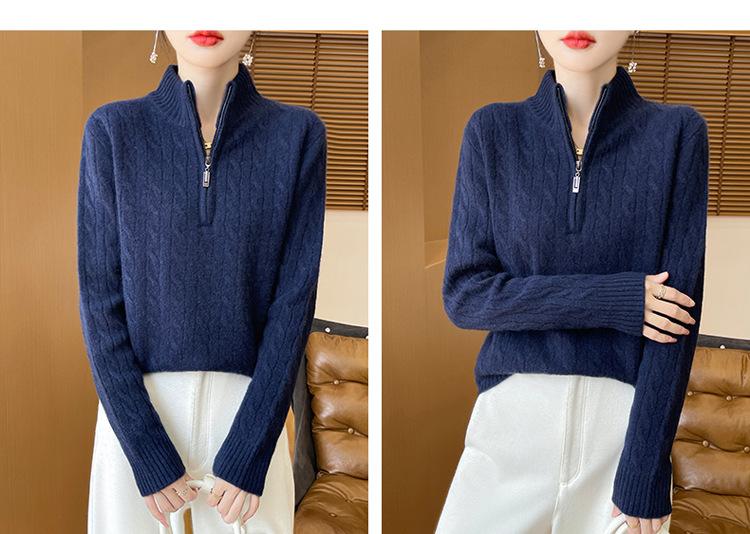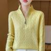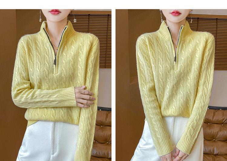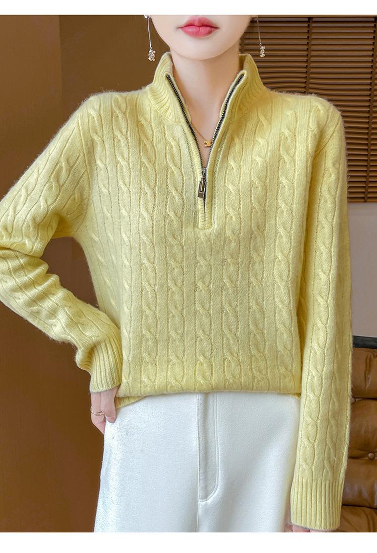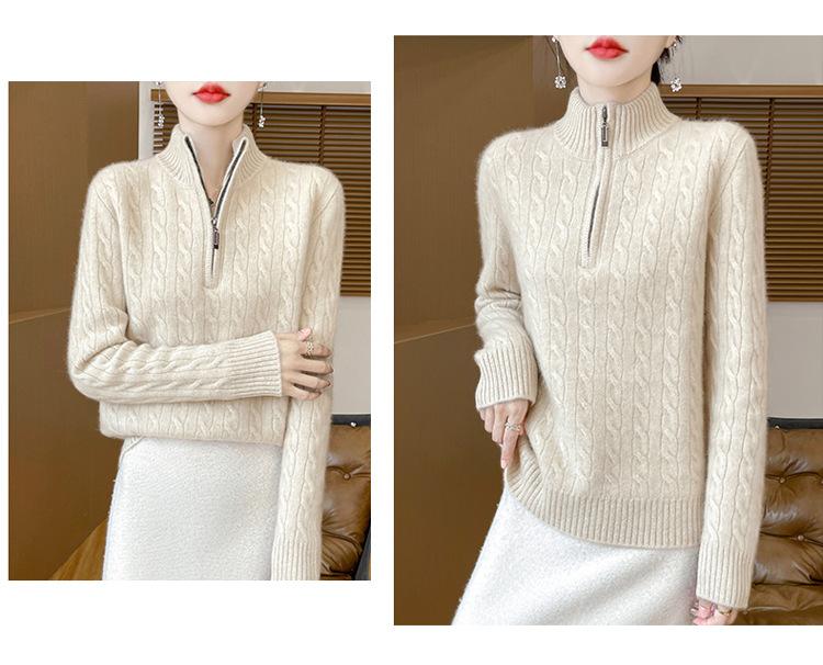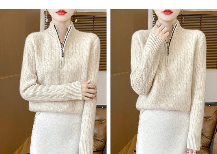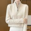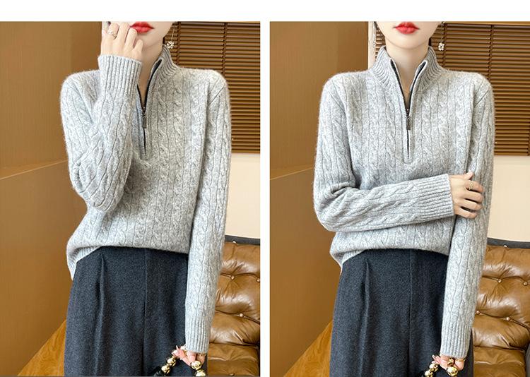 Otoño e Invierno Nuevo Casual Suelto Manga Larga Tejido Grueso Lana Pura Suéter Trenzado para Mujer con Media Cremallera