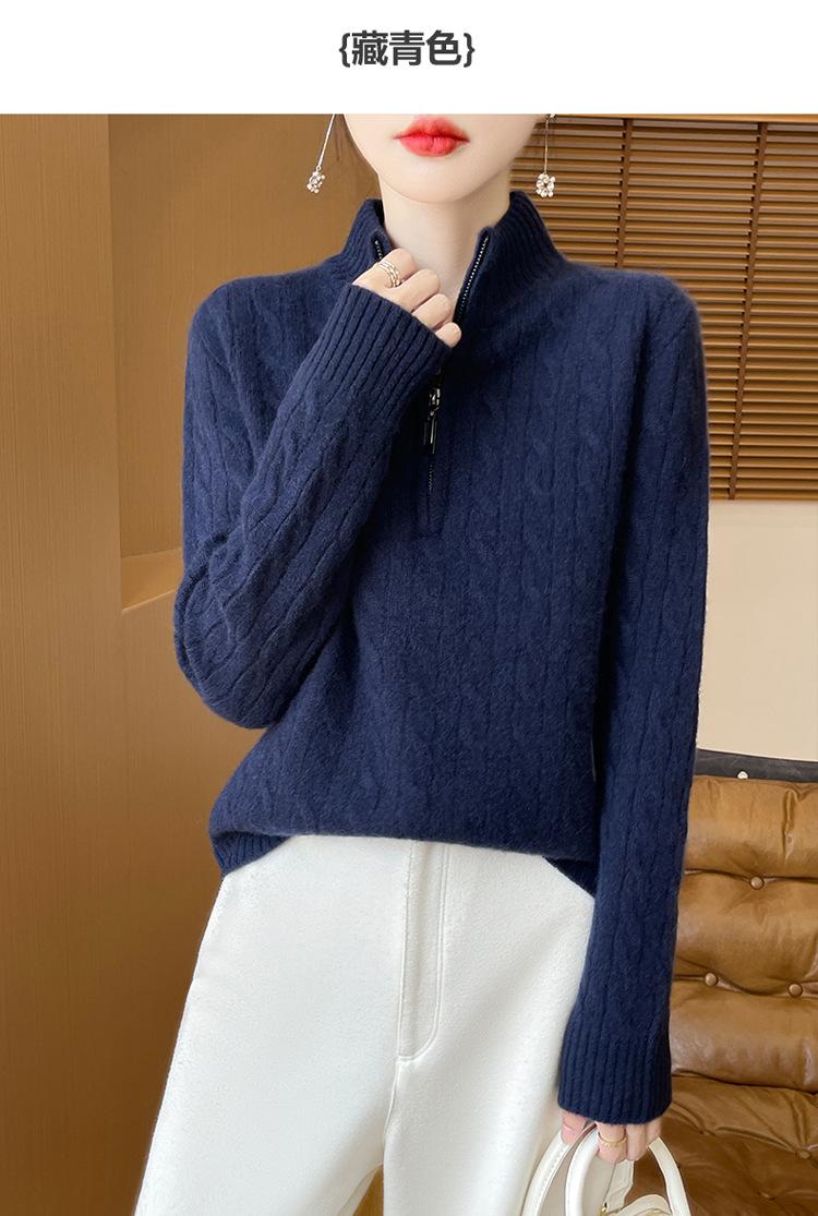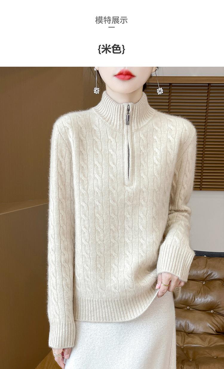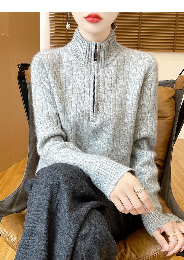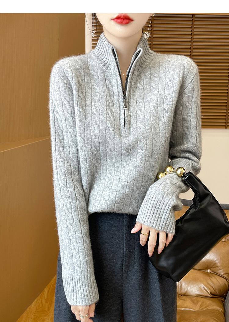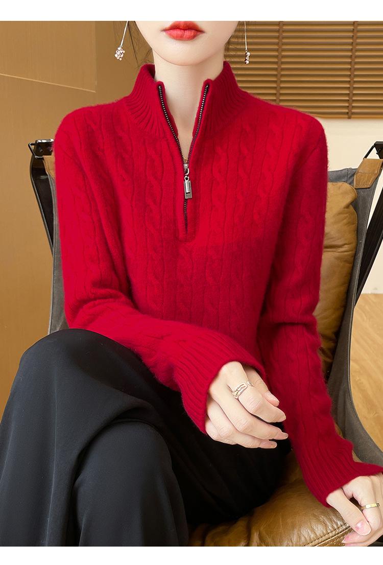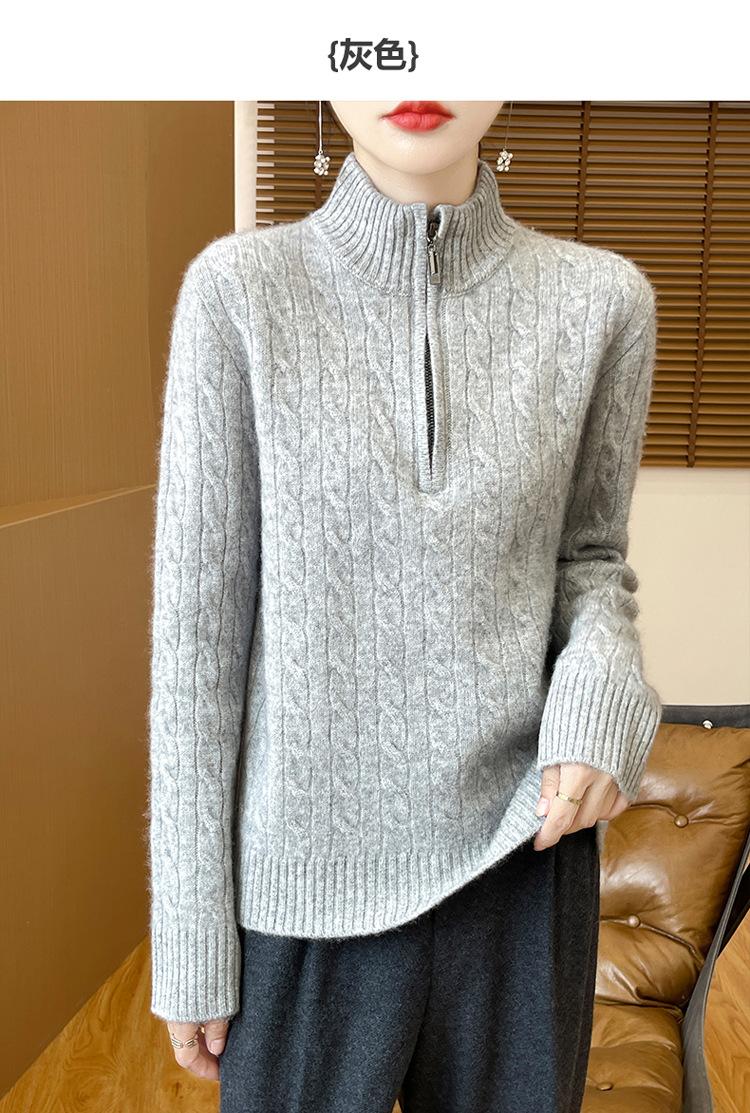 Otoño e Invierno Nuevo Casual Suelto Manga Larga Tejido Grueso Lana Pura Suéter Trenzado para Mujer con Media Cremallera