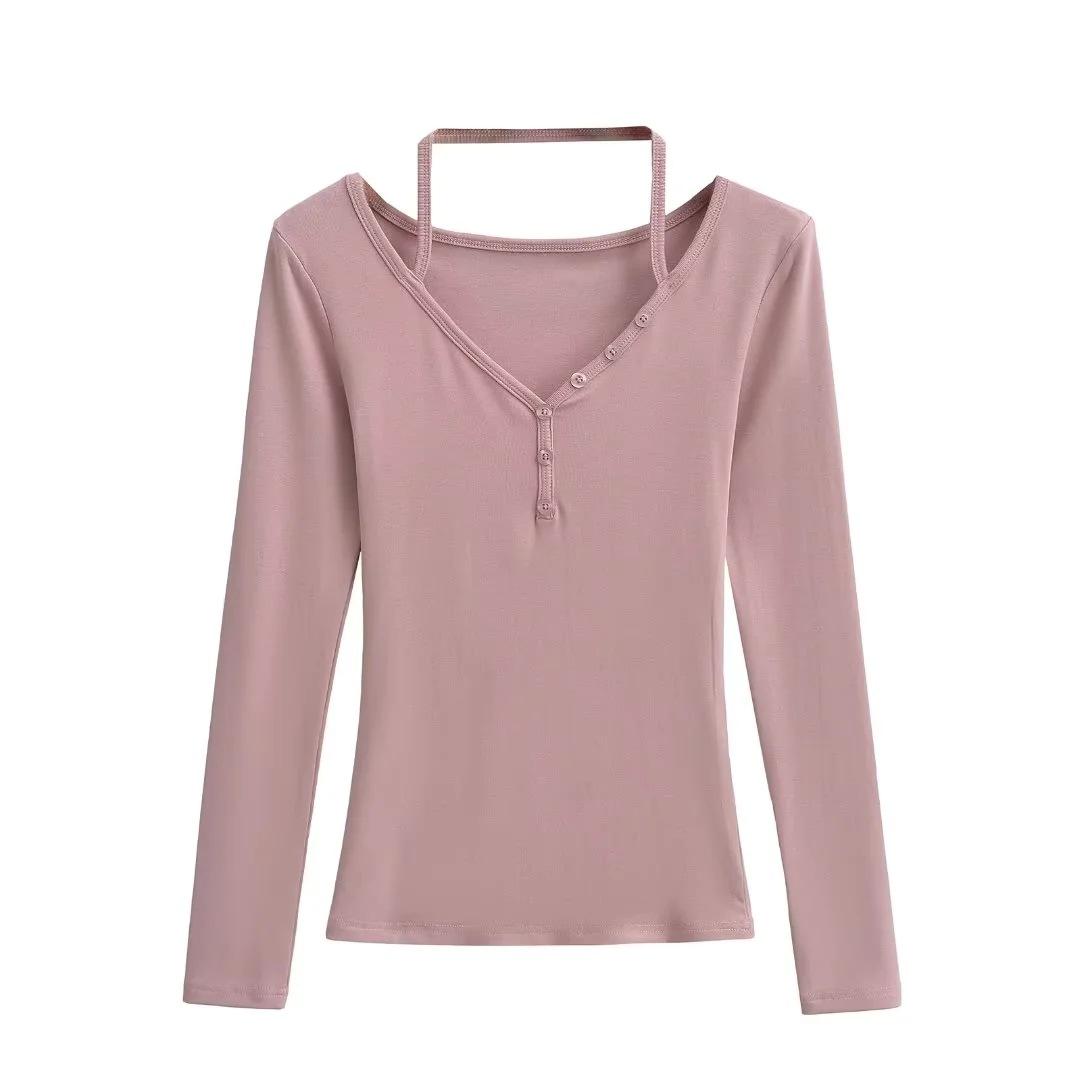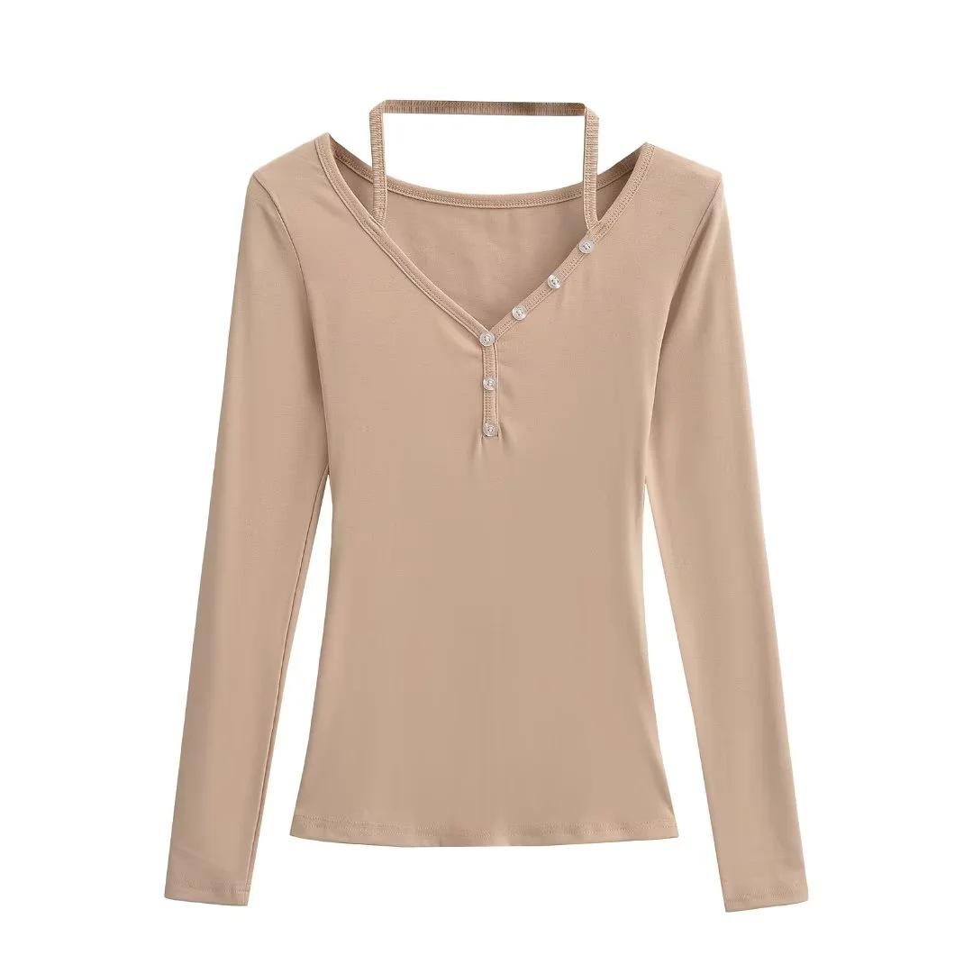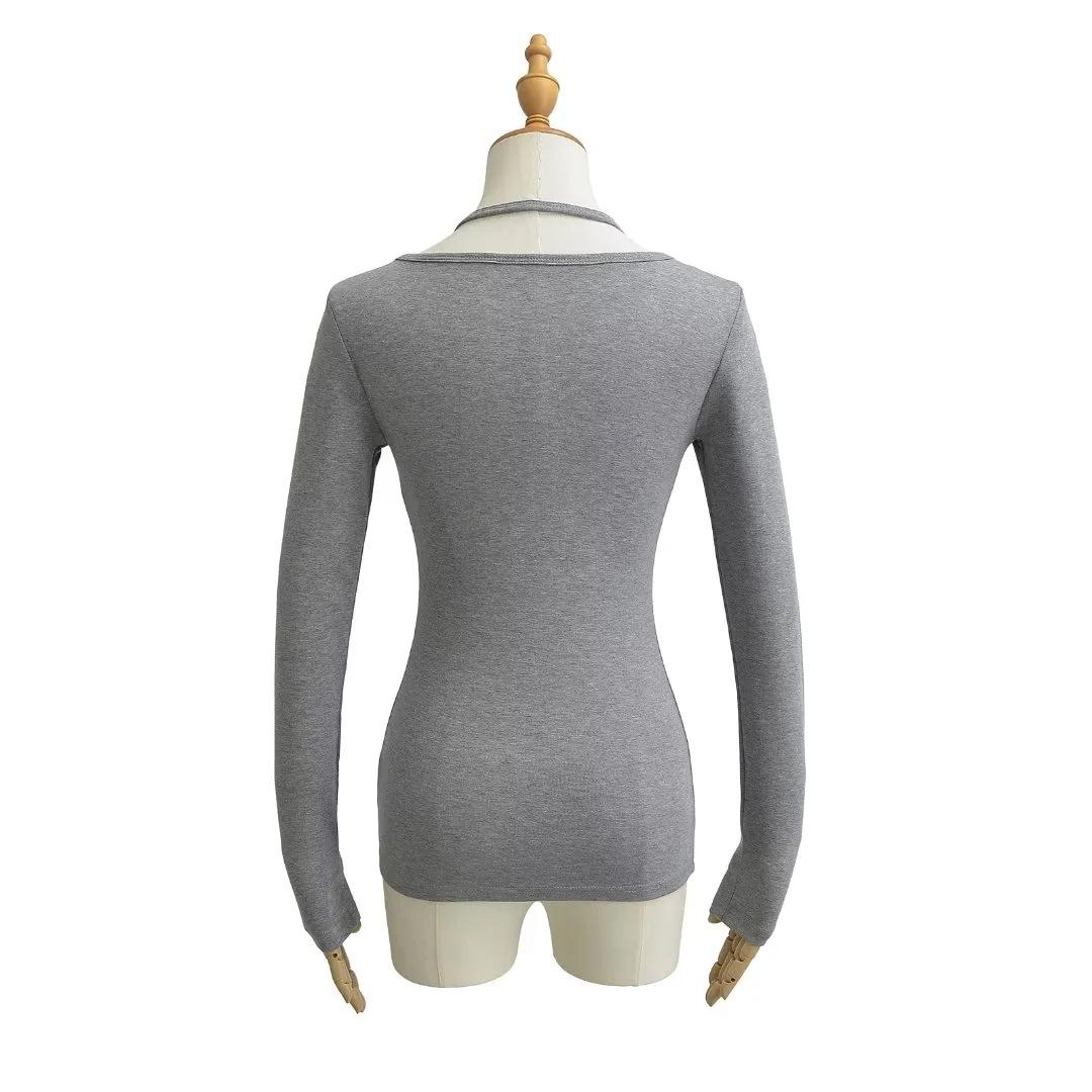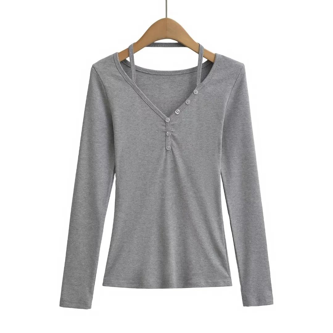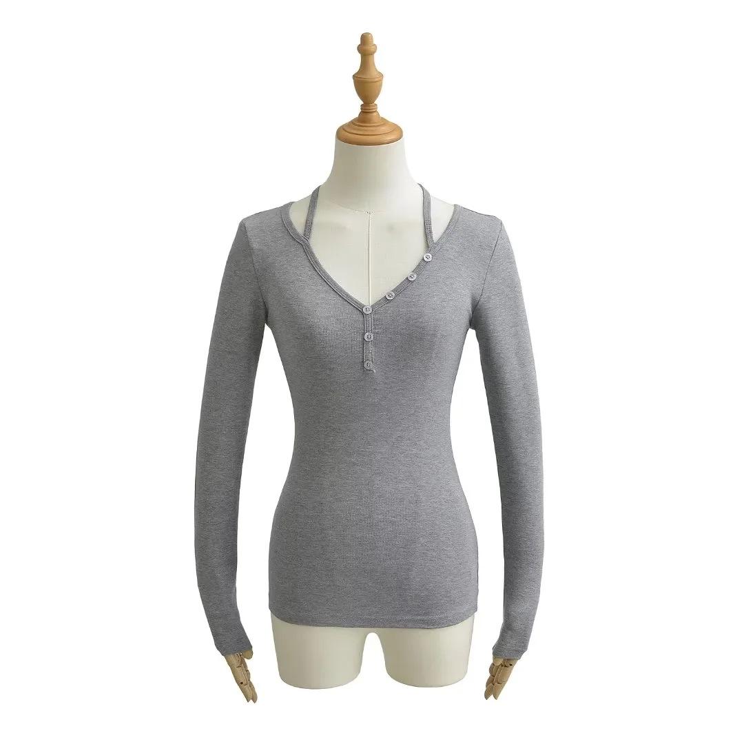 Camiseta sexy de manga larga con cuello en V y hebilla para mujer (2024)