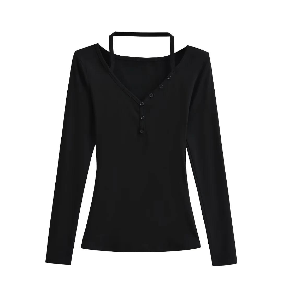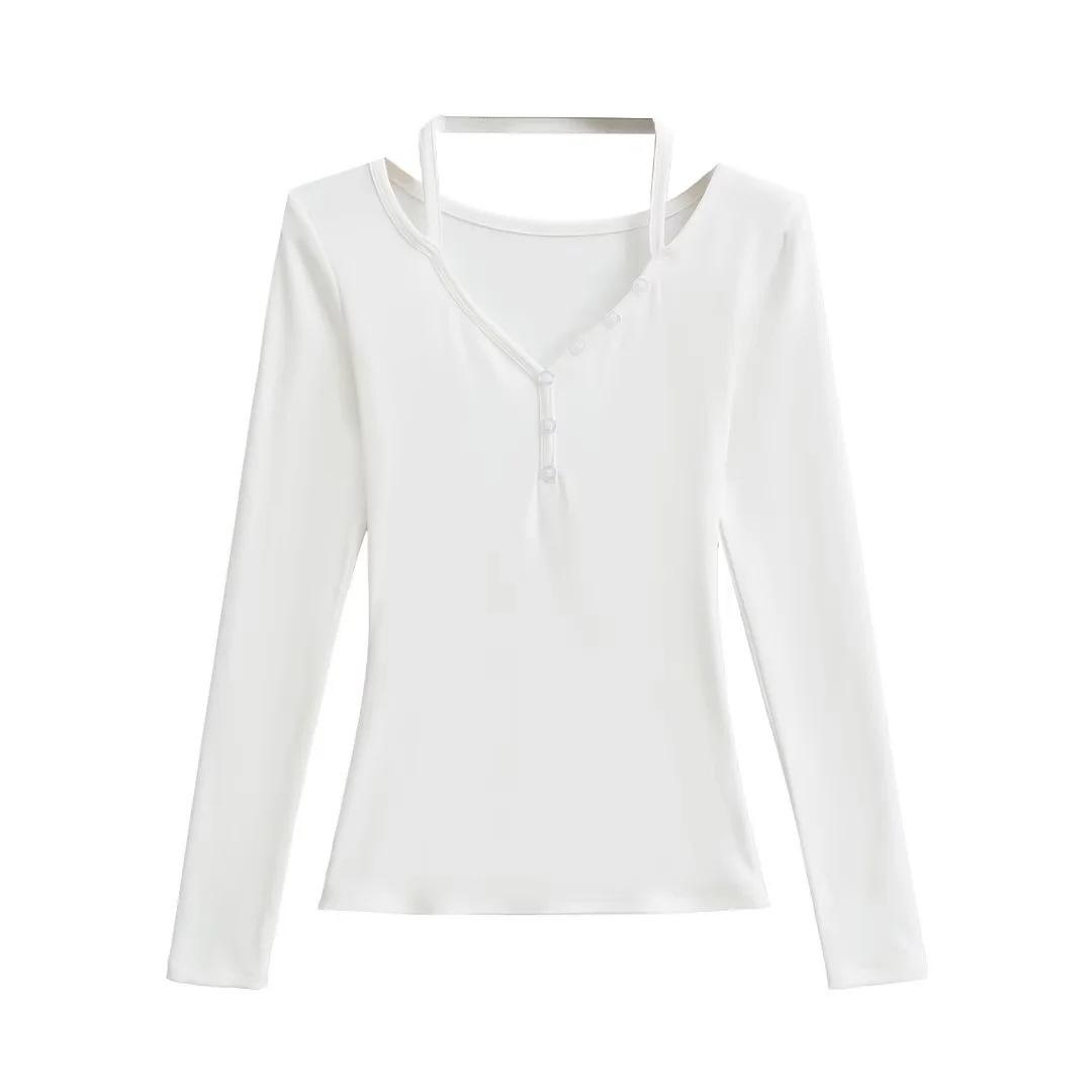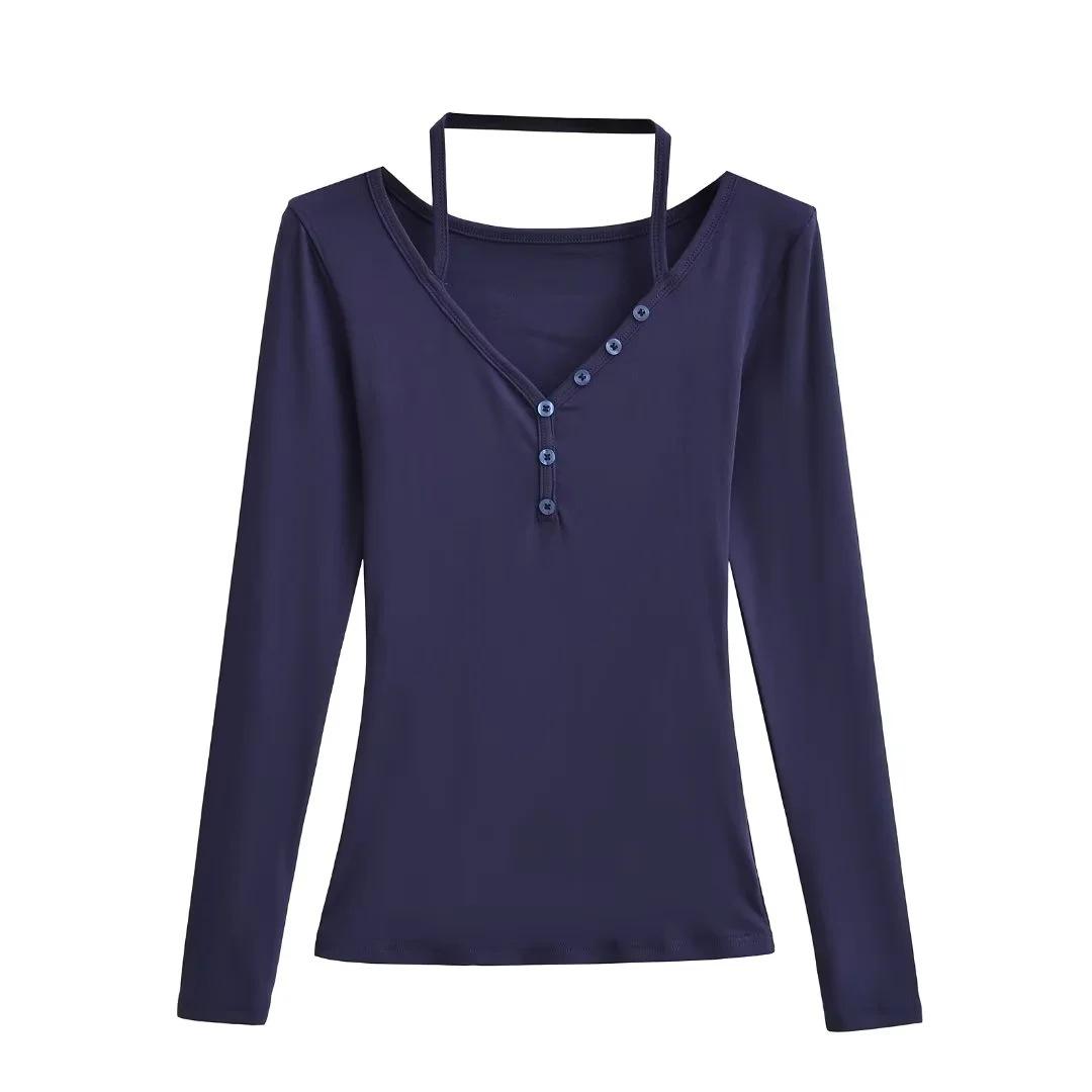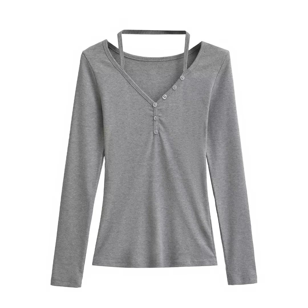 Camiseta sexy de manga larga con cuello en V y hebilla para mujer (2024)