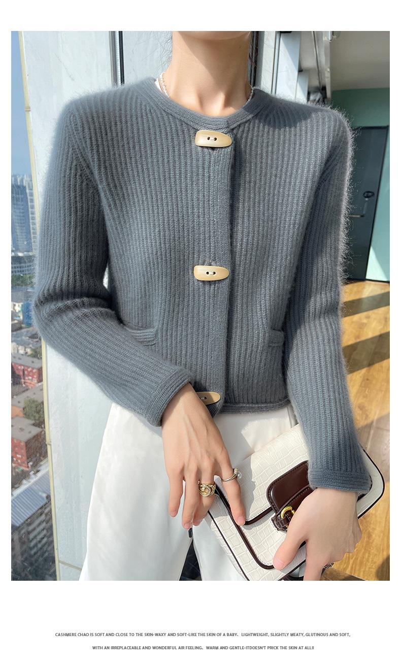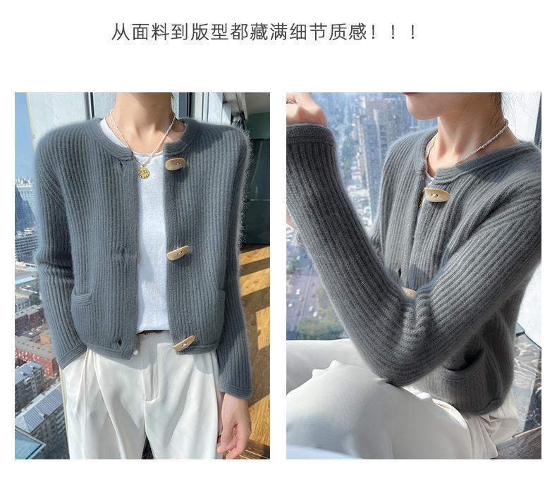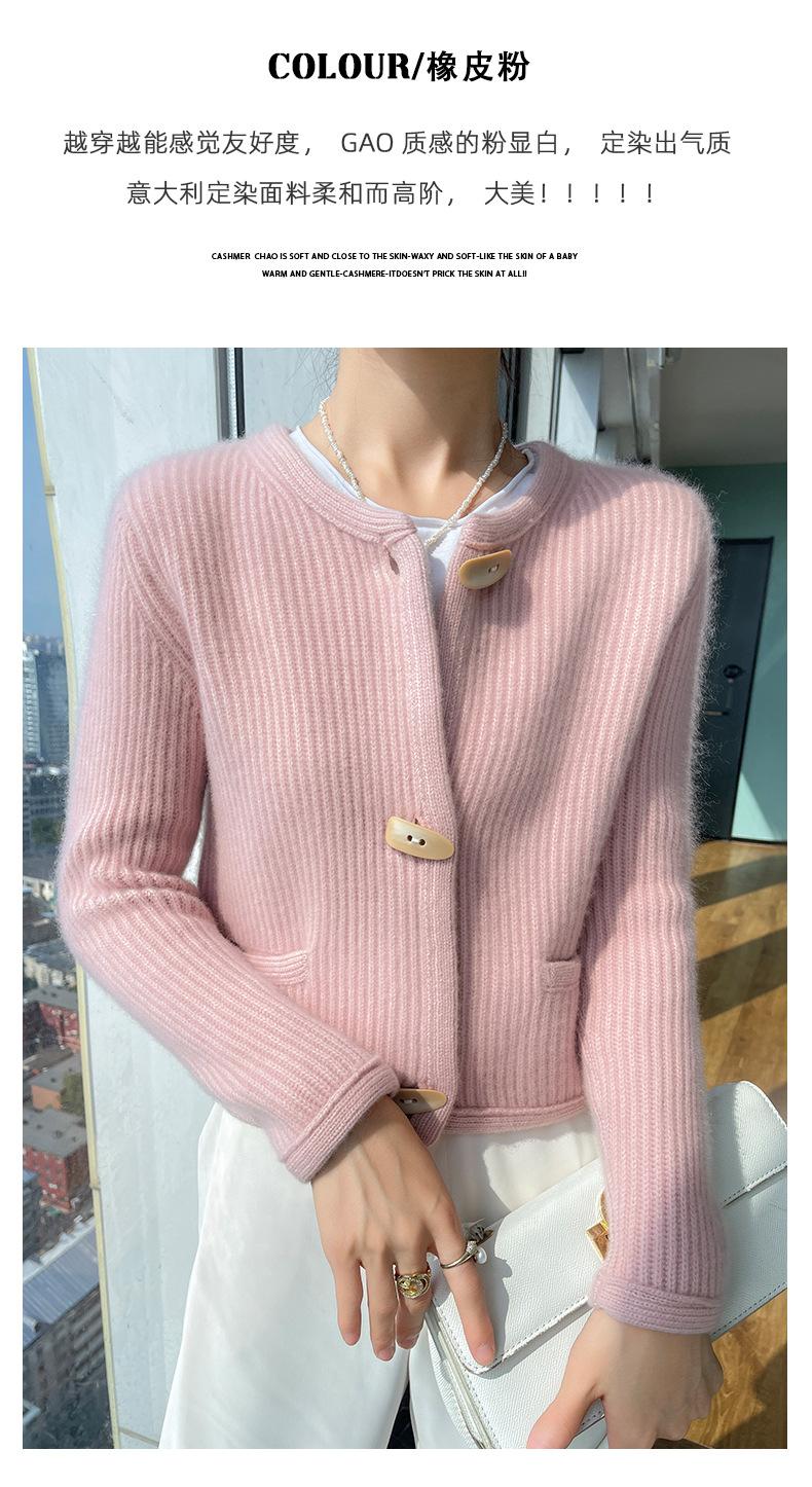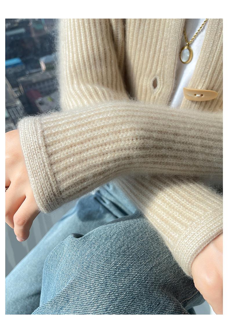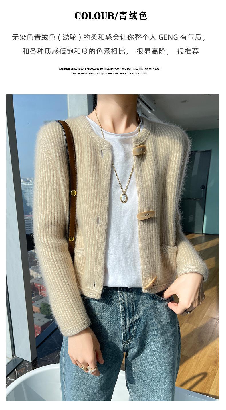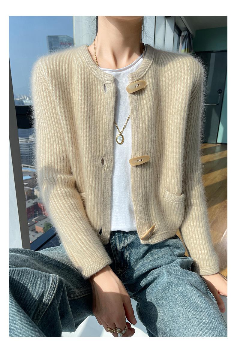 Cárdigan de Cachemira de Cuello Redondo Nuevo 2024 para Mujer Otoño e Invierno Suéter de Punto Grueso con Cuernos y Bolsillo Chaqueta de Lana