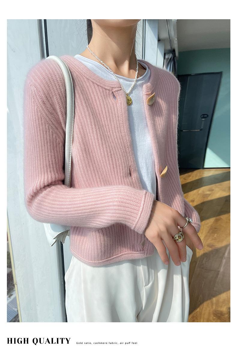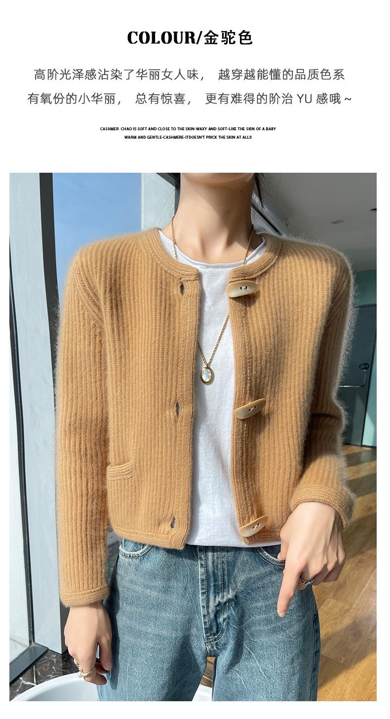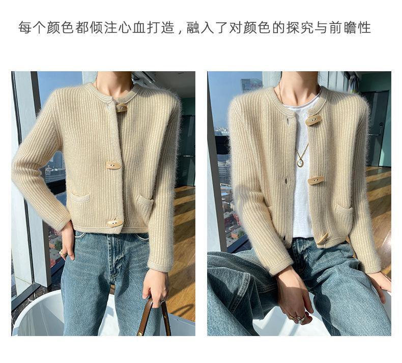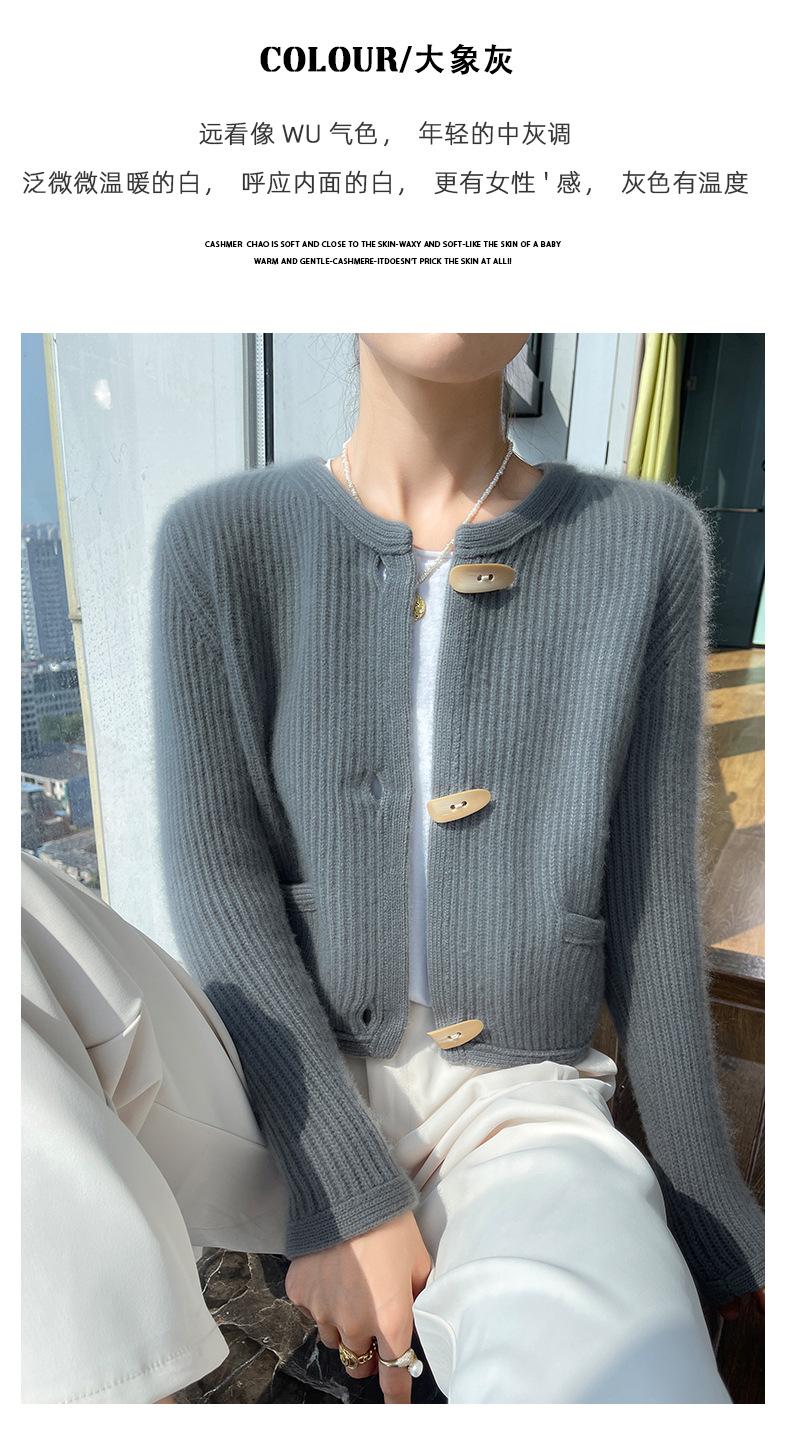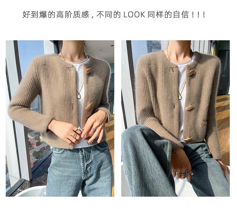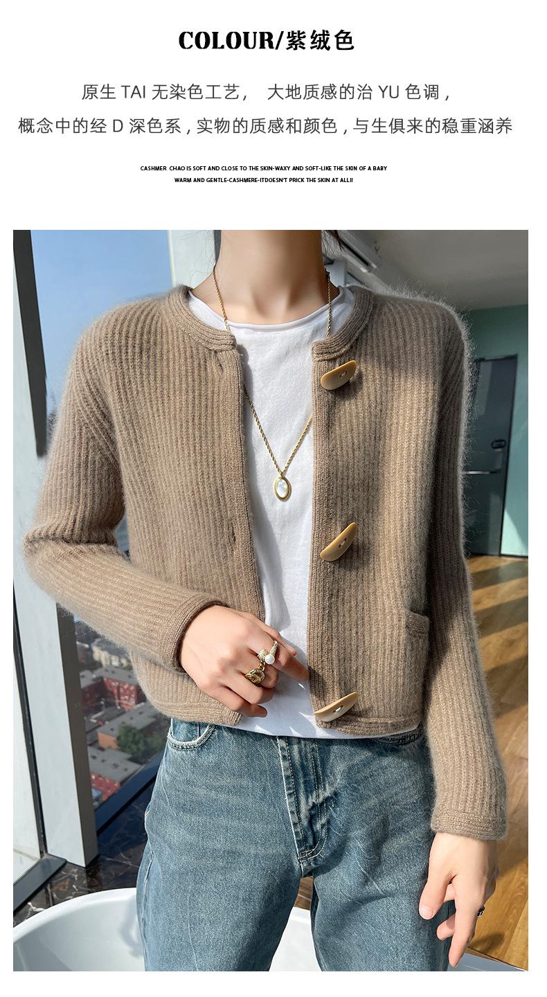 Cárdigan de Cachemira de Cuello Redondo Nuevo 2024 para Mujer Otoño e Invierno Suéter de Punto Grueso con Cuernos y Bolsillo Chaqueta de Lana