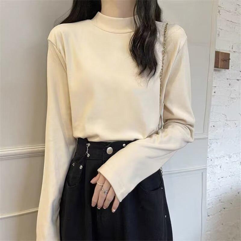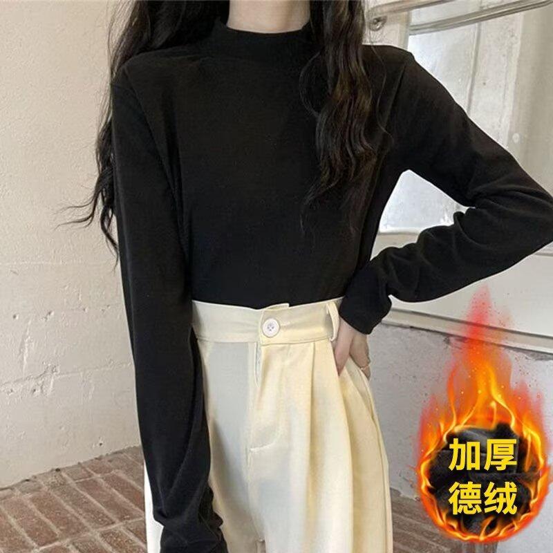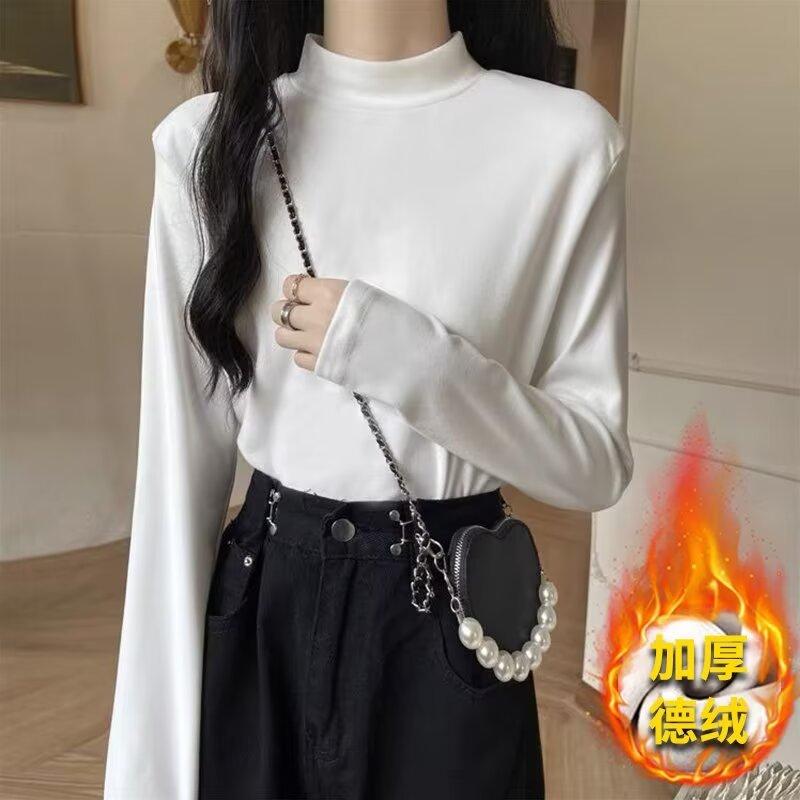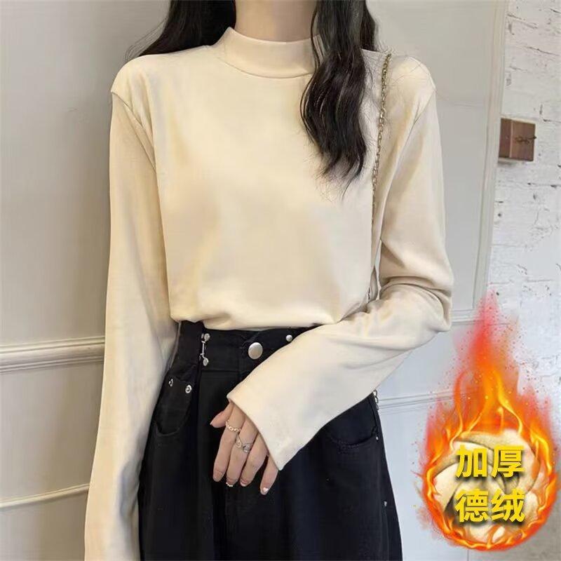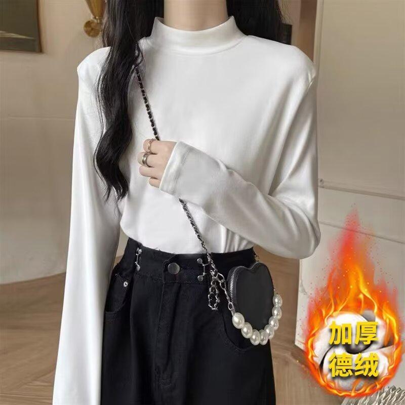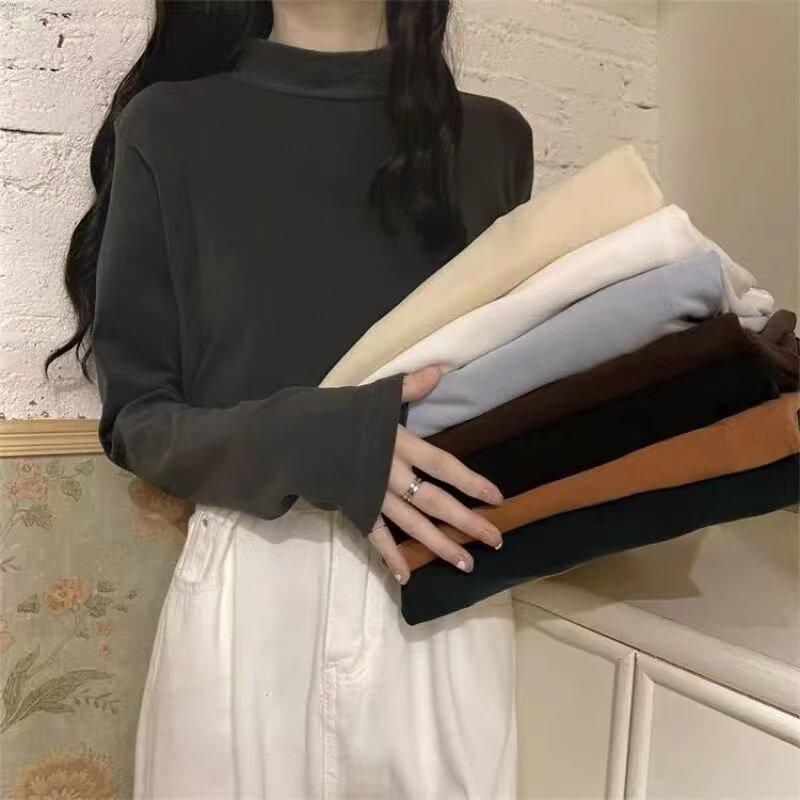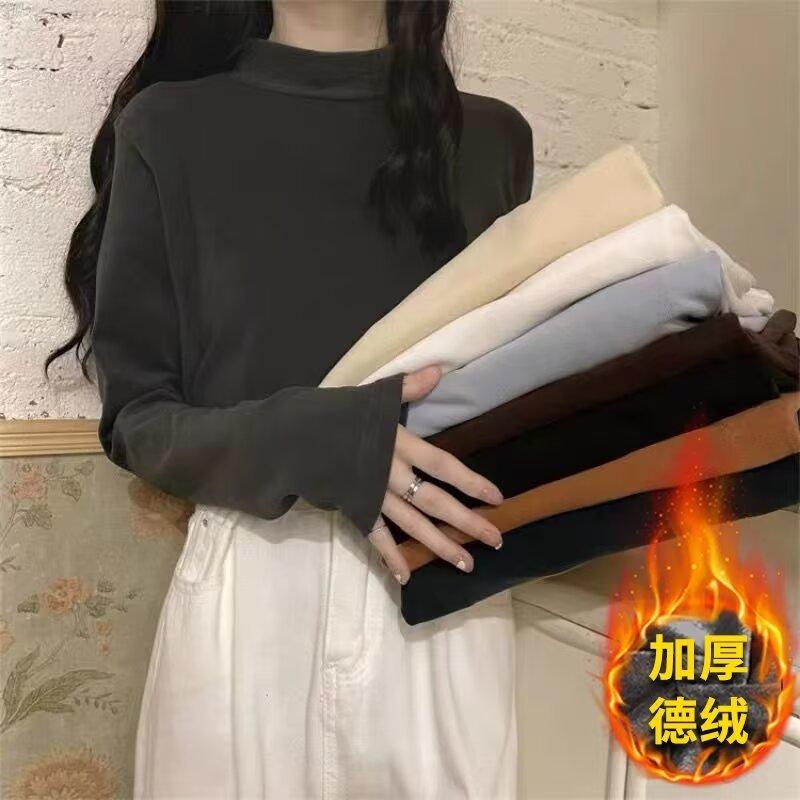 Camiseta básica de cuello medio alto de terciopelo para mujer, otoño e invierno, nuevo estilo, camiseta informal de manga larga, prenda exterior cálida para mujer