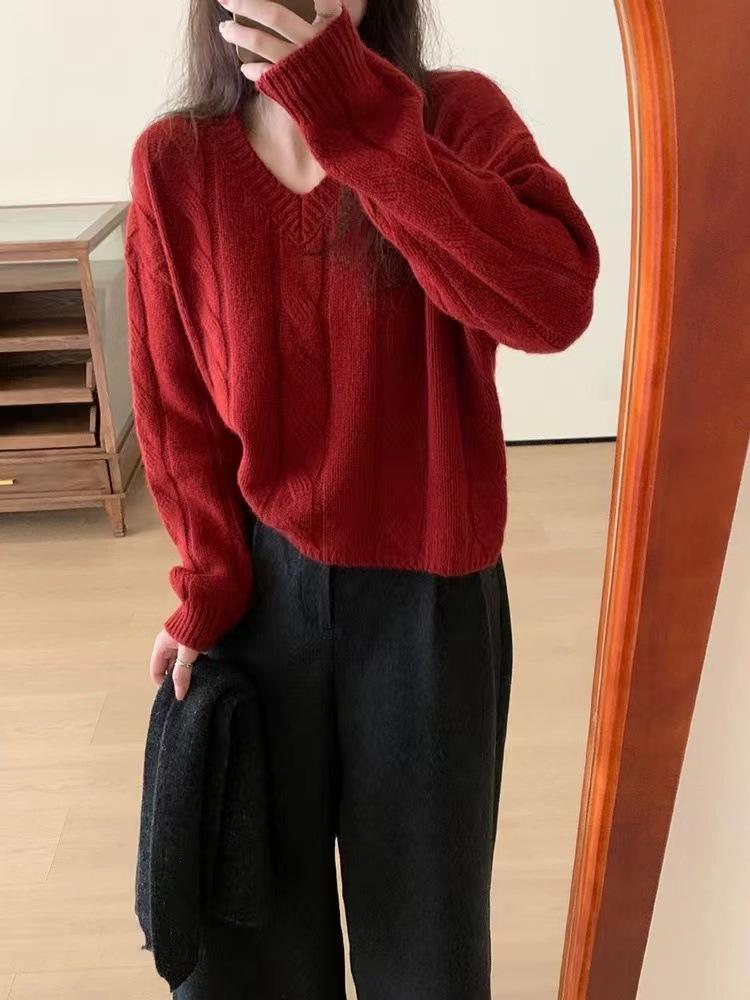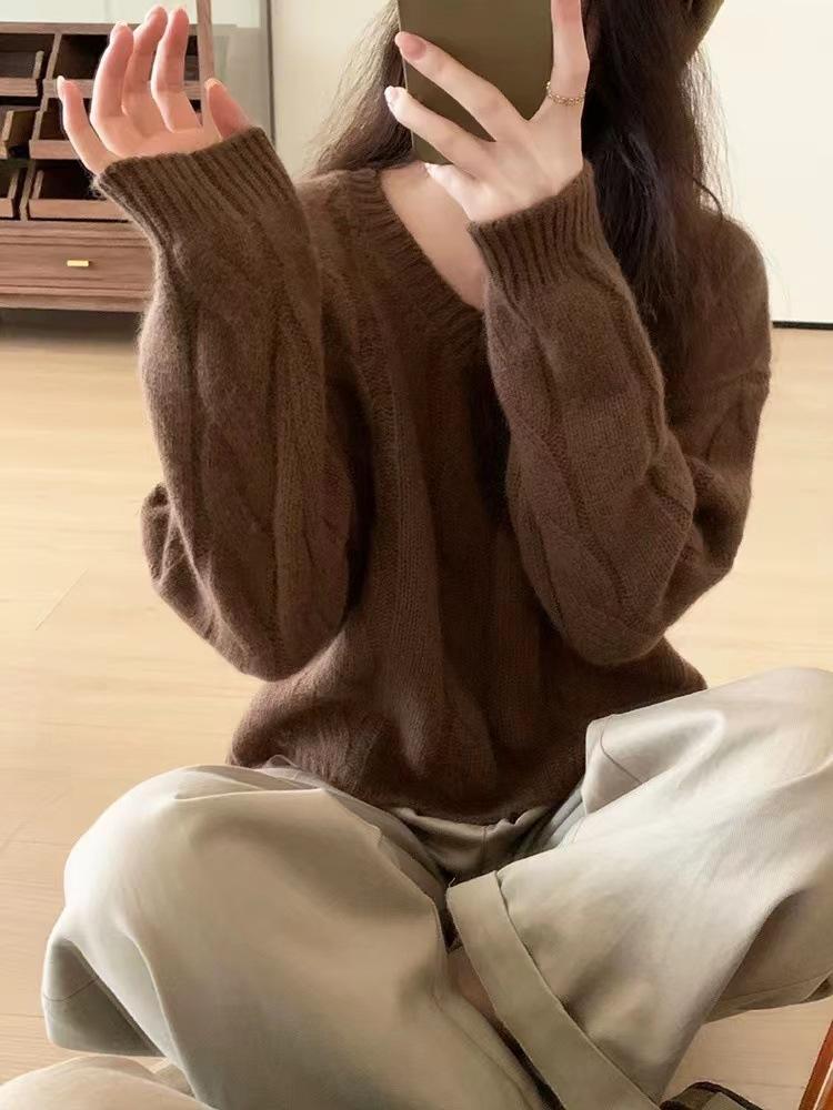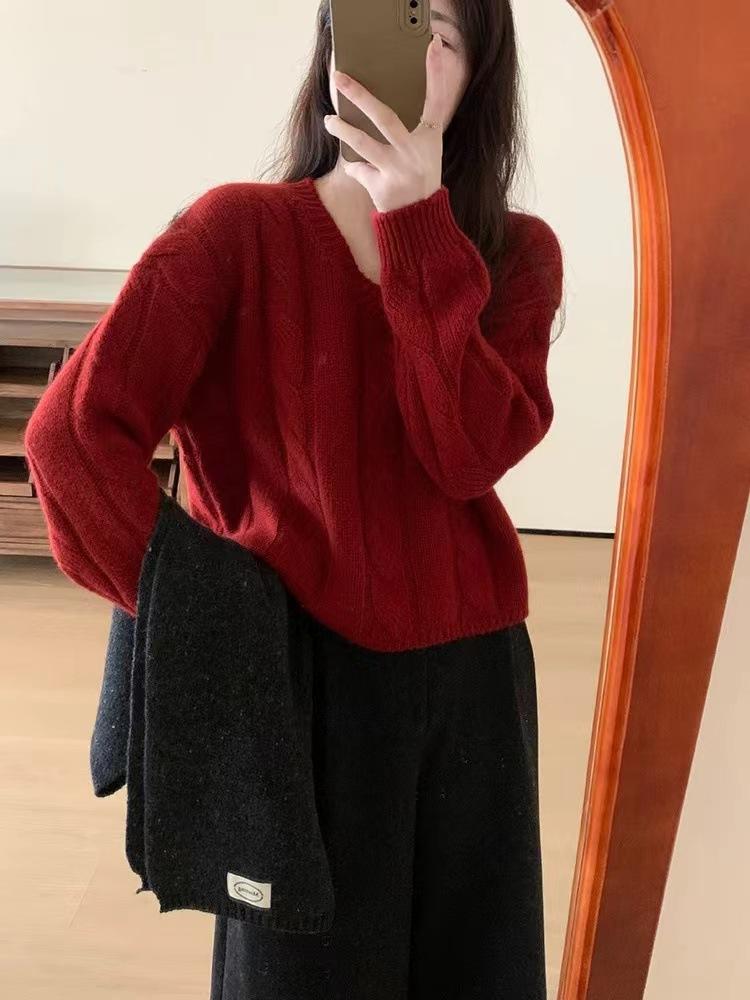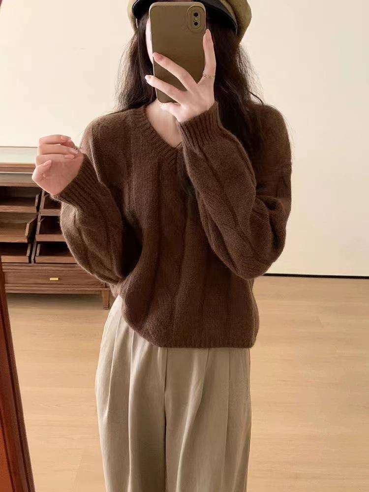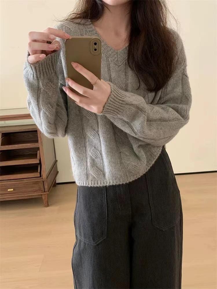 Suéter de lana pura con cuello en V corto estilo coreano para mujer, otoño e invierno, nuevo diseño, suéter holgado y perezoso, camisa de base de punto grueso