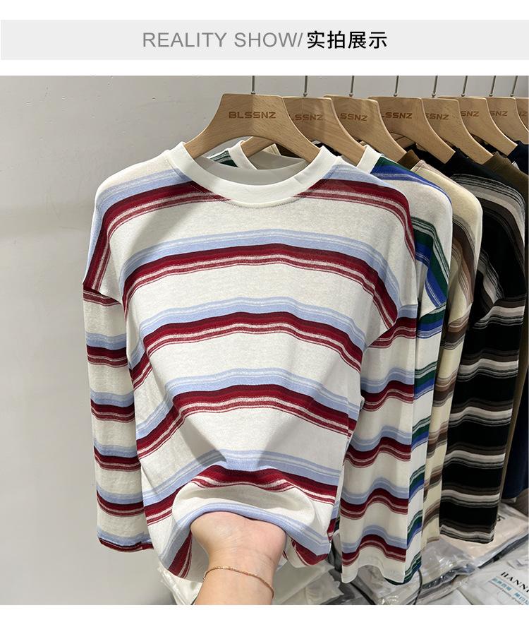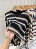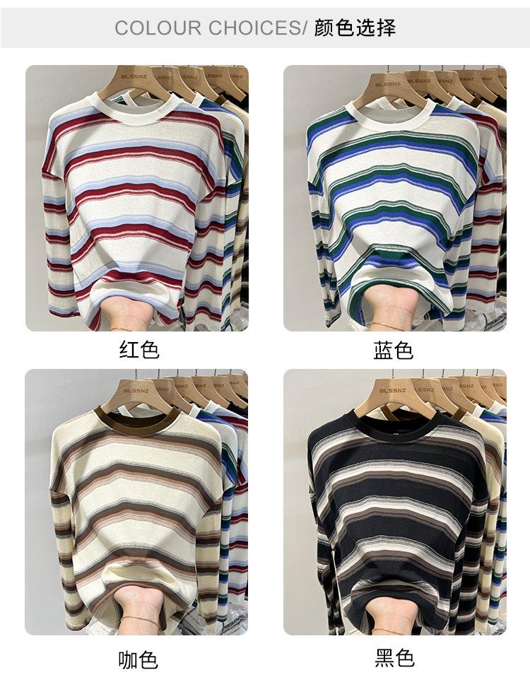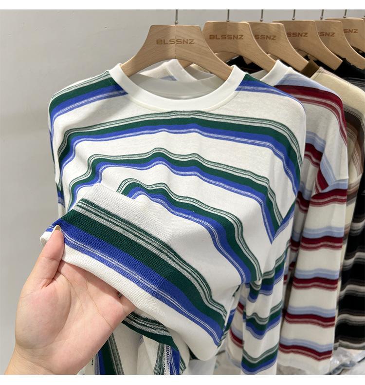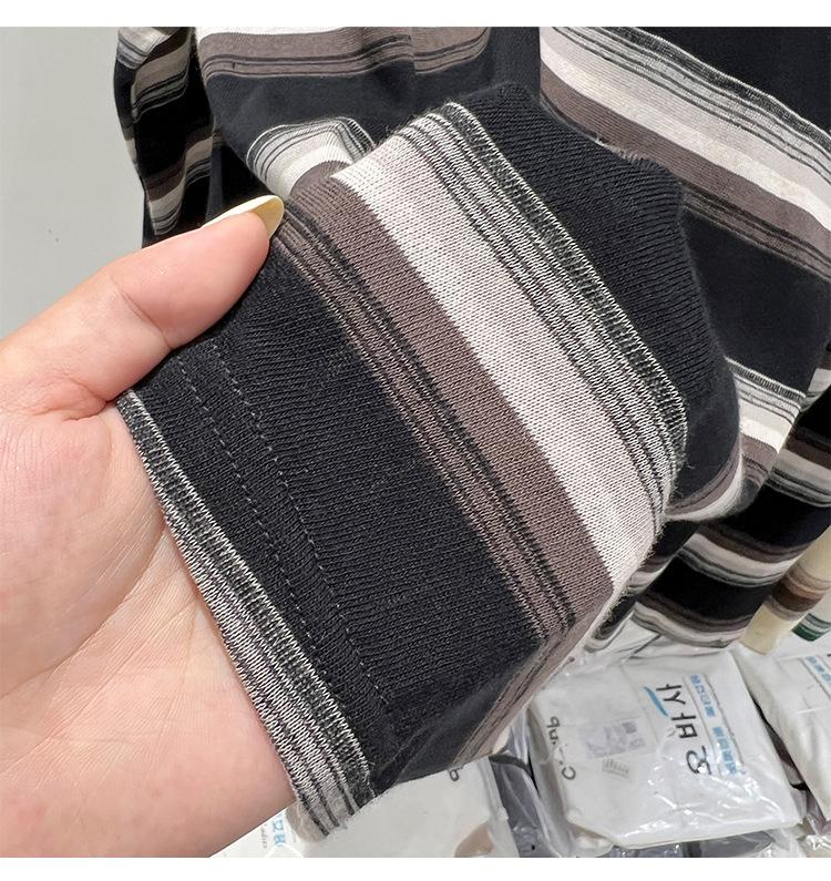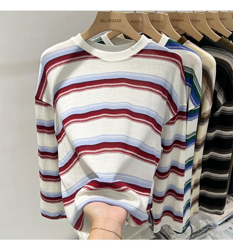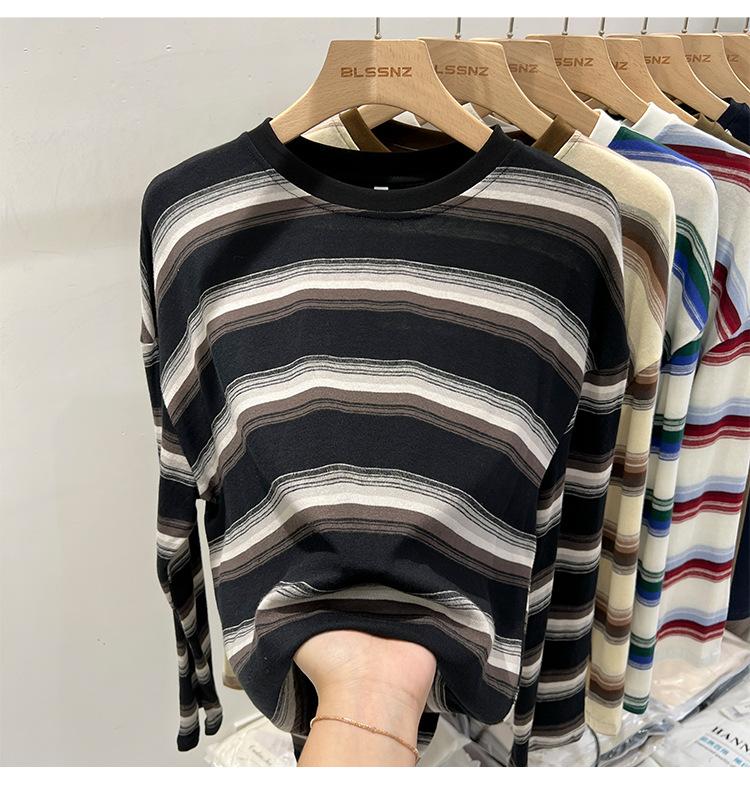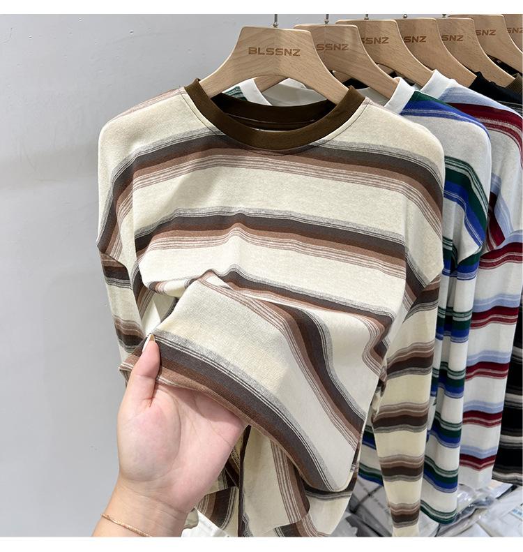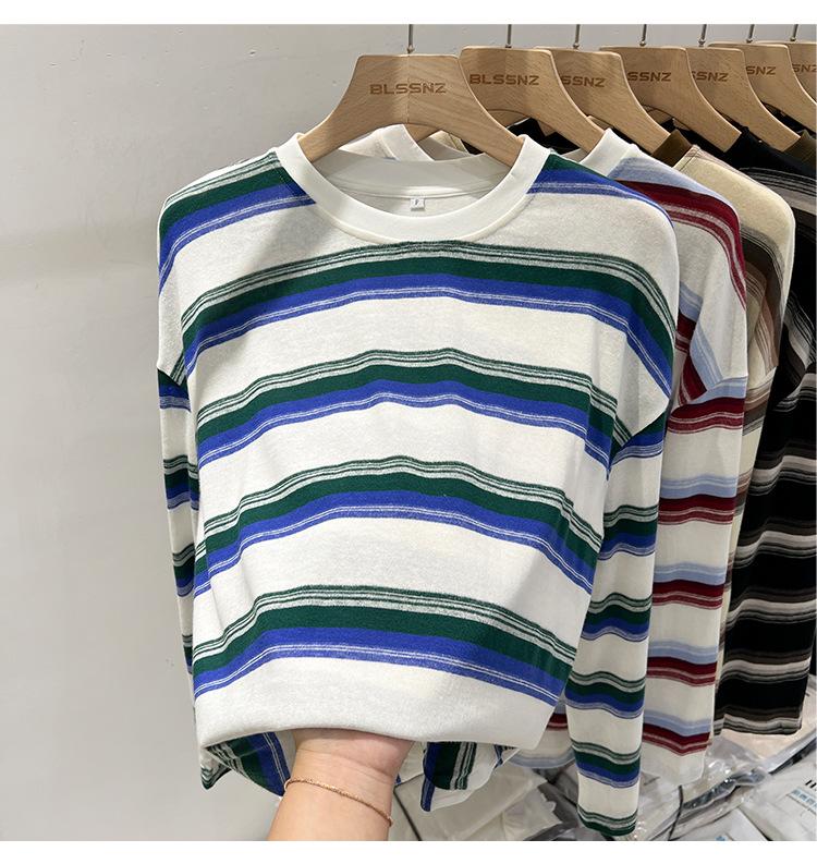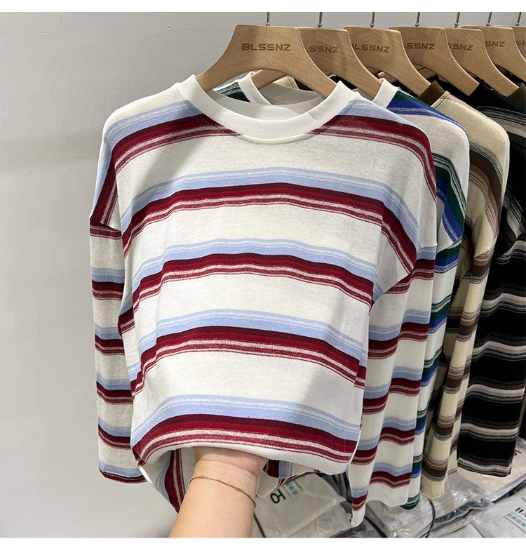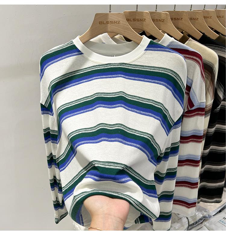 Camiseta de manga larga para mujer, estilo coreano, elegante, informal, holgada, con contraste de colores, a rayas, cuello redondo, estilo coreano, para principios de otoño de 2024
