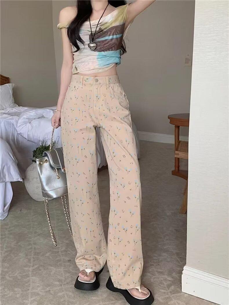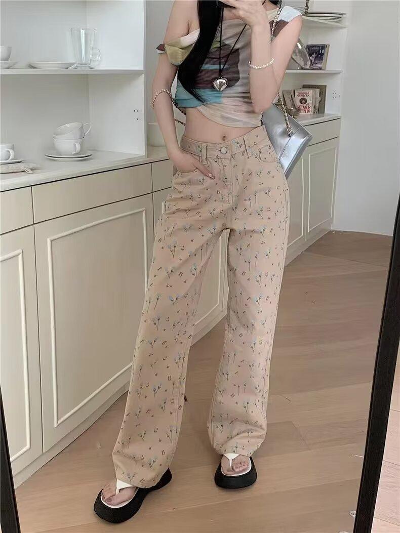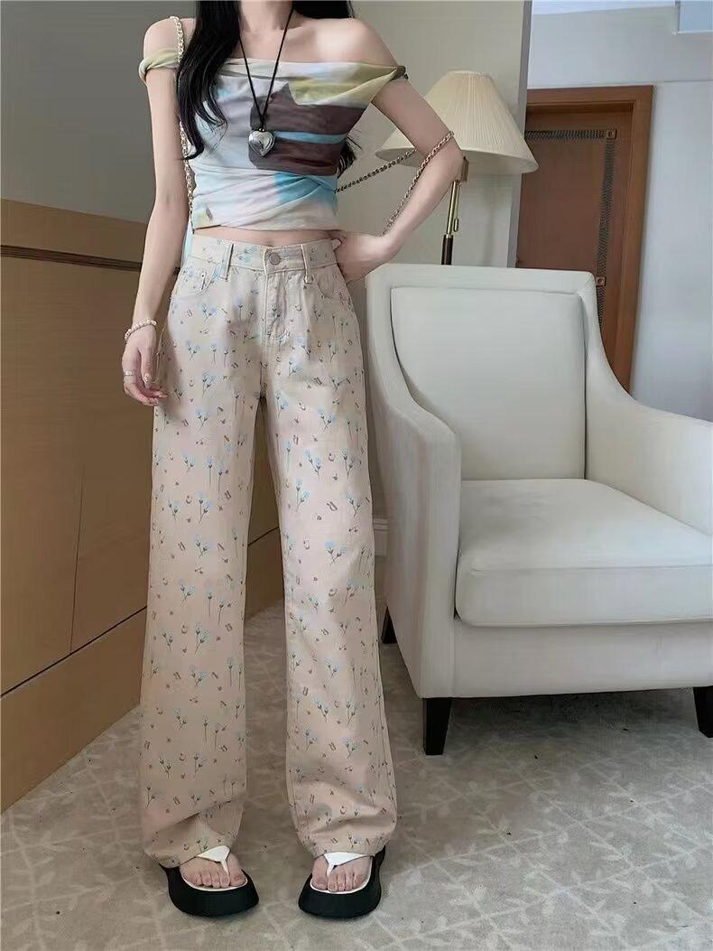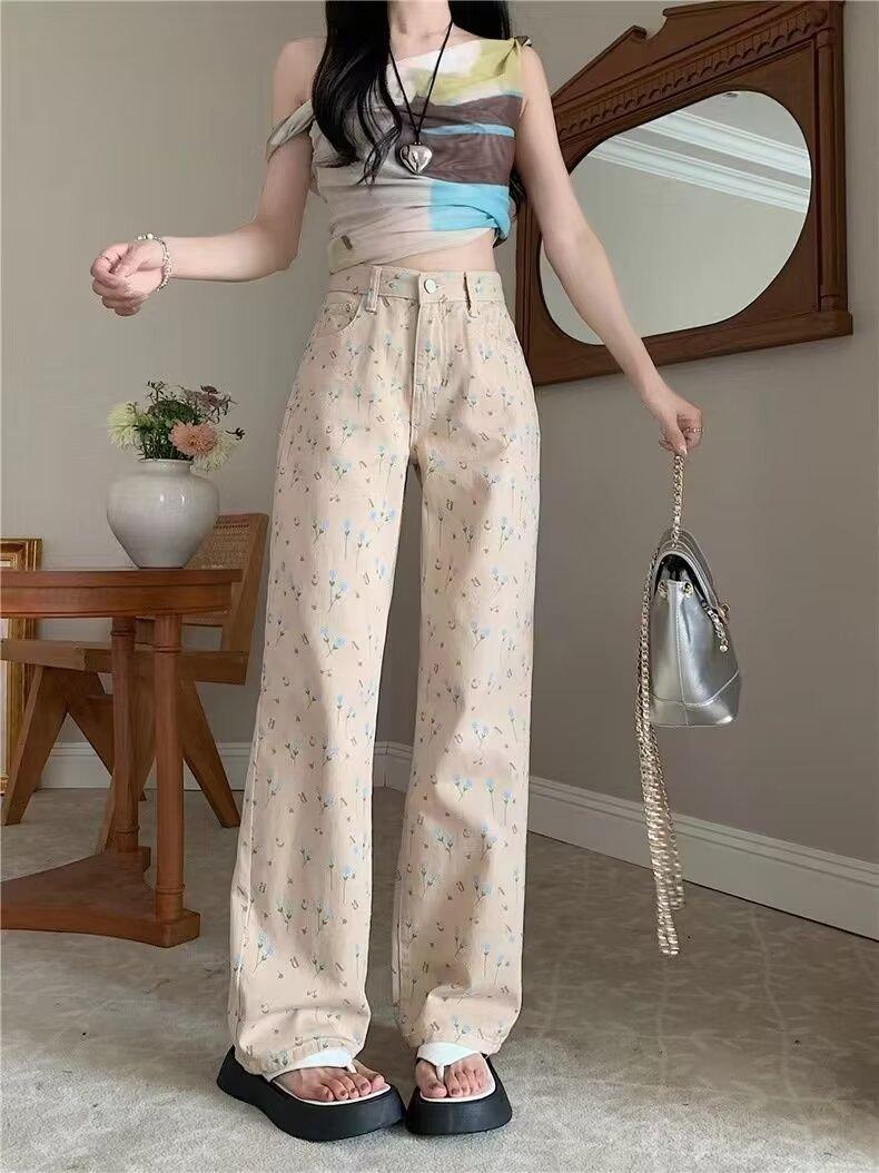 Pantalones vaqueros vintage de cintura alta con estampado floral para mujer, diseño nuevo, holgados, adelgazantes, de pierna ancha y rectos, informales, 2024