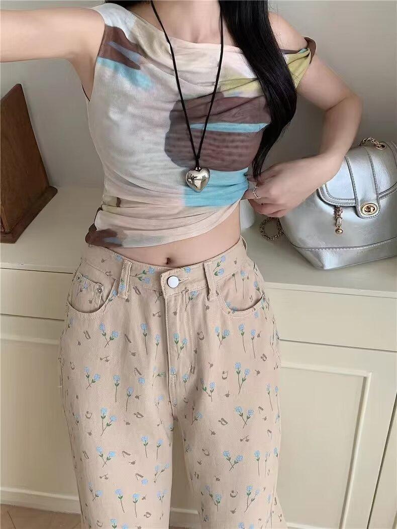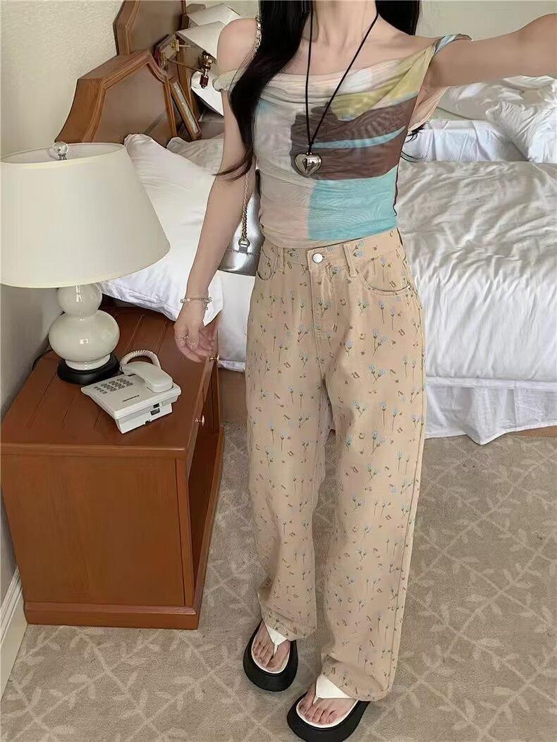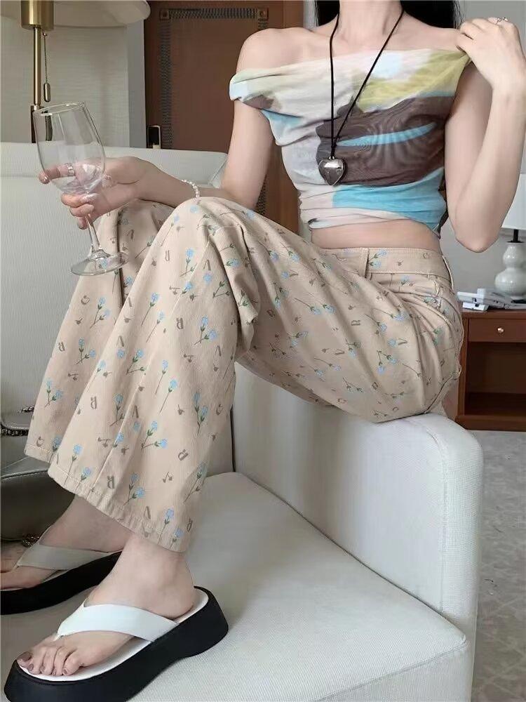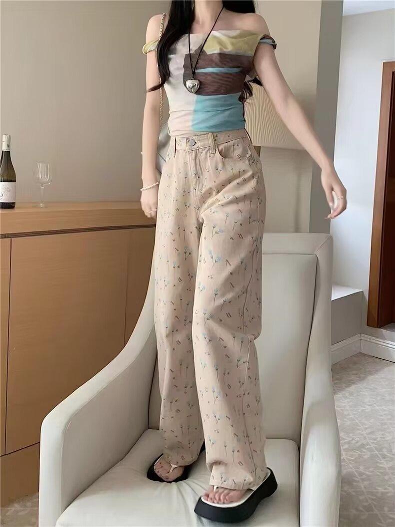 Pantalones vaqueros vintage de cintura alta con estampado floral para mujer, diseño nuevo, holgados, adelgazantes, de pierna ancha y rectos, informales, 2024