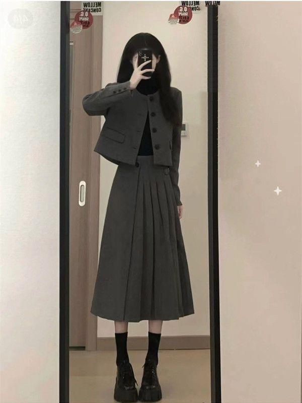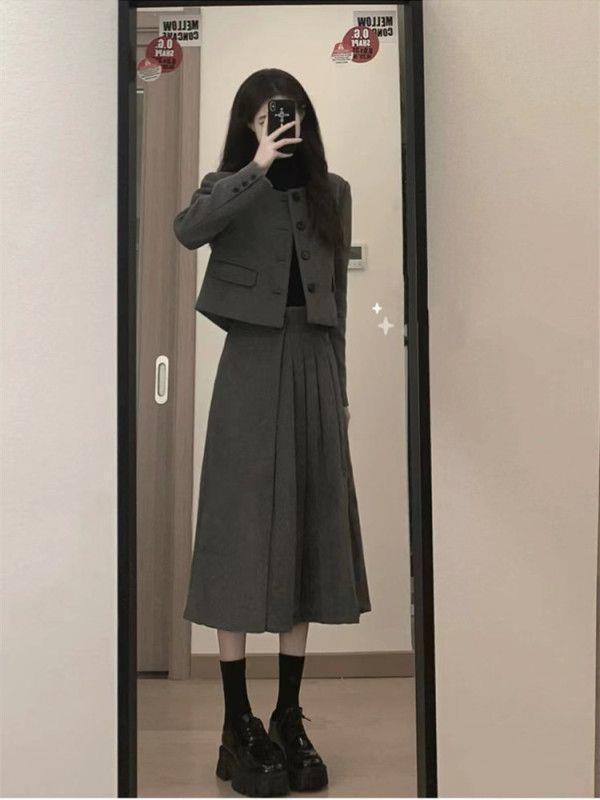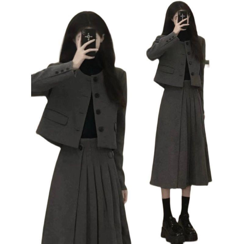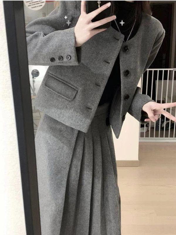 Vestido de Lana Nuevo Estilo Elegante Chaqueta Corta Falda para Mujer Conjunto de Dos Piezas