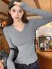 Camiseta básica ajustada con escote en V y contraste para mujer, camiseta de manga larga, otoño e invierno 2024, prenda exterior ajustada interior, top de alta gama.