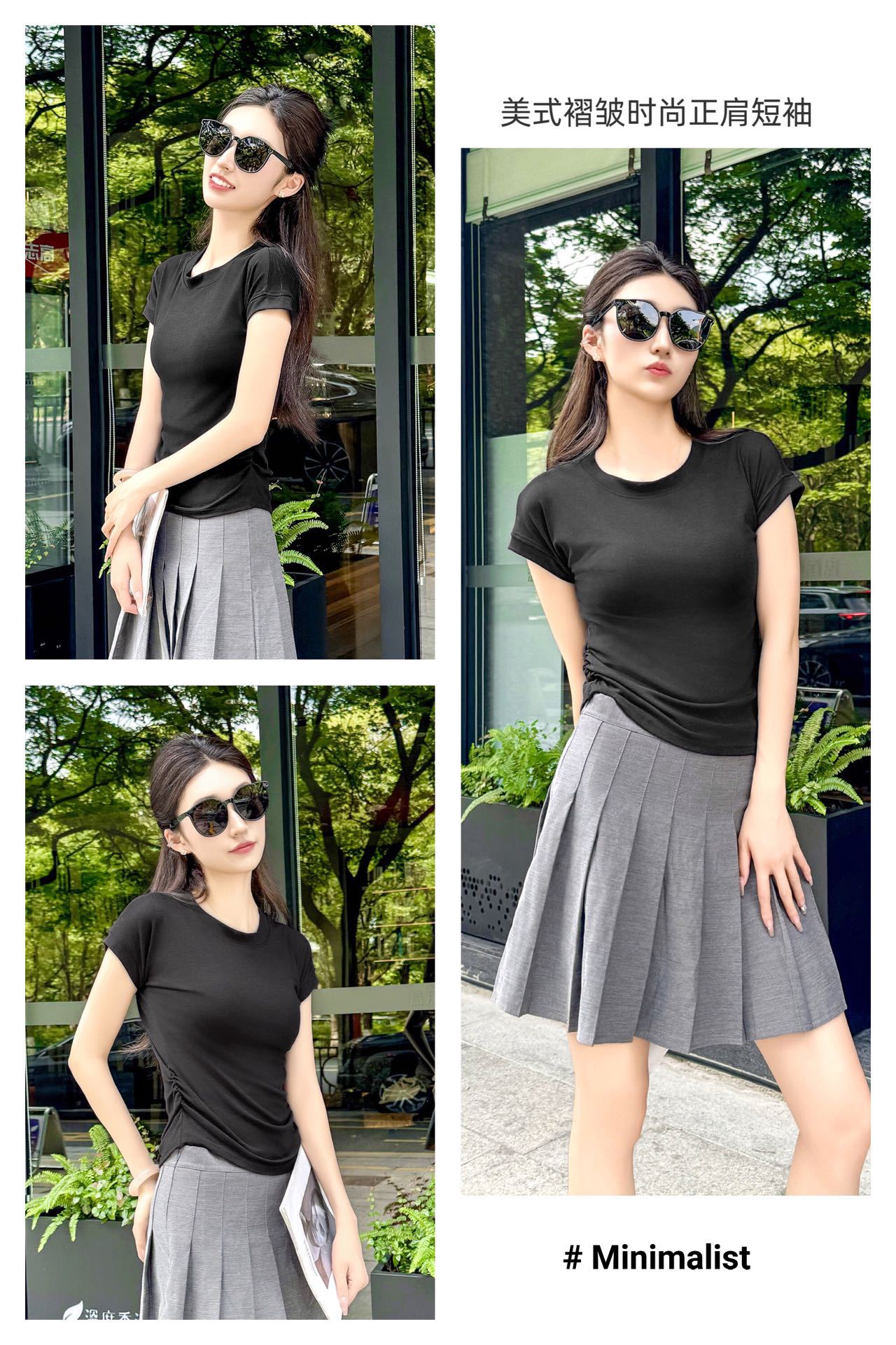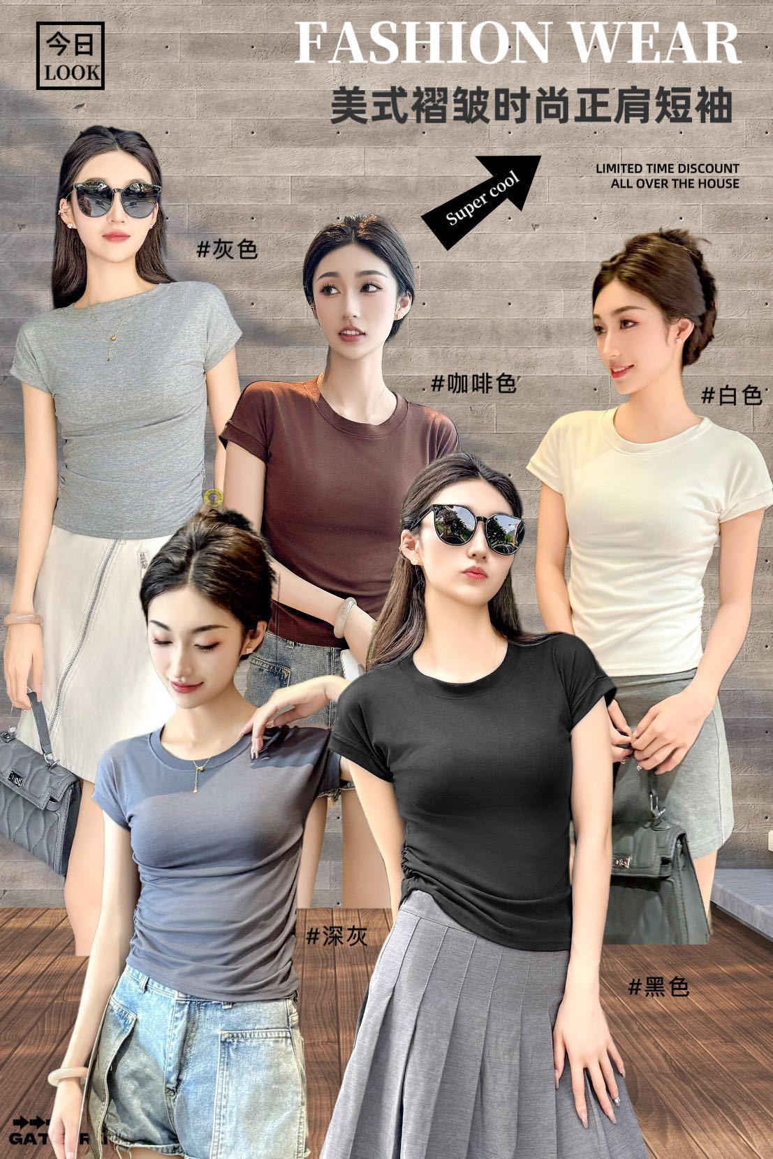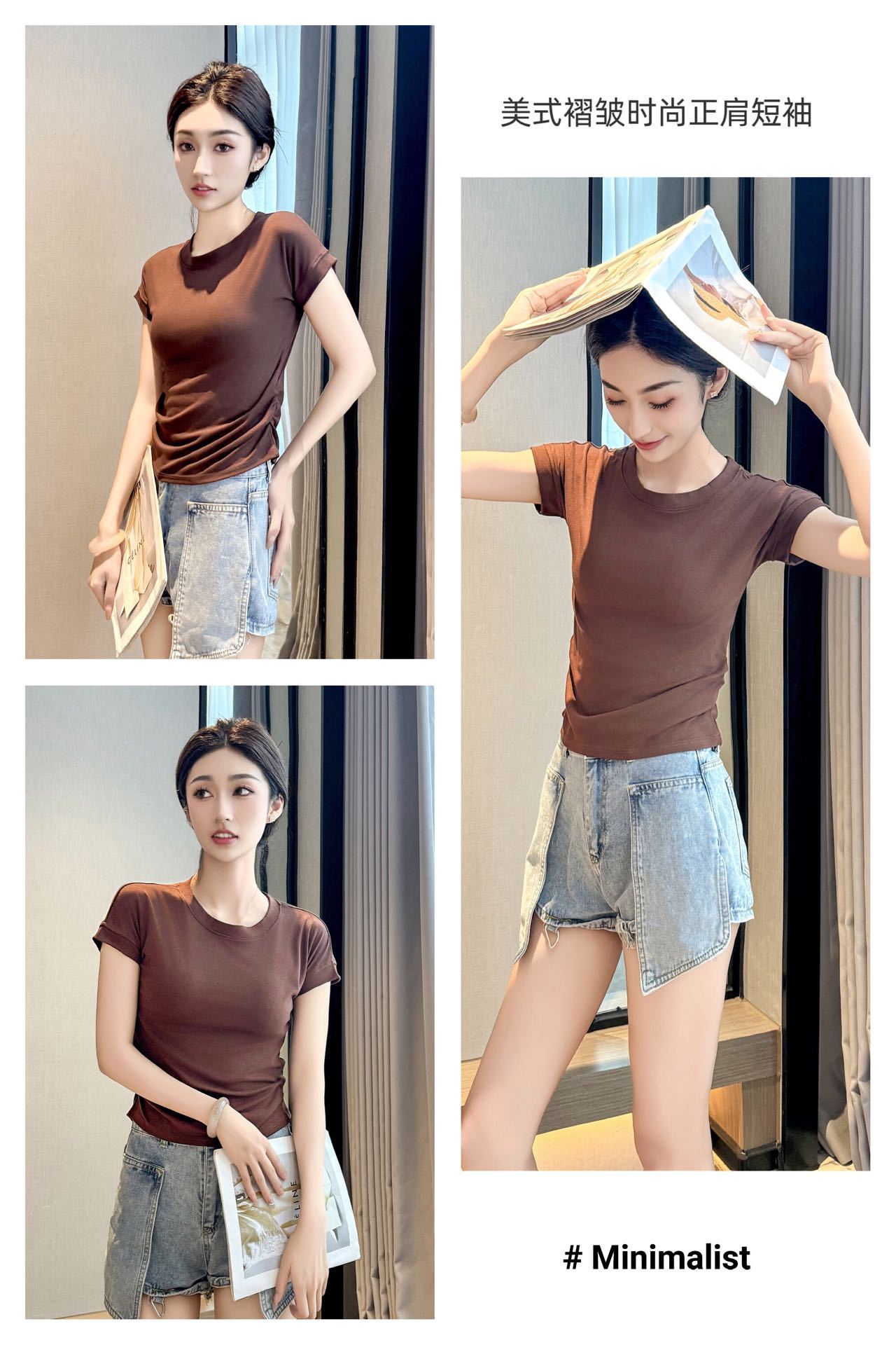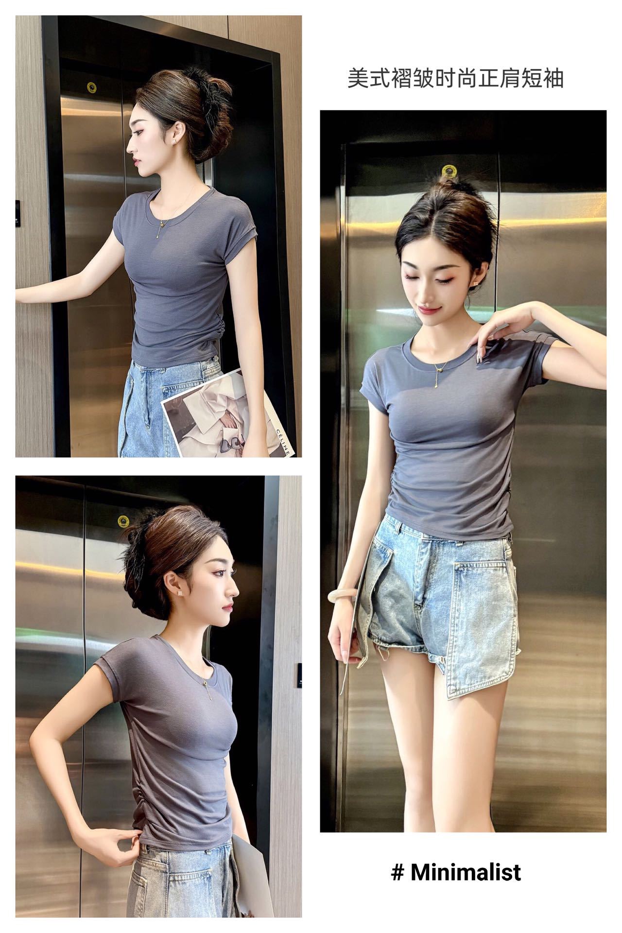 Camiseta de manga corta plisada con hombros descubiertos estilo americano para mujer, novedad de verano 2024, camiseta de manga corta con cola de milano y corte entallado para mujer