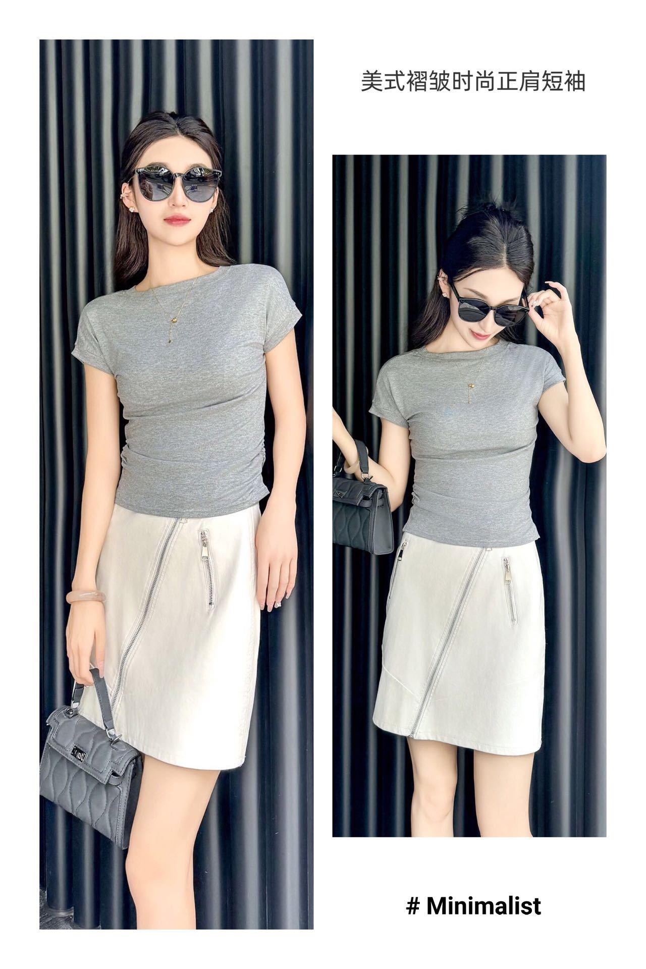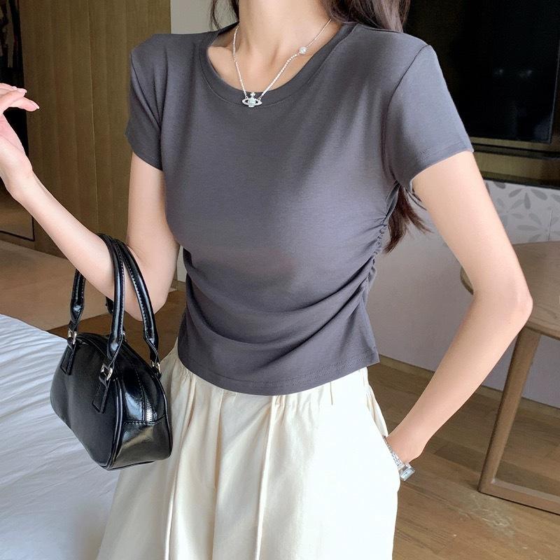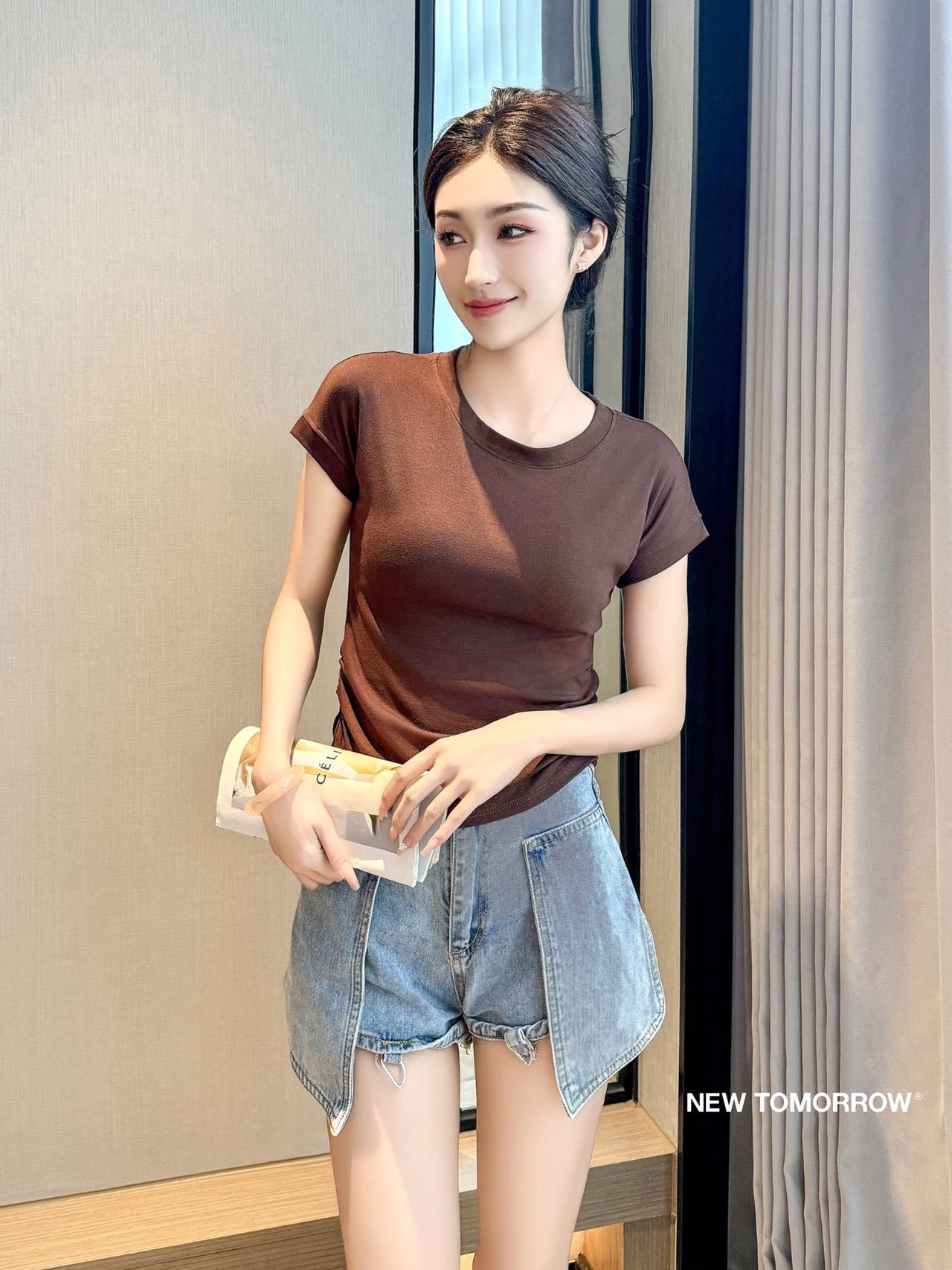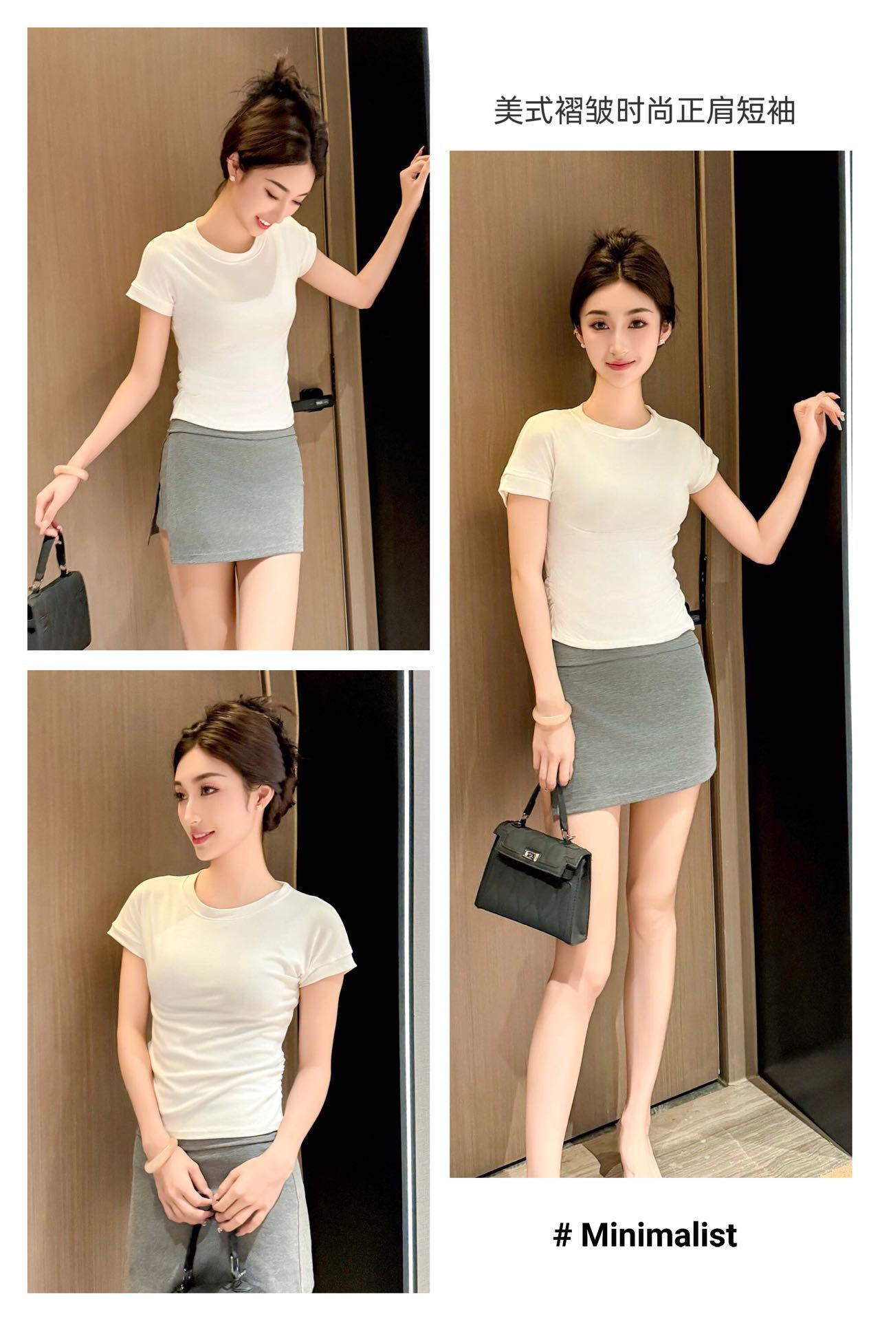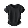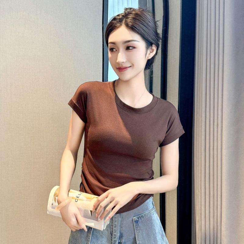 Camiseta de manga corta plisada con hombros descubiertos estilo americano para mujer, novedad de verano 2024, camiseta de manga corta con cola de milano y corte entallado para mujer