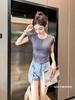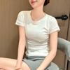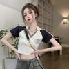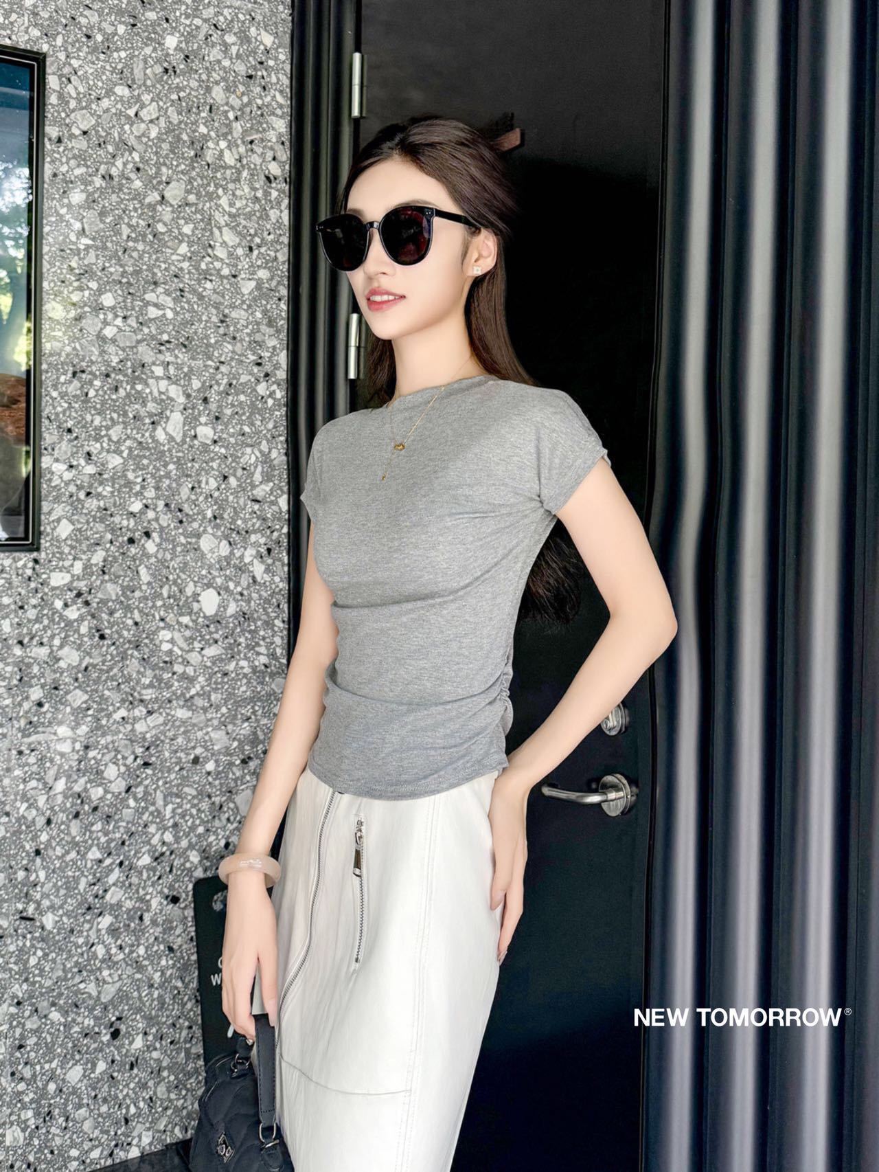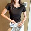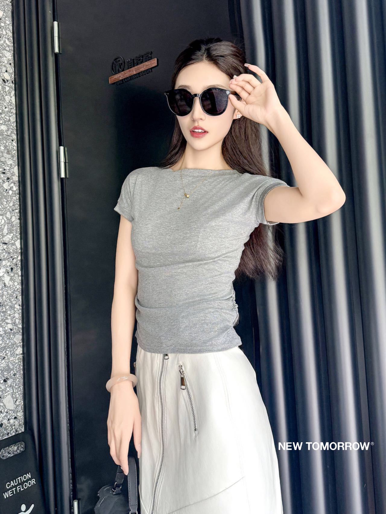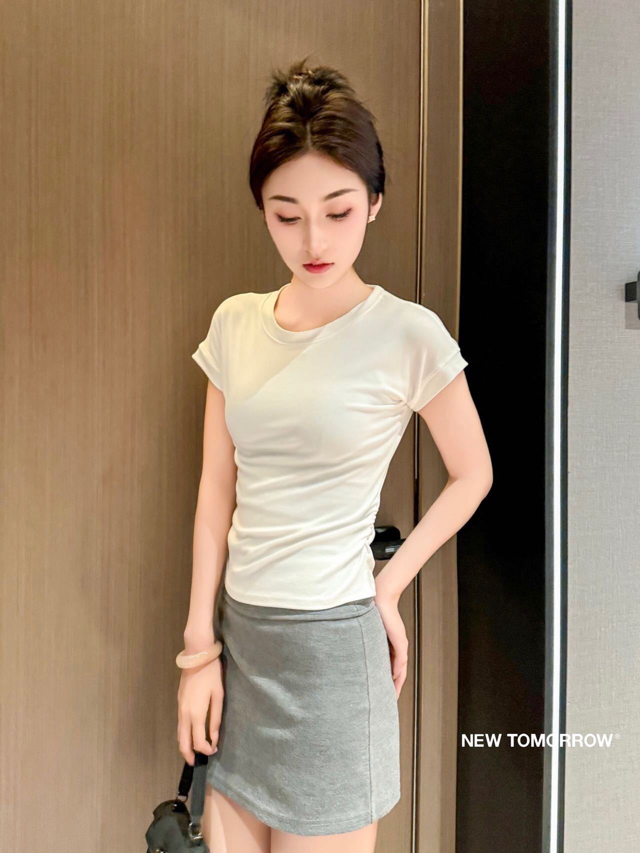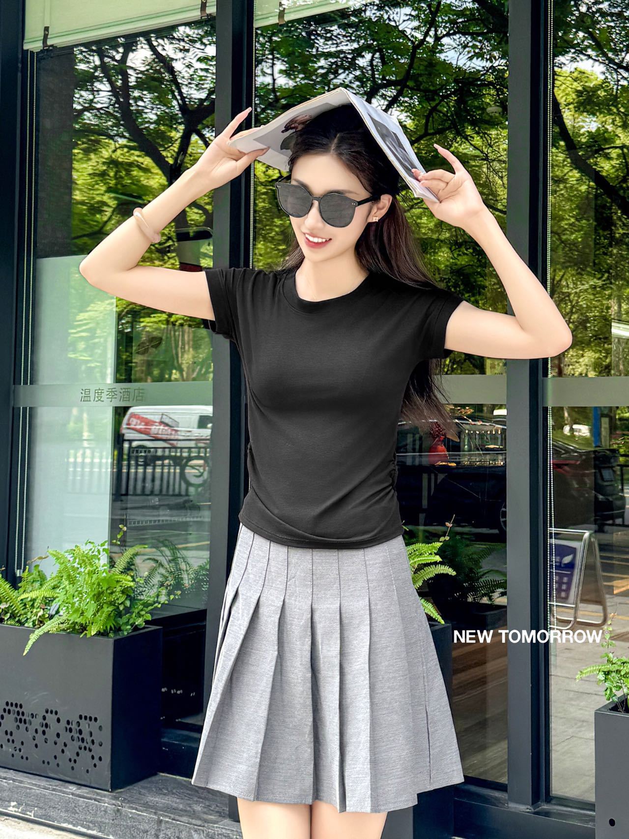 Camiseta de manga corta plisada con hombros descubiertos estilo americano para mujer, novedad de verano 2024, camiseta de manga corta con cola de milano y corte entallado para mujer