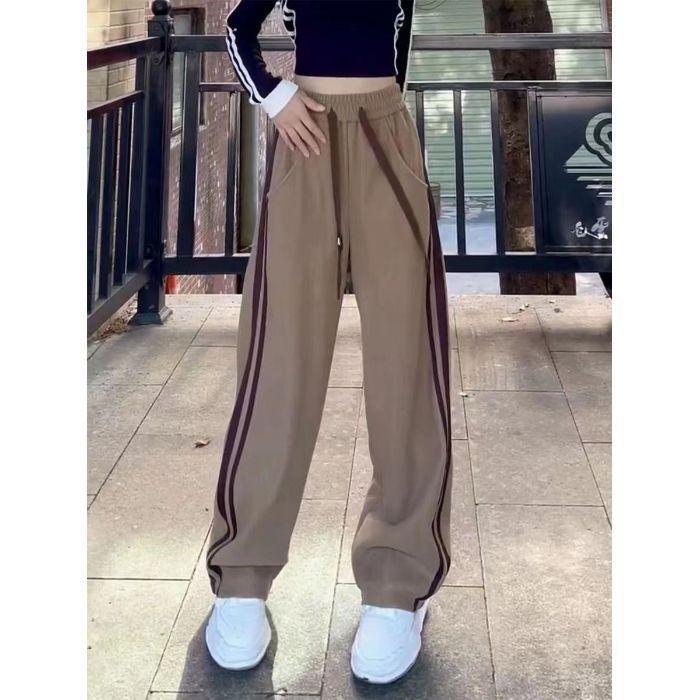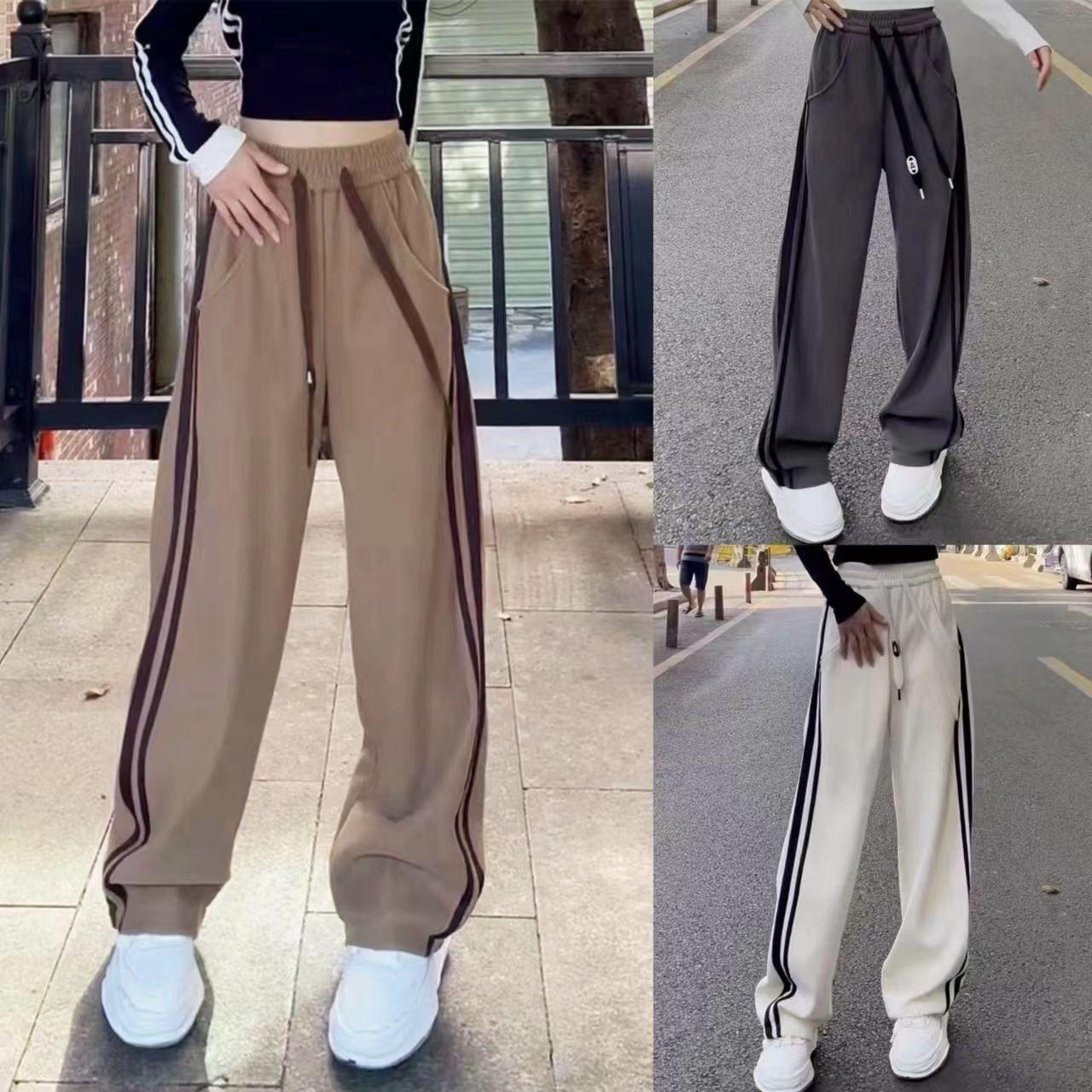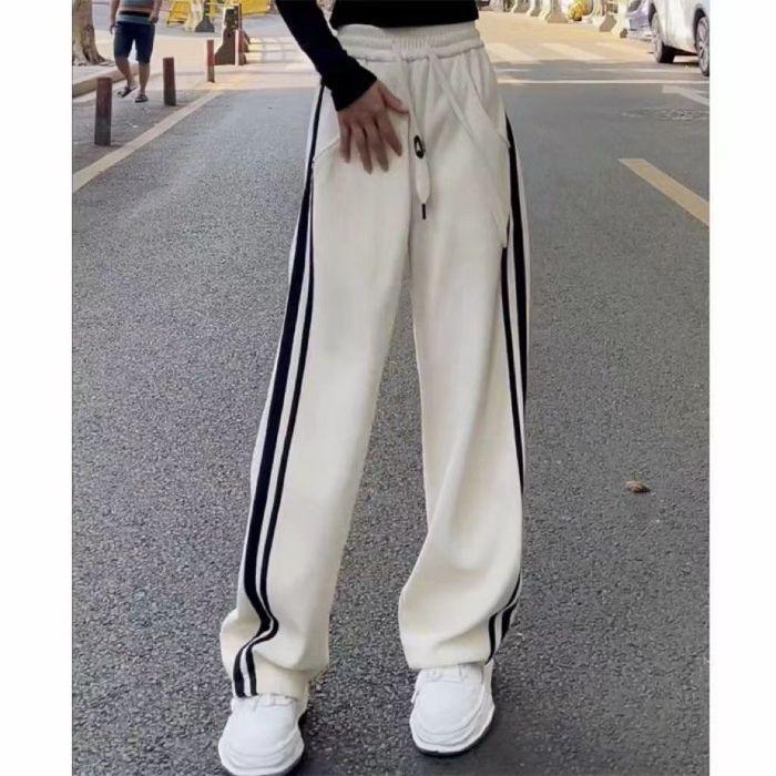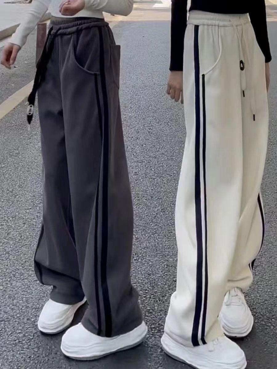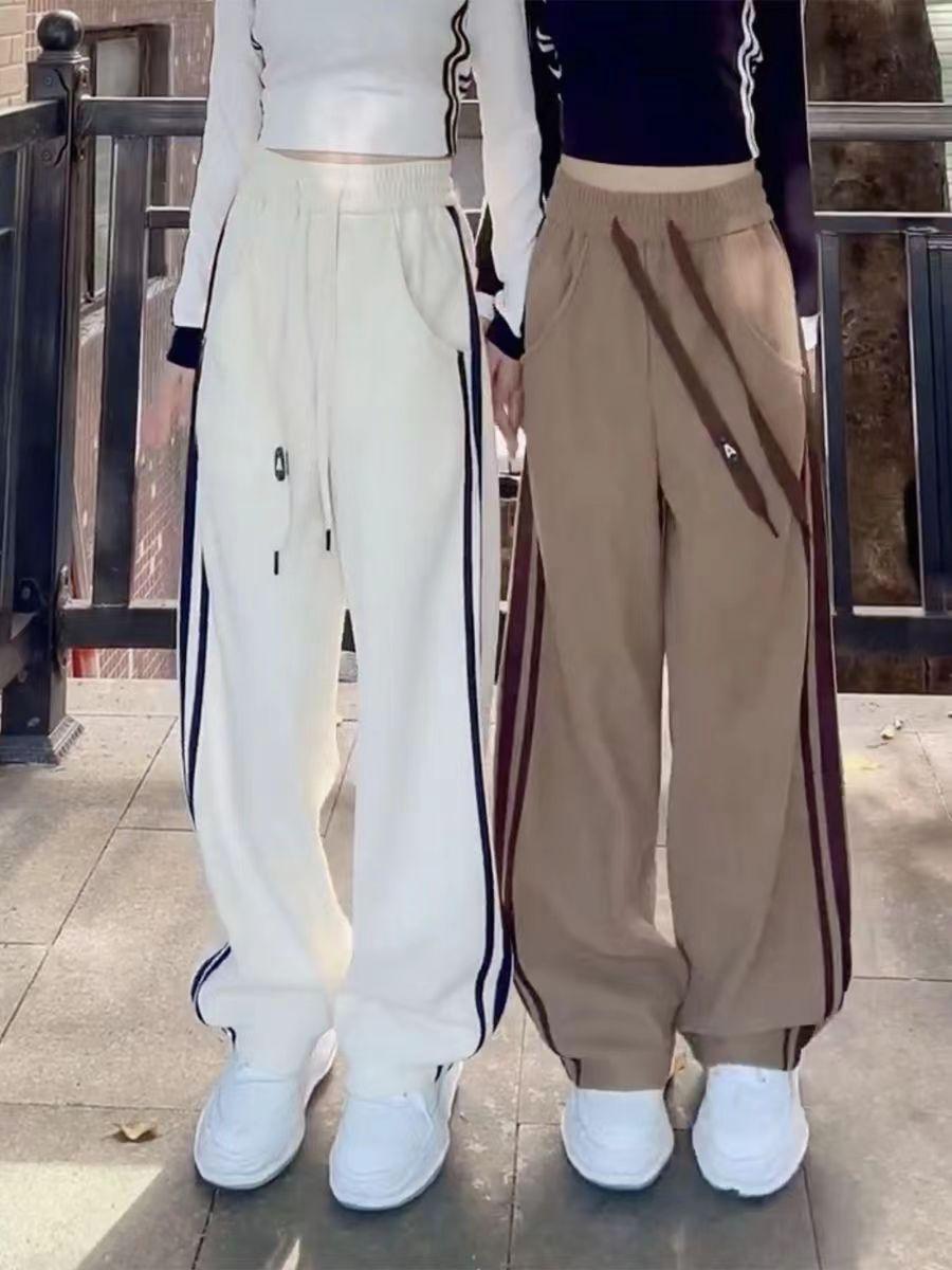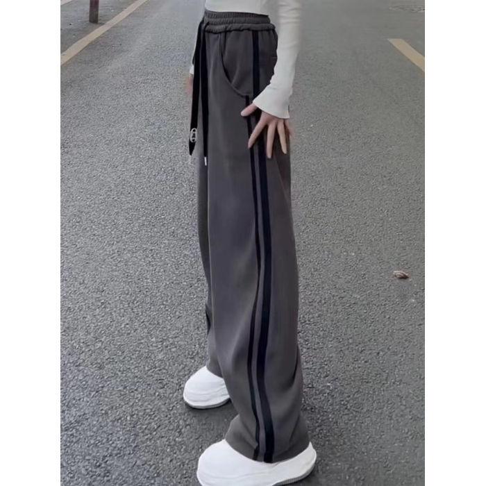 Pantalones casuales de otoño e invierno para mujer, pantalones deportivos ajustados de cintura alta de talla grande, pantalones de pierna ancha y alta con forro polar a rayas de estilo coreano
