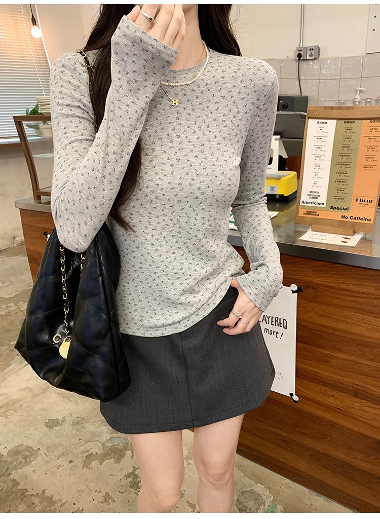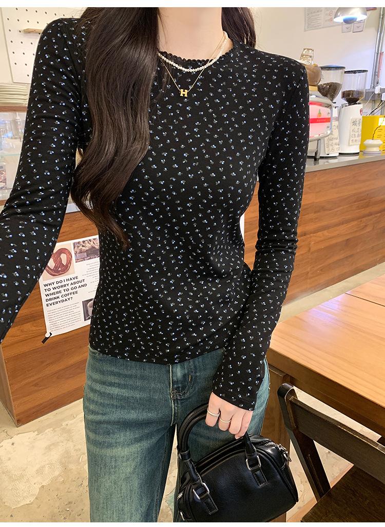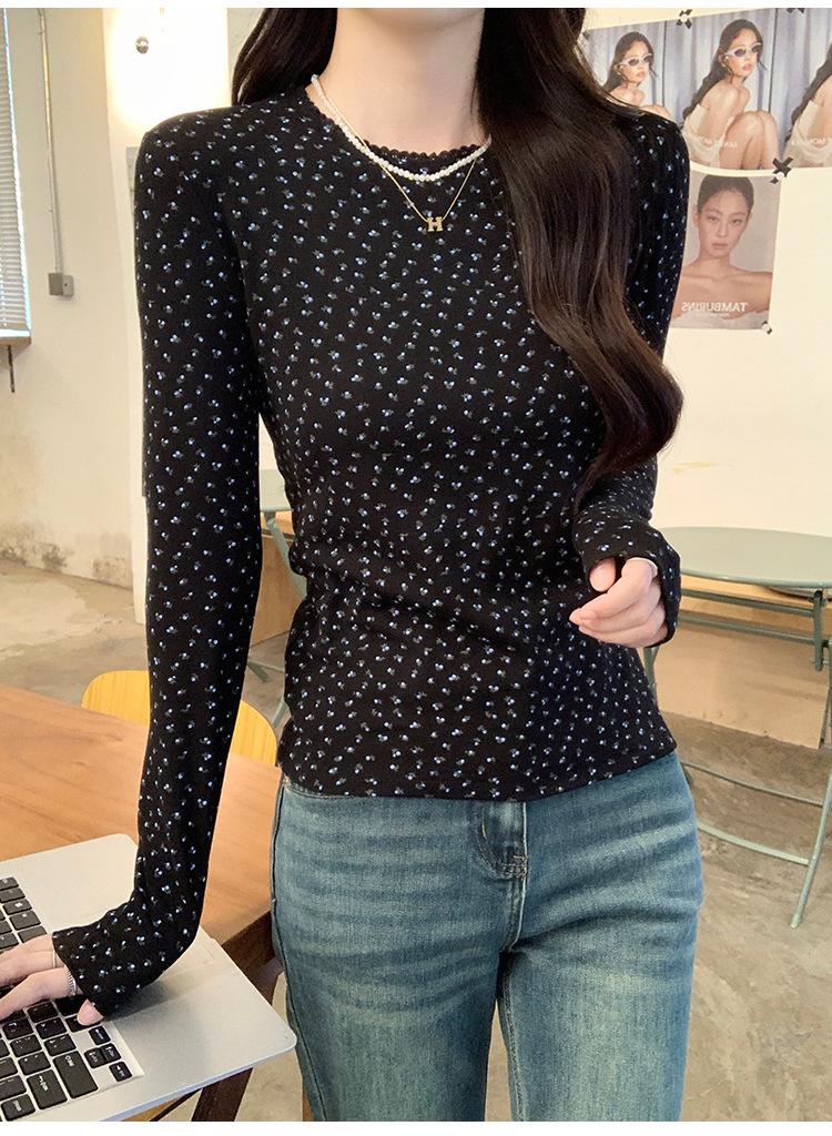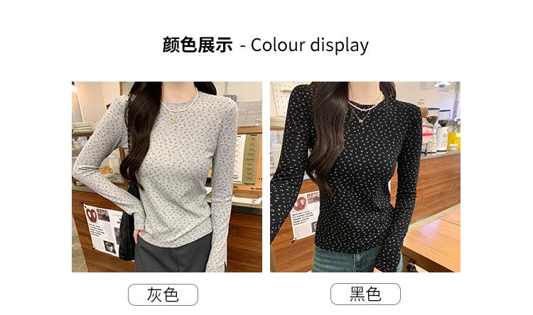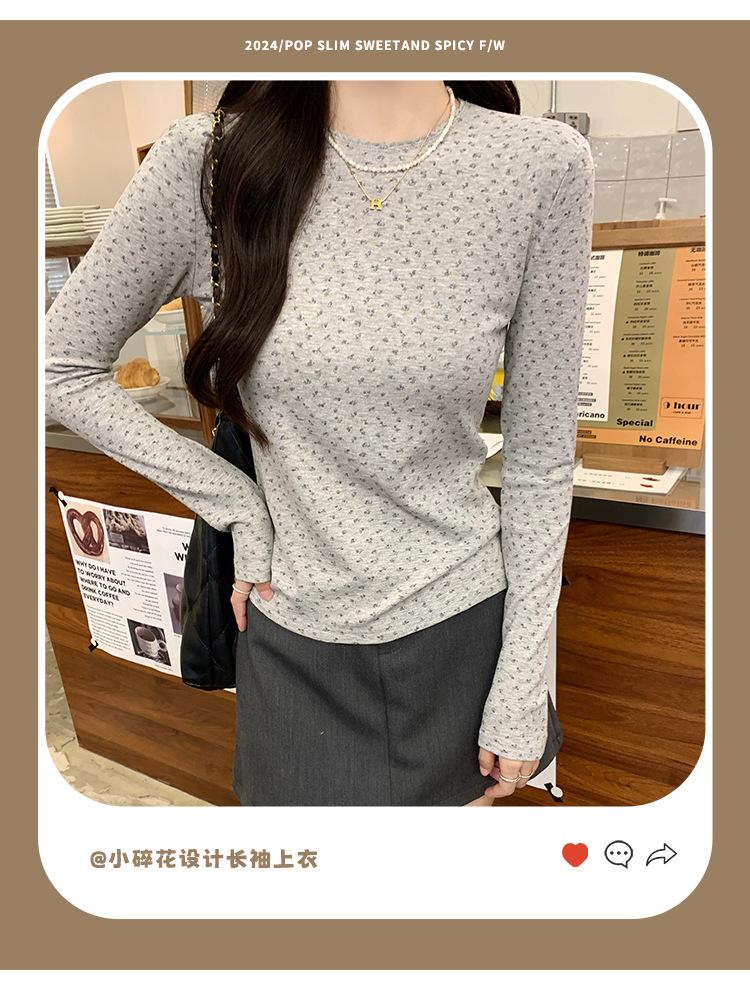 Camiseta de algodón ajustada con hombros descubiertos y estampado floral pequeño estilo coreano, nueva camiseta de manga larga con cuello redondo para mujer, otoño 2024