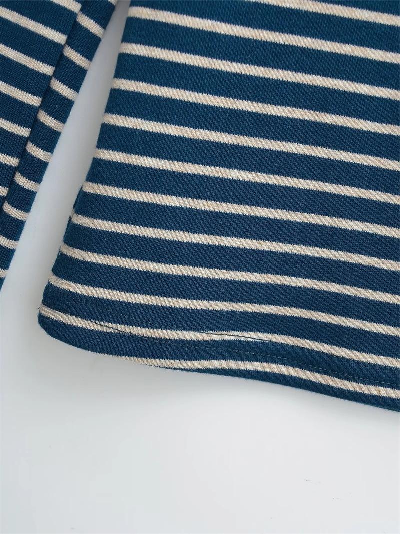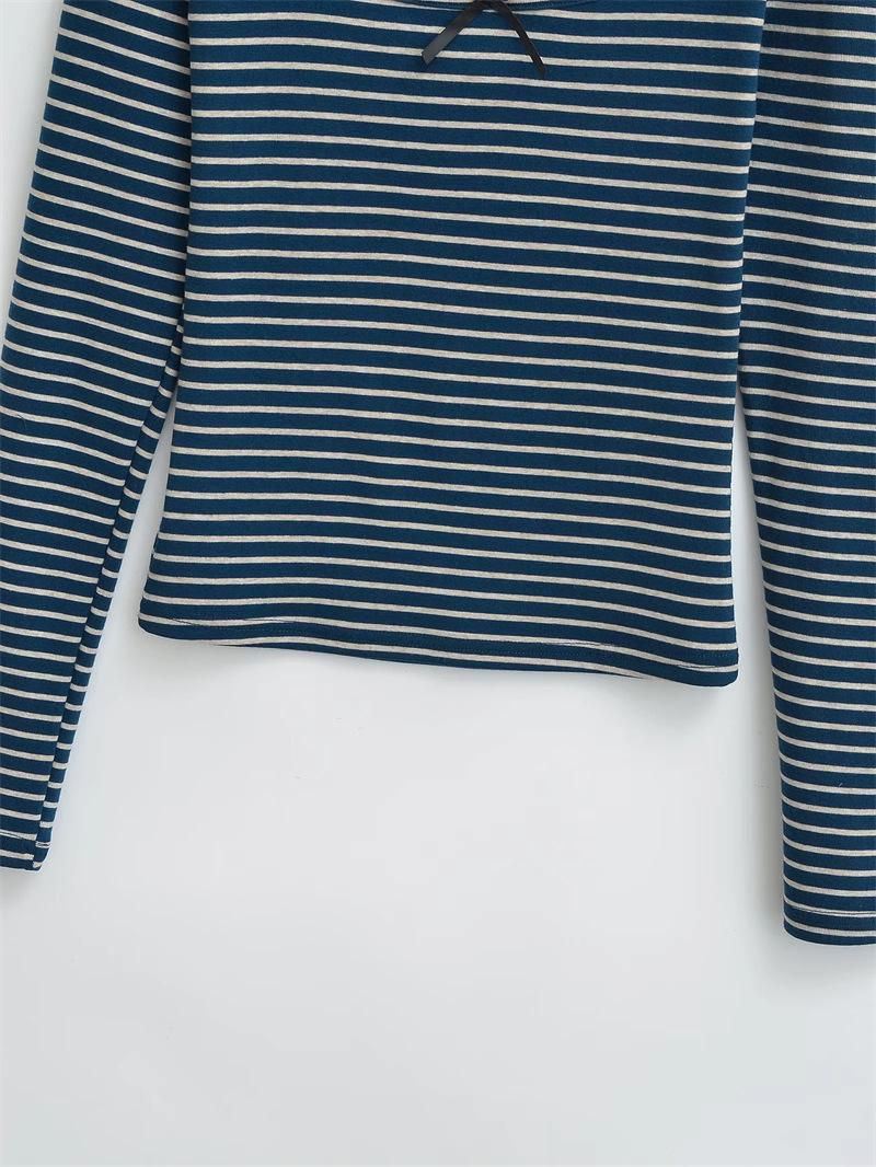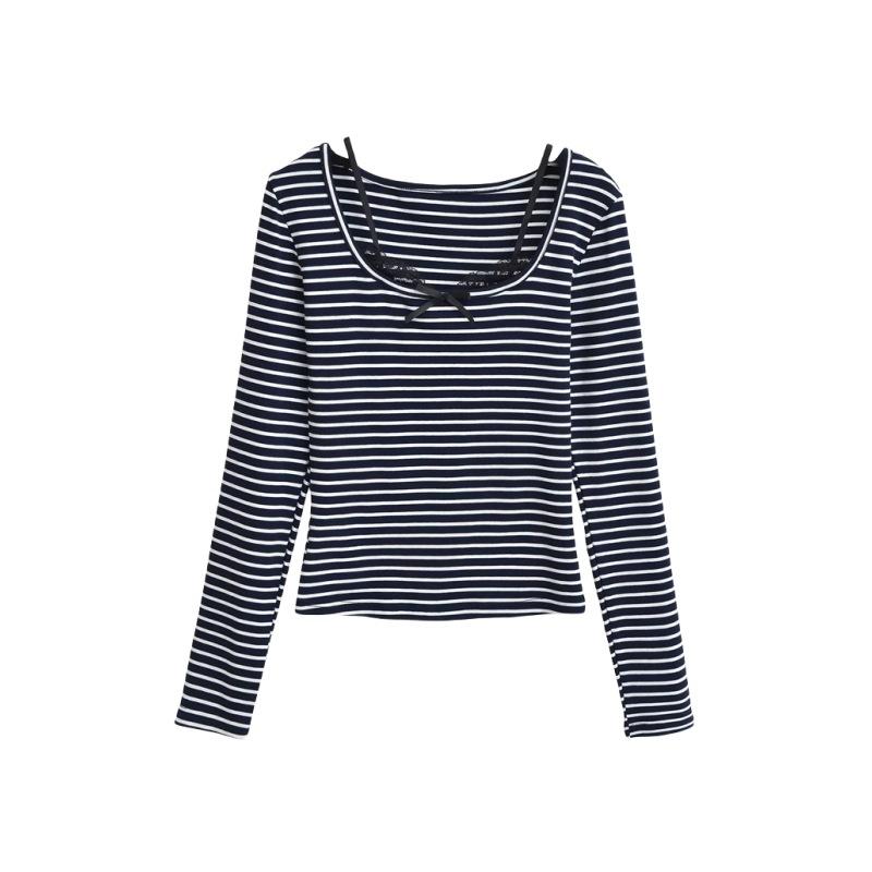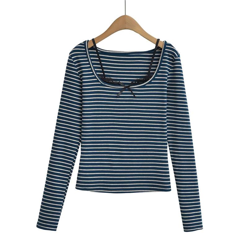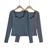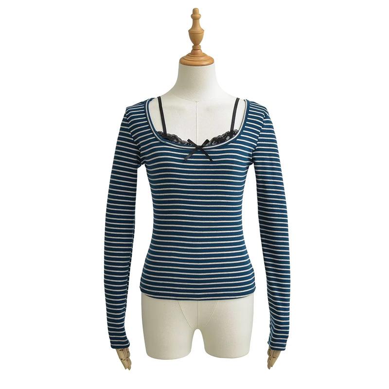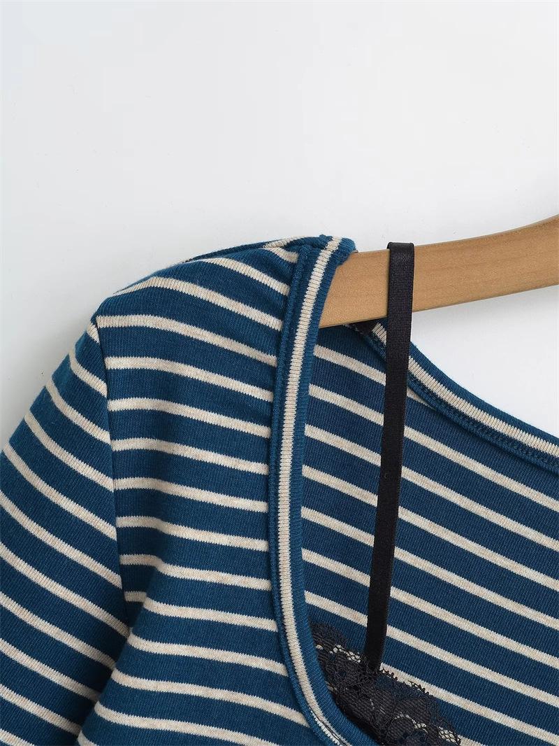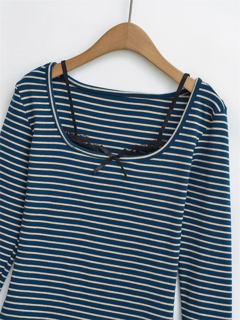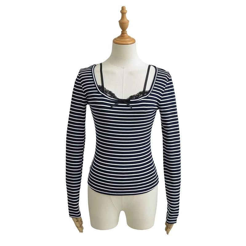 Camiseta de manga larga de dos piezas con diseño de nicho, estilo americano, con costuras de encaje retro, a rayas y corte entallado.