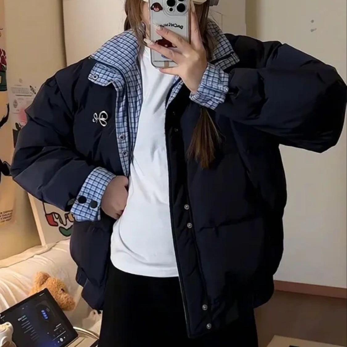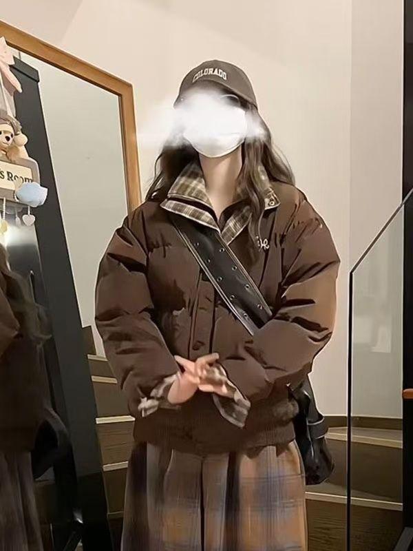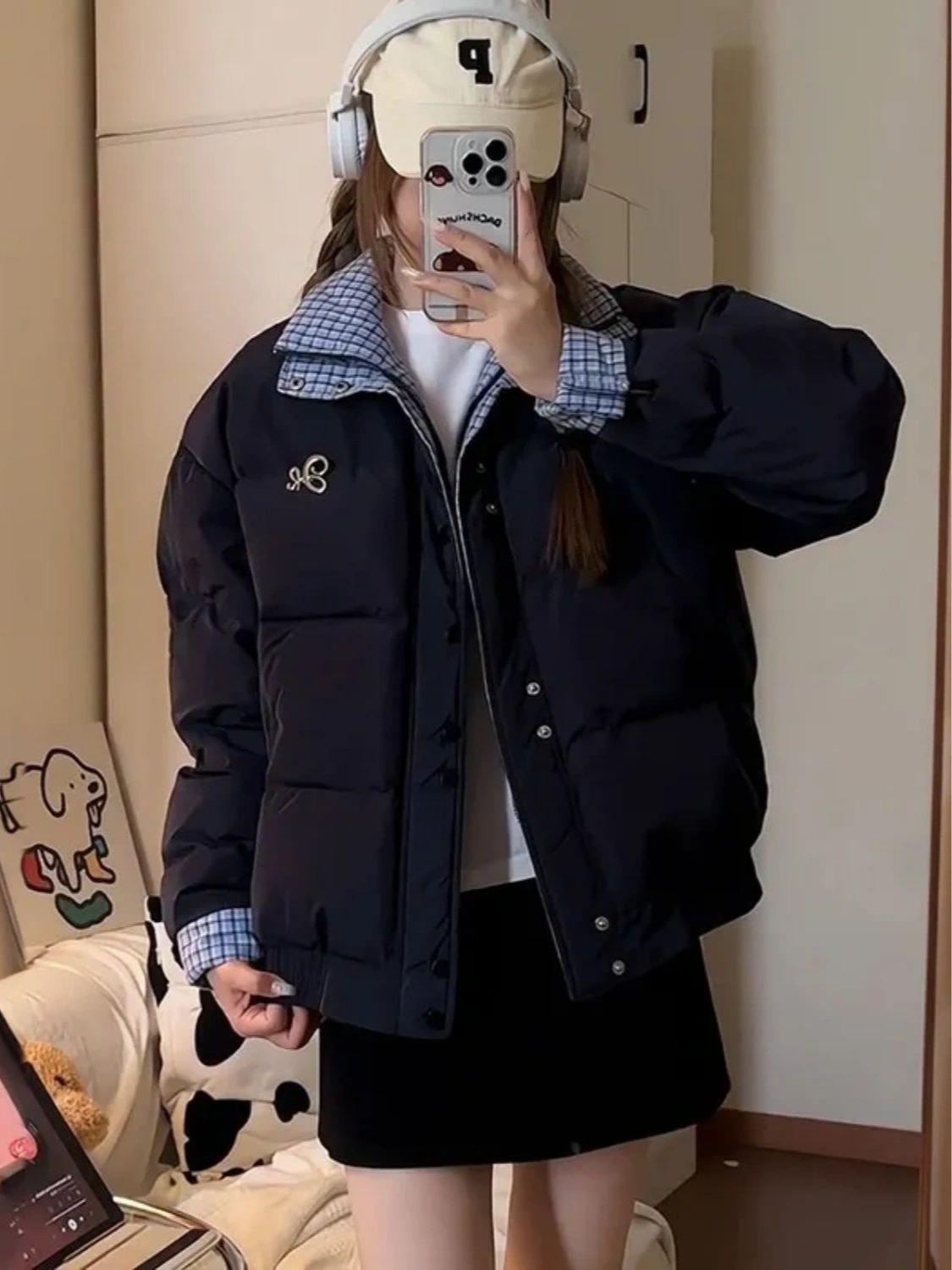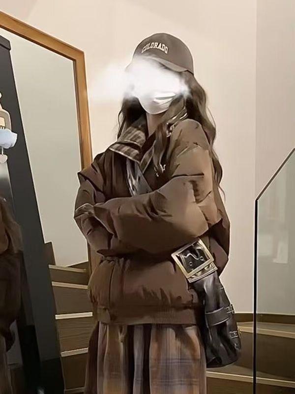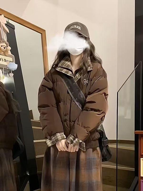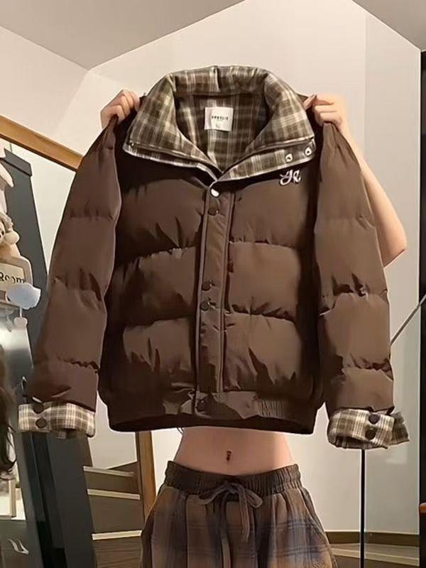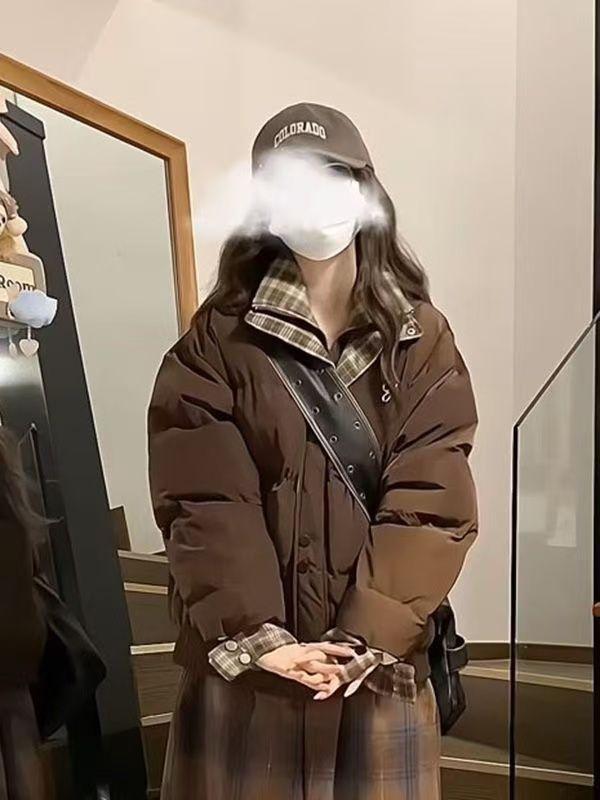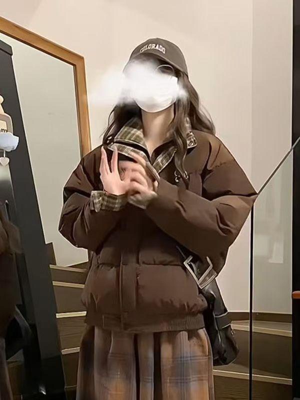 Abrigo acolchado de algodón con cuello doble y cuadros retro con costuras de estilo coreano para mujer, nuevo traje de invierno de dos piezas falso que combina con todo, cálido