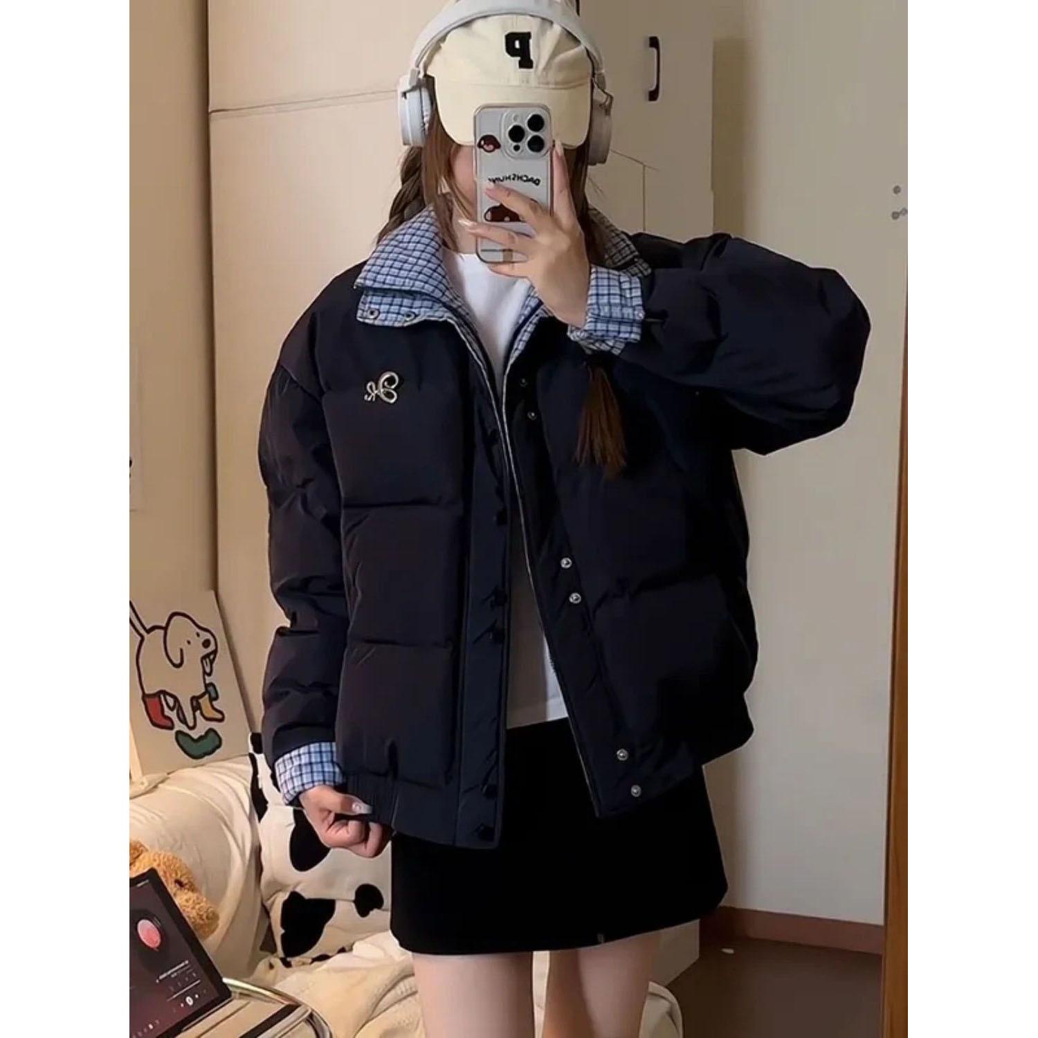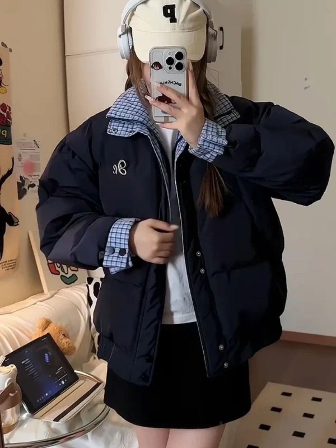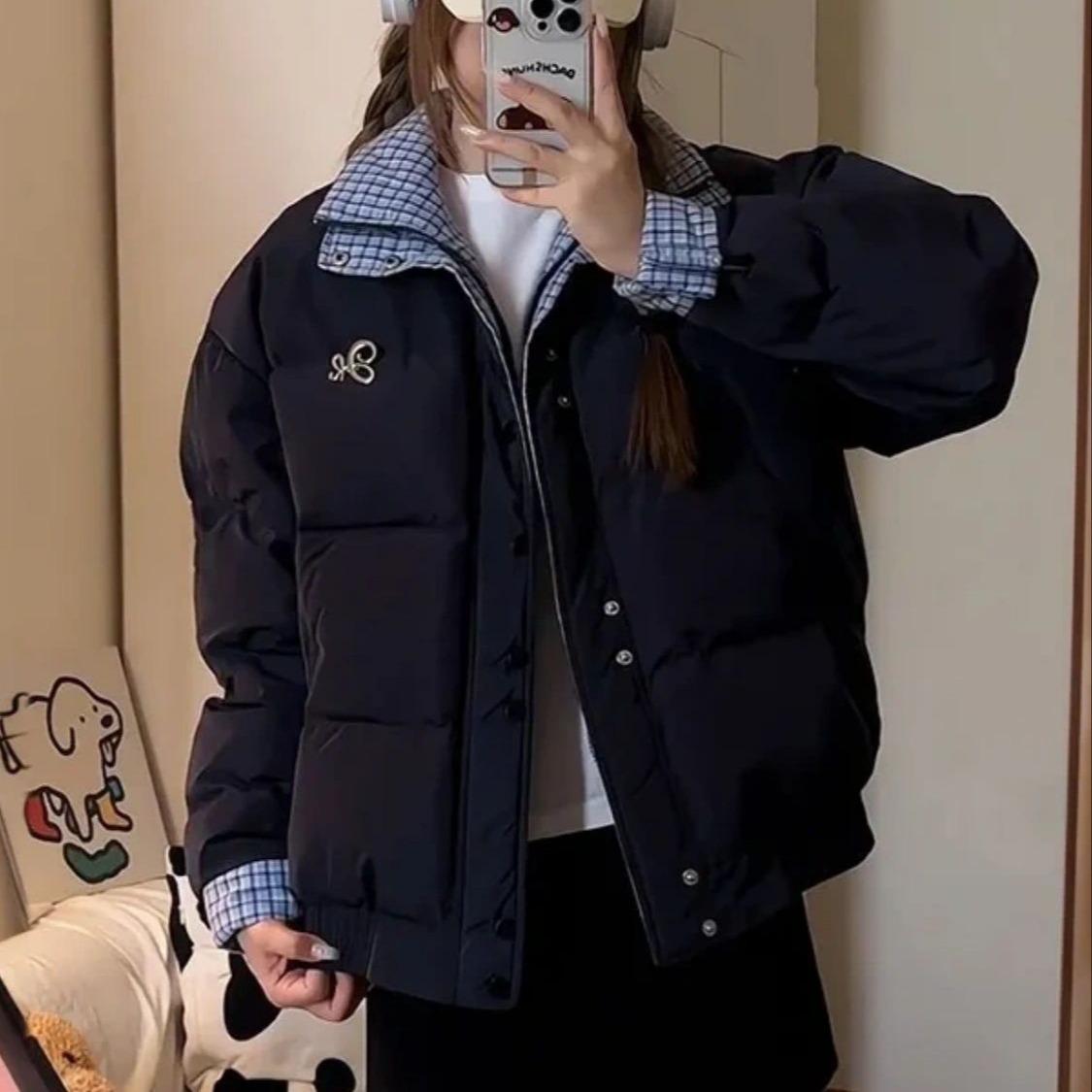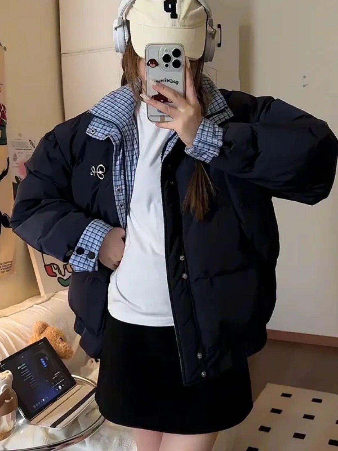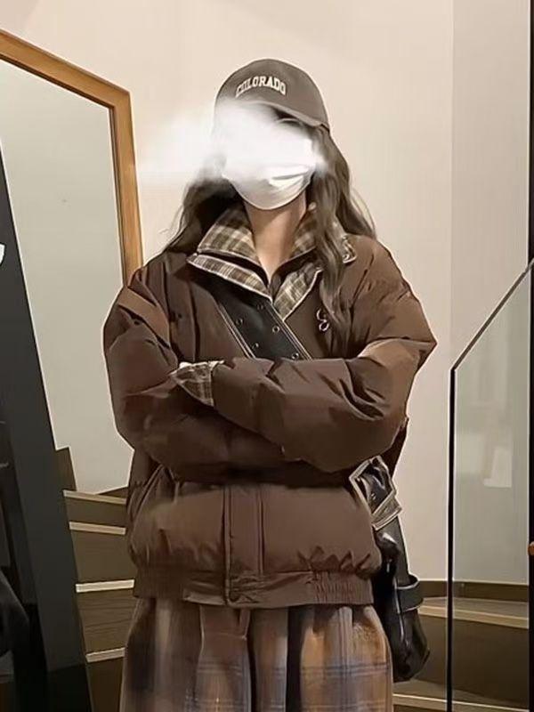 Abrigo acolchado de algodón con cuello doble y cuadros retro con costuras de estilo coreano para mujer, nuevo traje de invierno de dos piezas falso que combina con todo, cálido