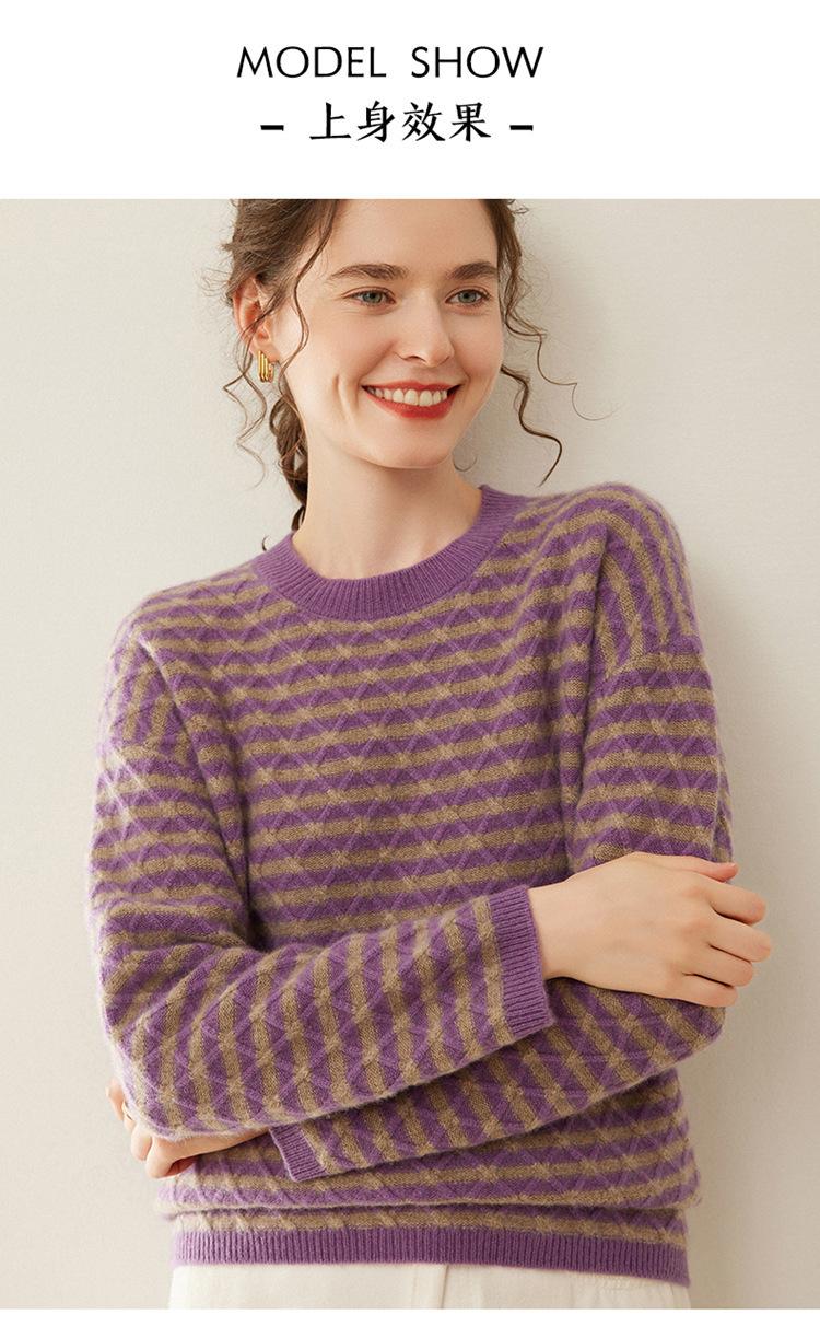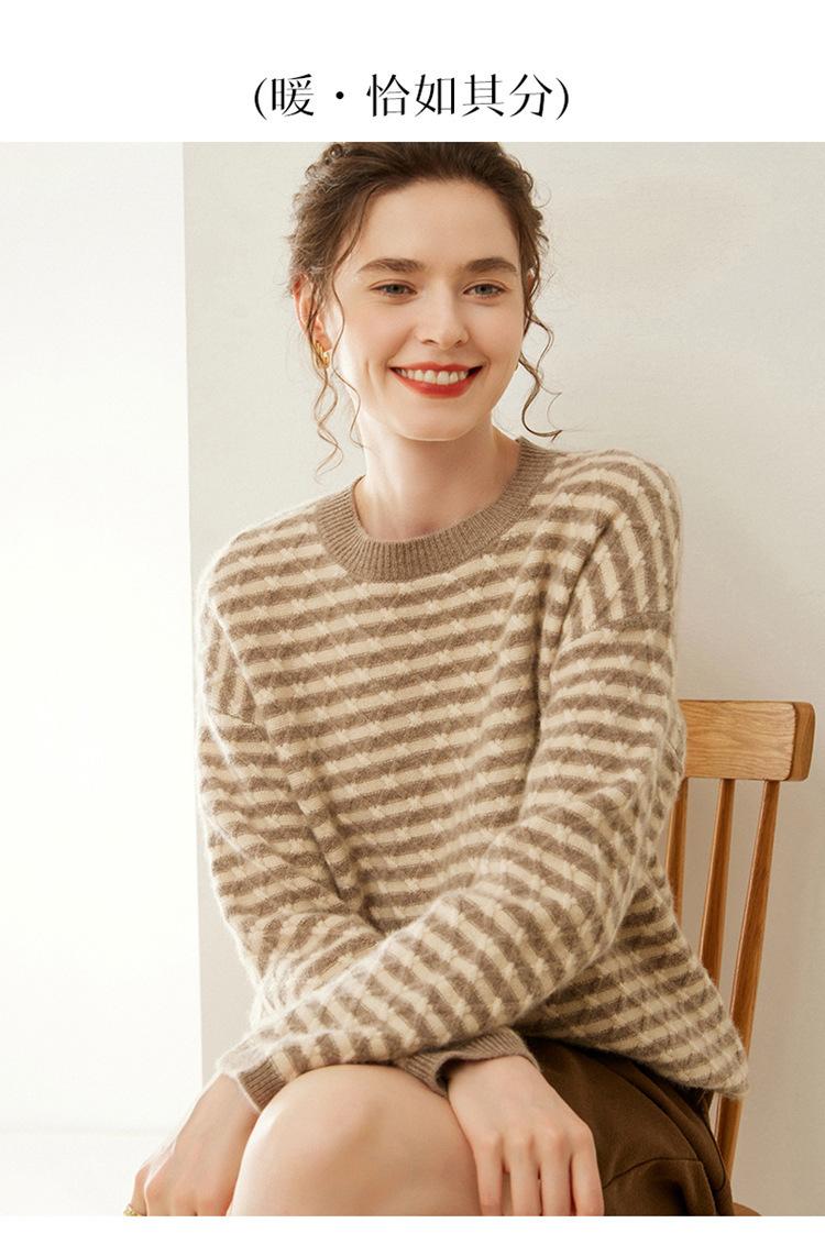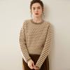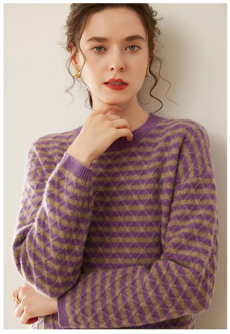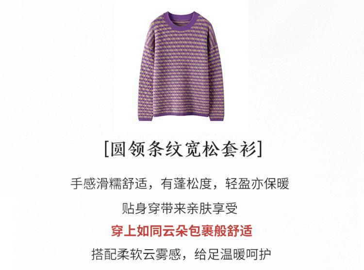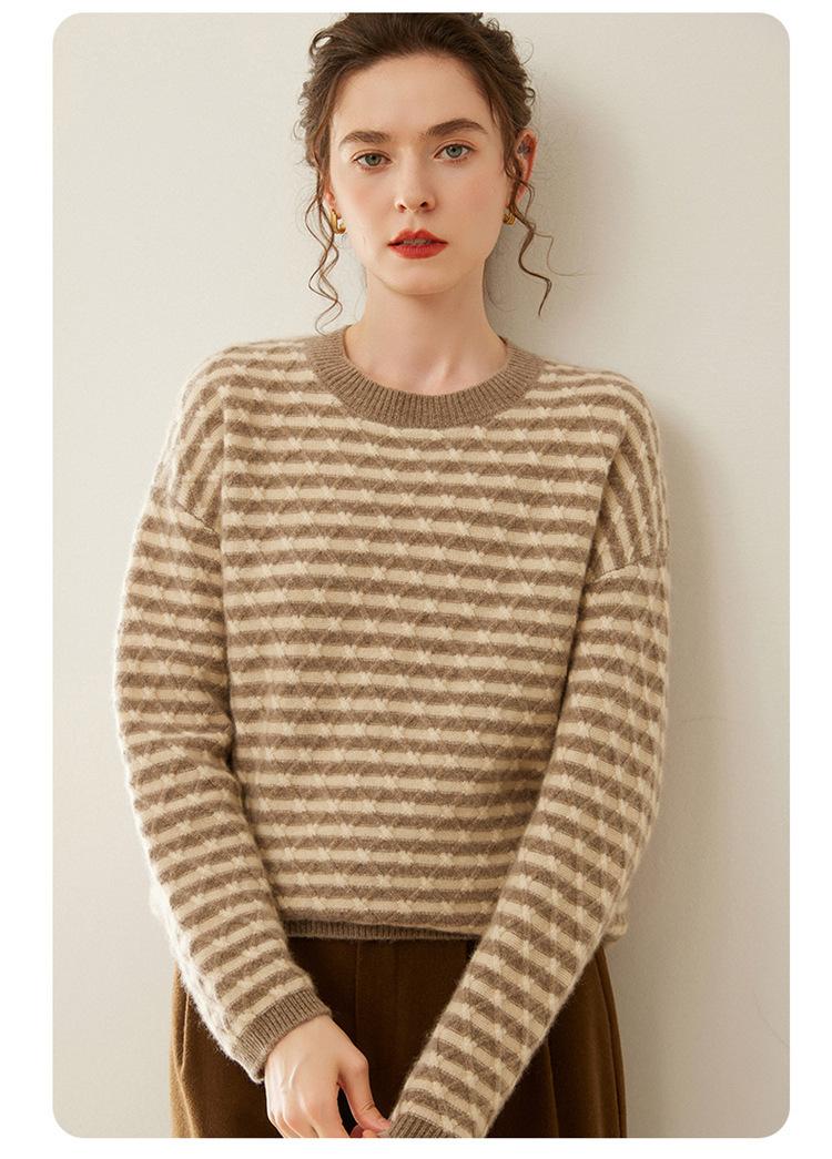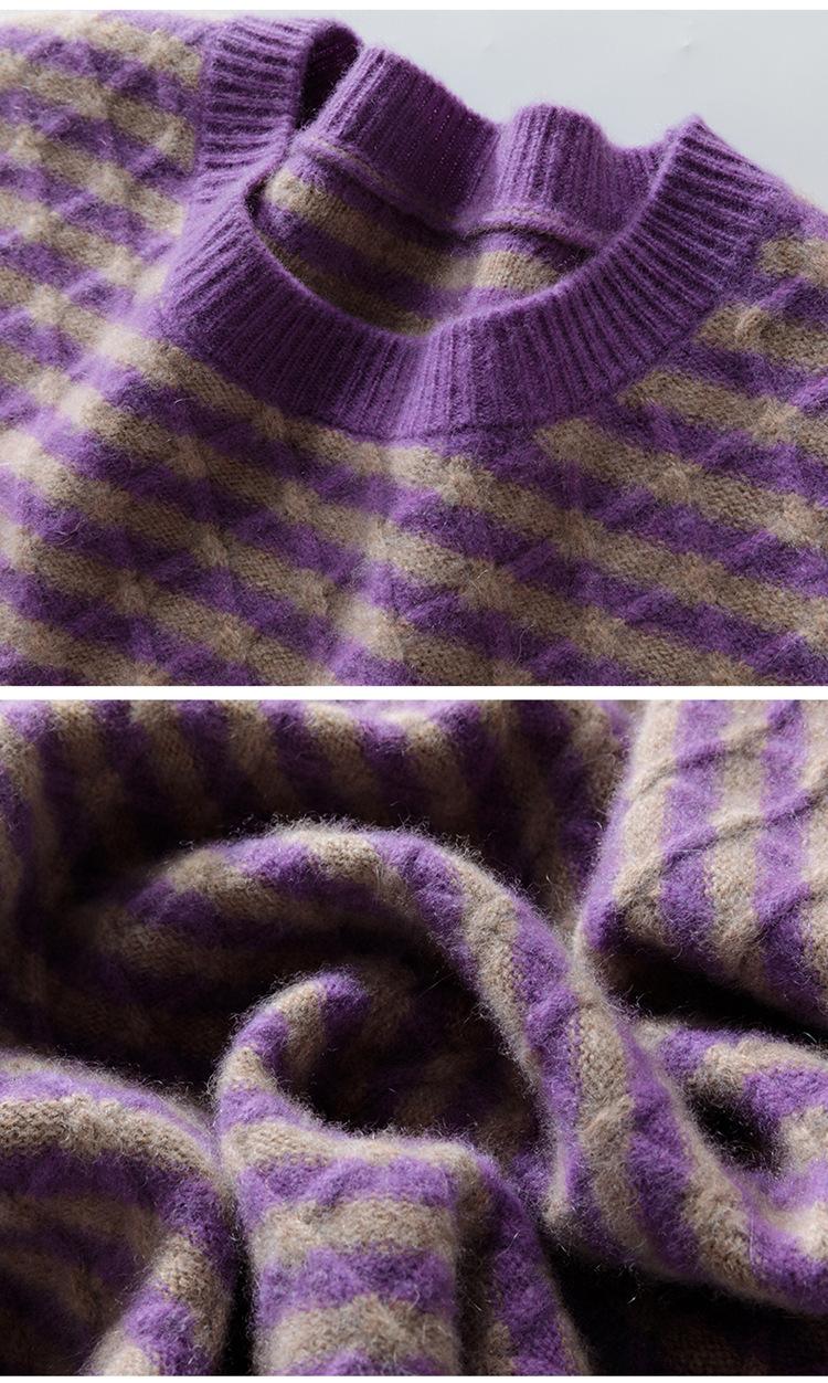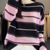 Otoño e Invierno Nuevo Suéter Retro de Cachemira de Cuello Redondo Manga Larga Rayado a Contraste Suave Ceroso Camiseta Base Suéter