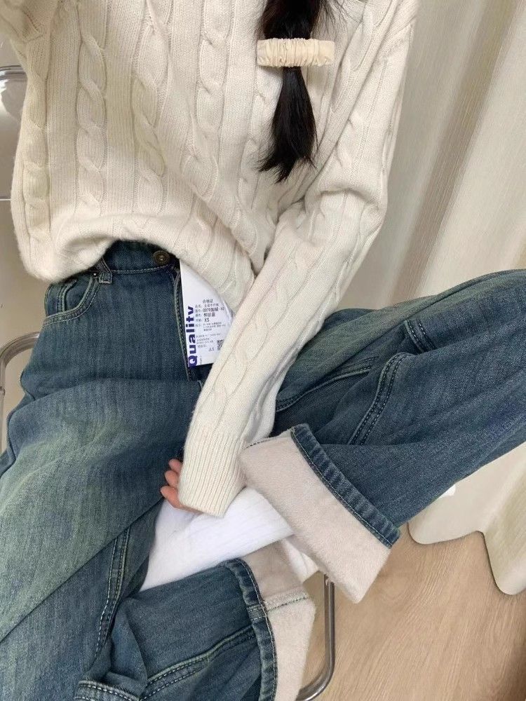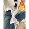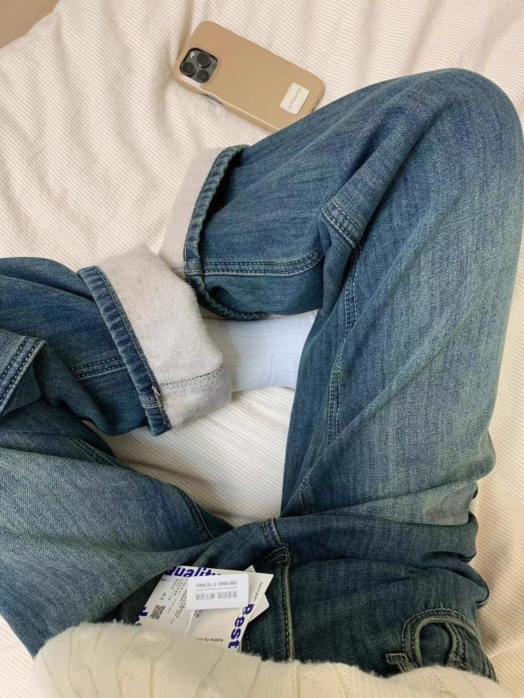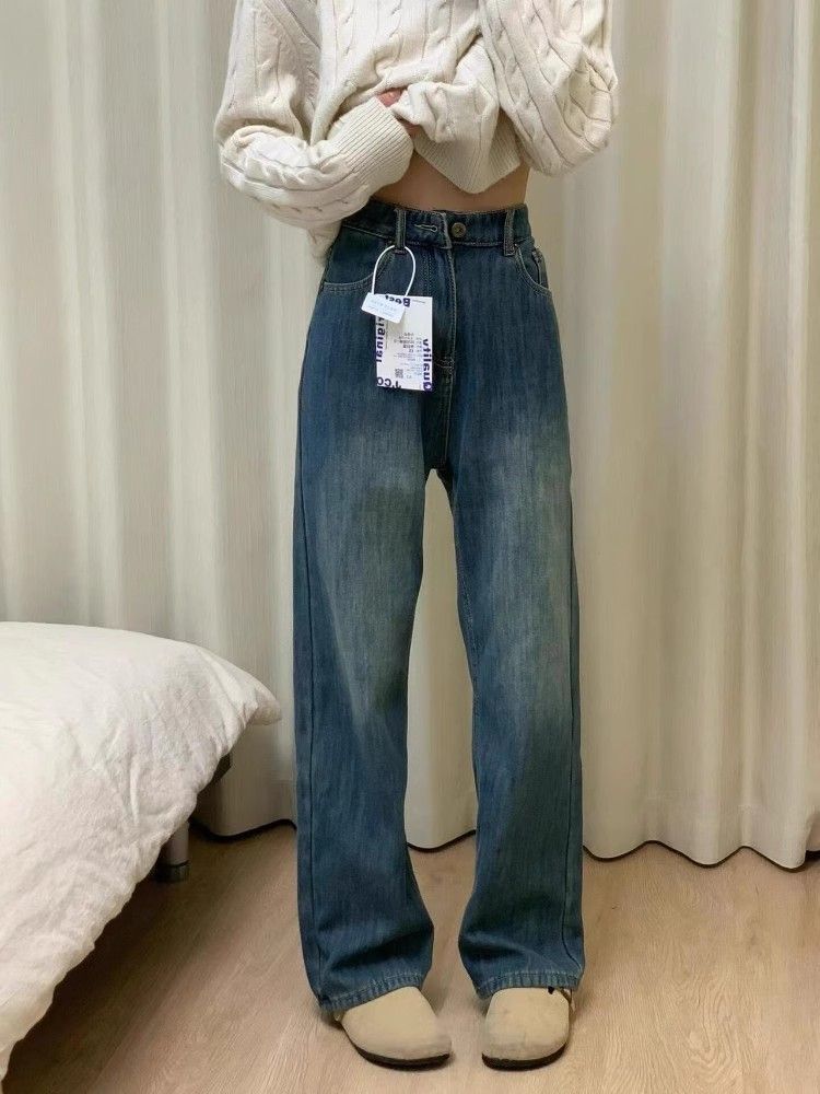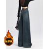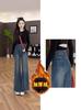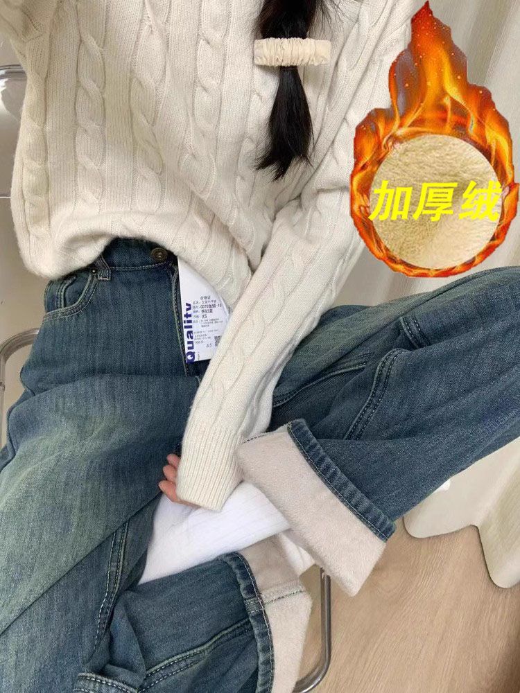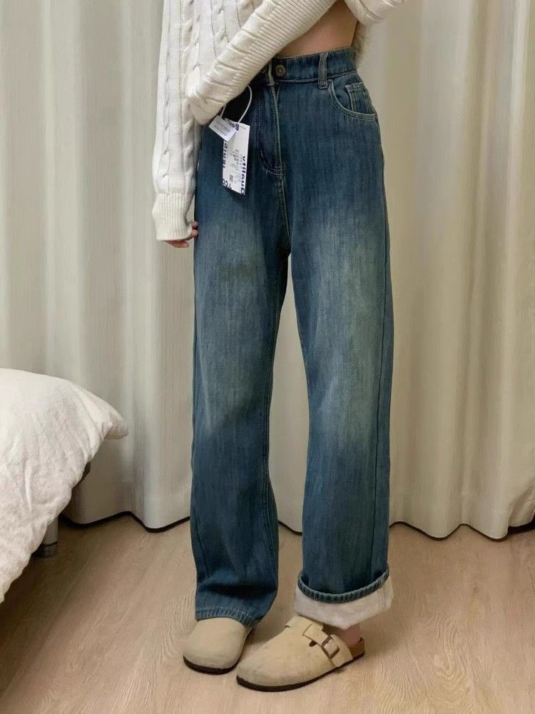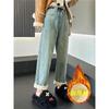 Vaqueros rectos engrosados con forro polar azul vintage para mujer, otoño e invierno 2024, nuevos pantalones largos adelgazantes de cintura alta y pierna ancha de talla grande