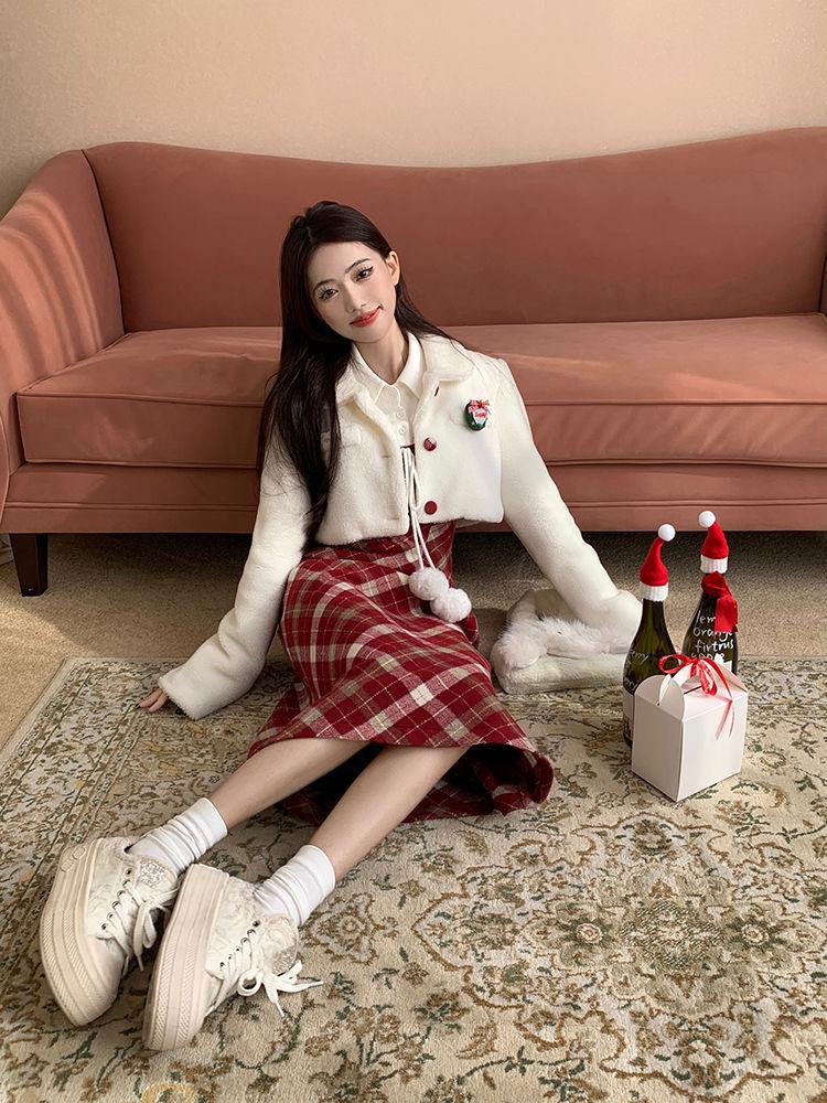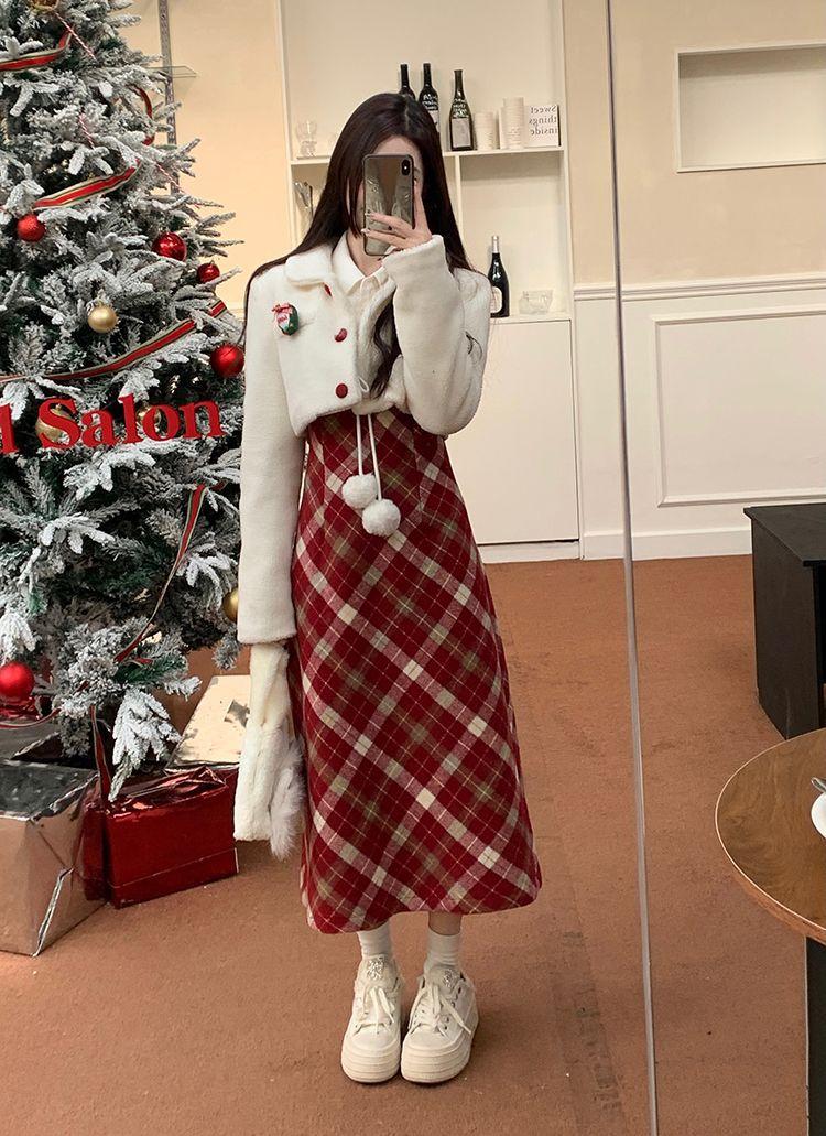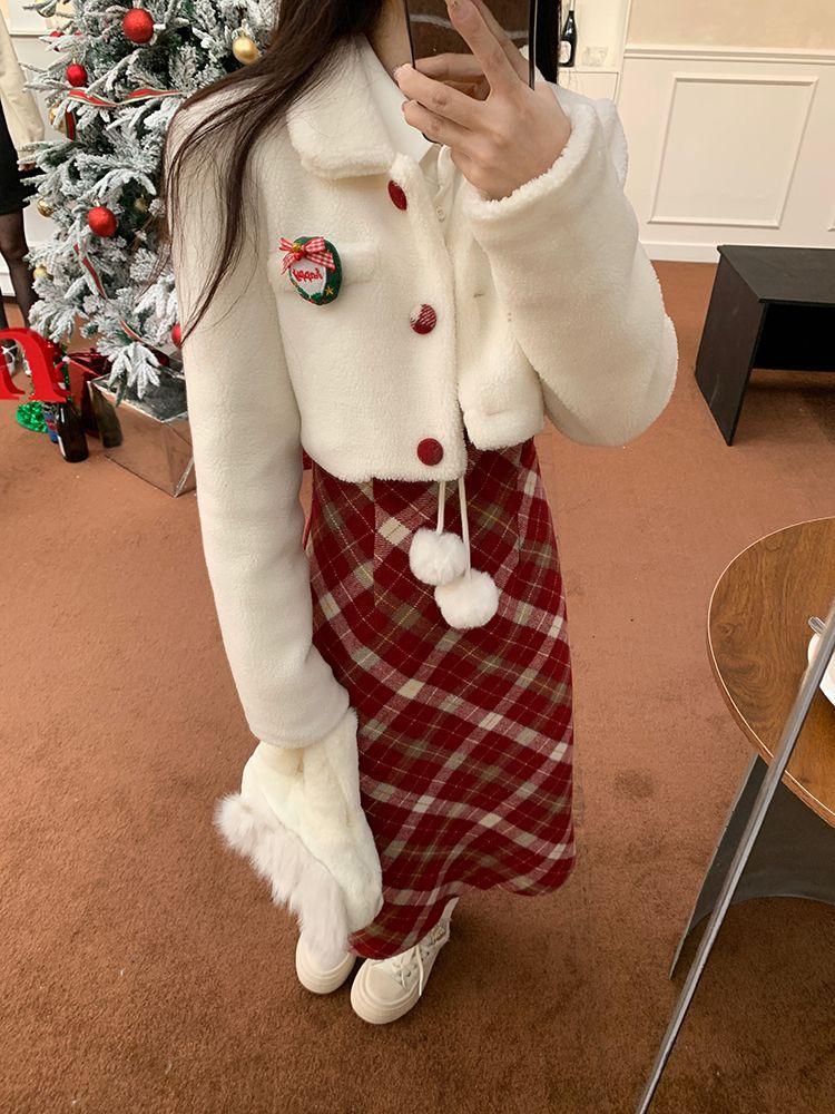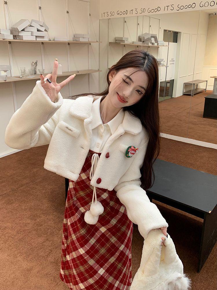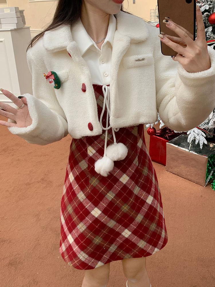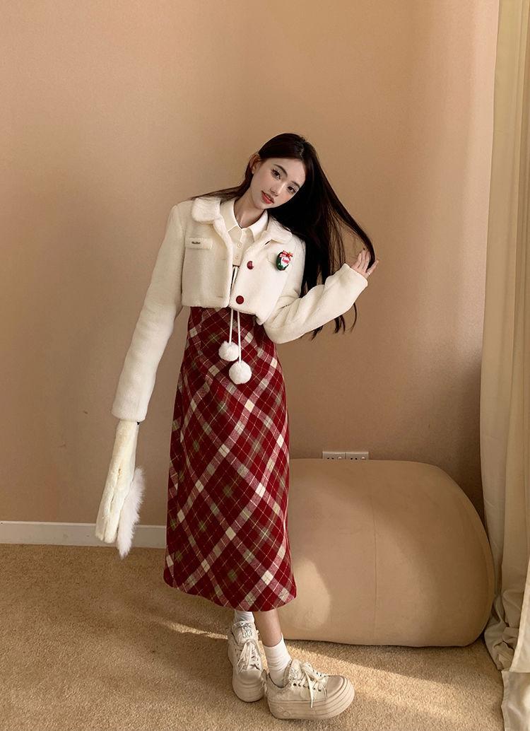 Fake two-piece skirt, Fake two-piece long skirt, Lamb wool coat, Lamb wool jacket + short dress [two-piece set...