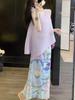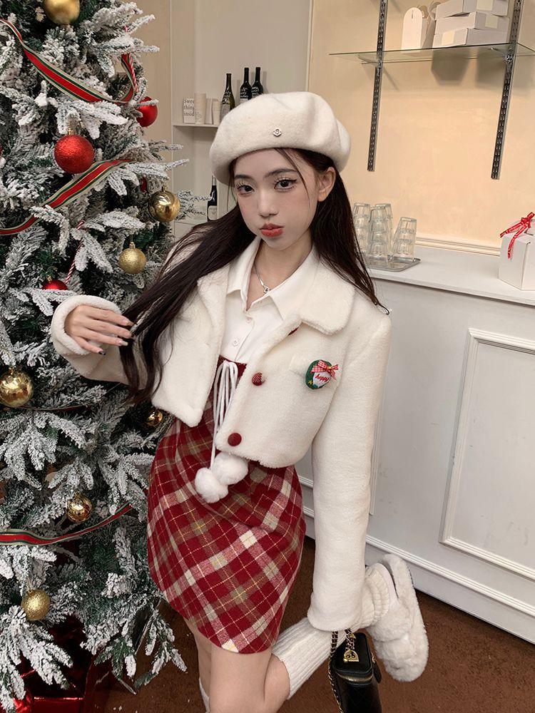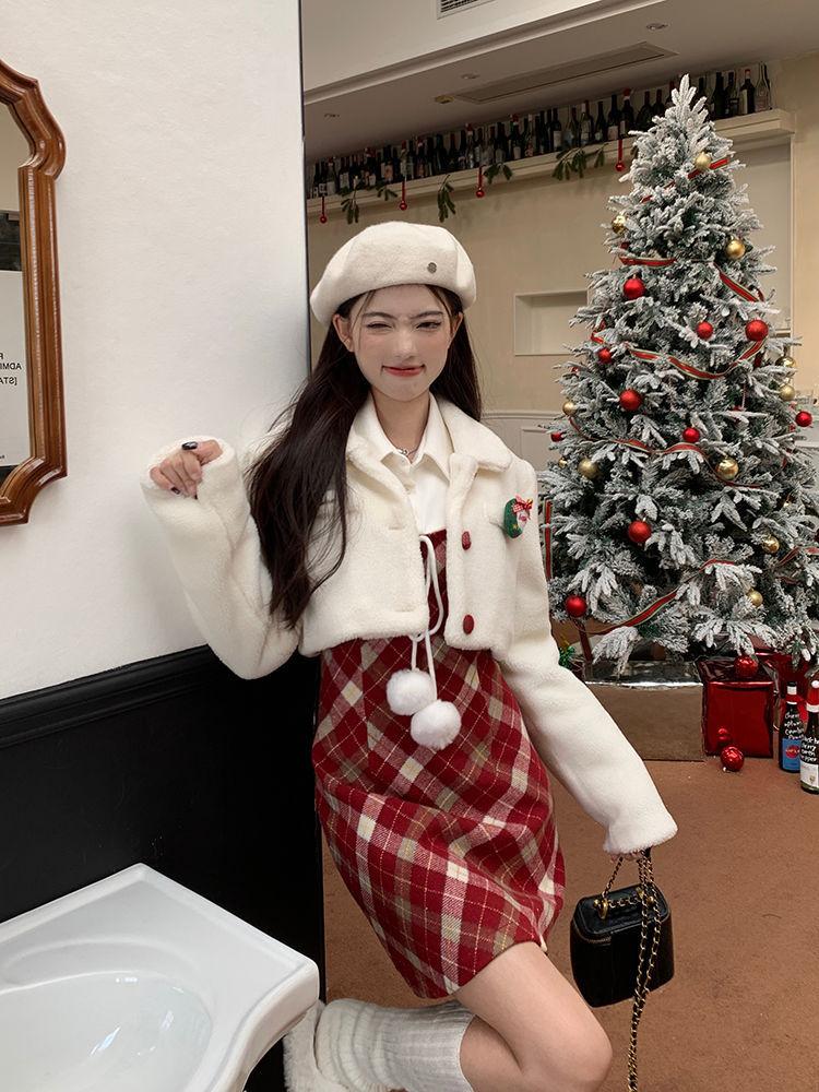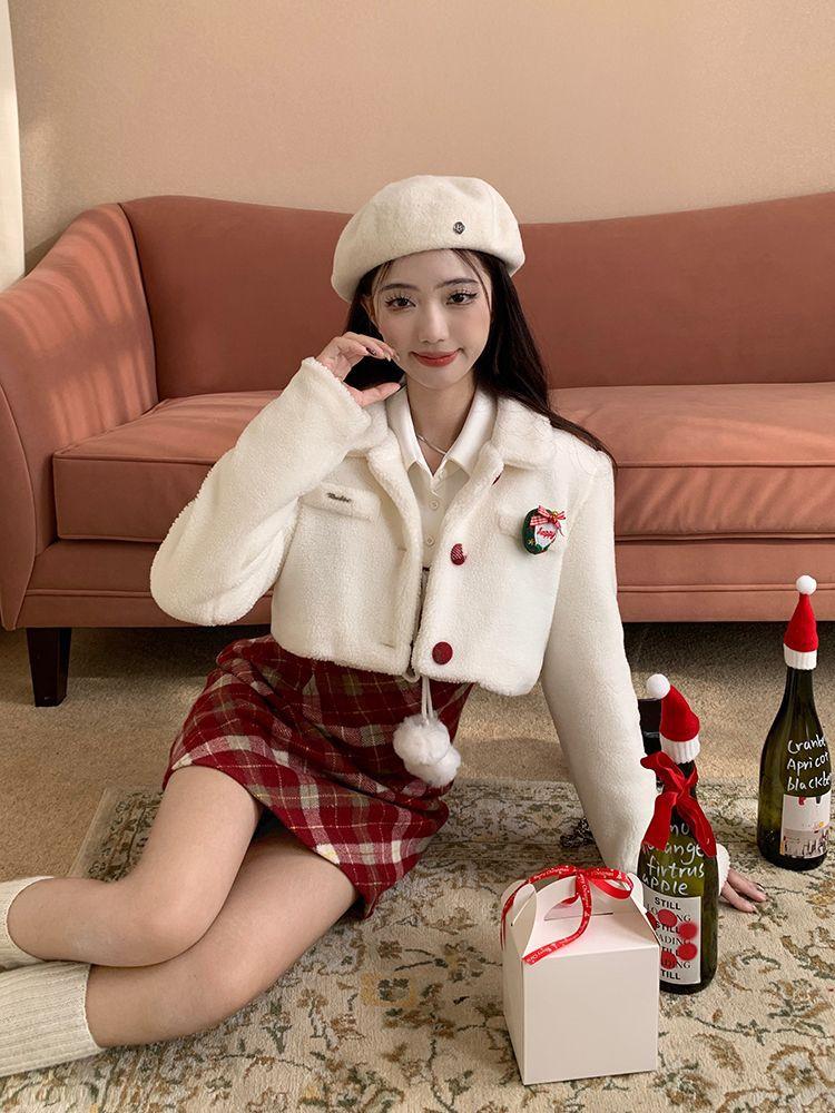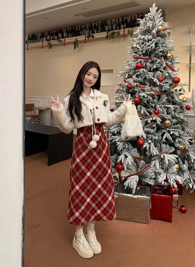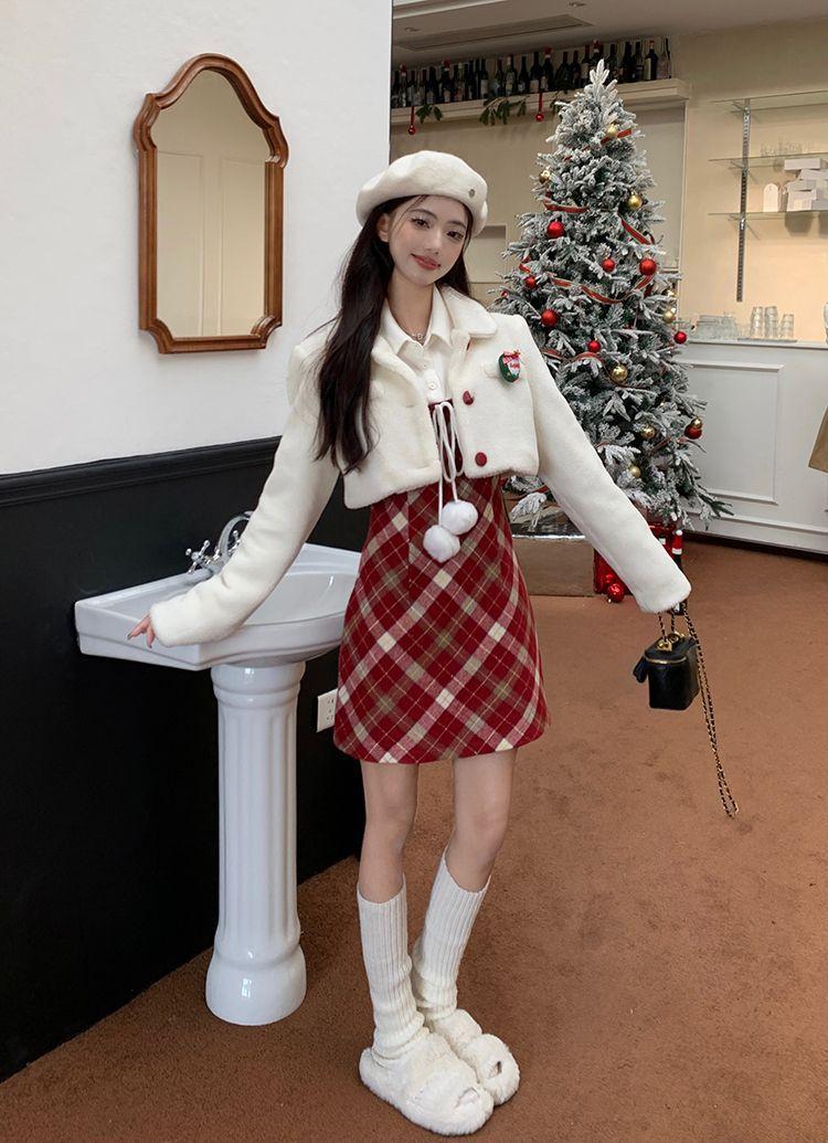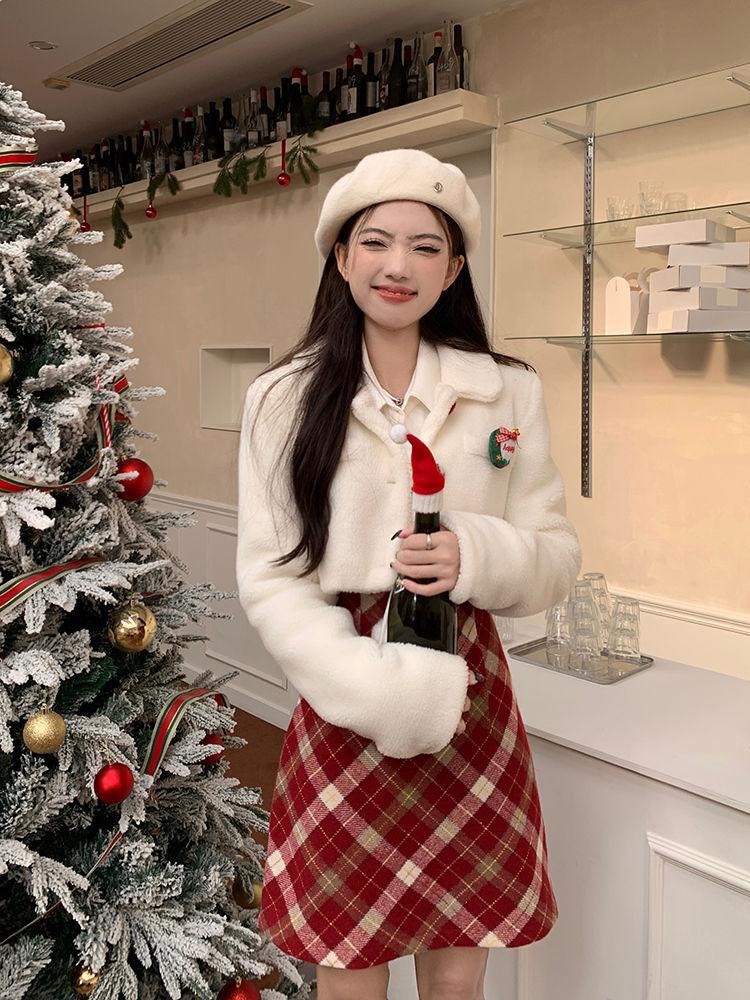 Fake two-piece skirt, Fake two-piece long skirt, Lamb wool coat, Lamb wool jacket + short dress [two-piece set...
