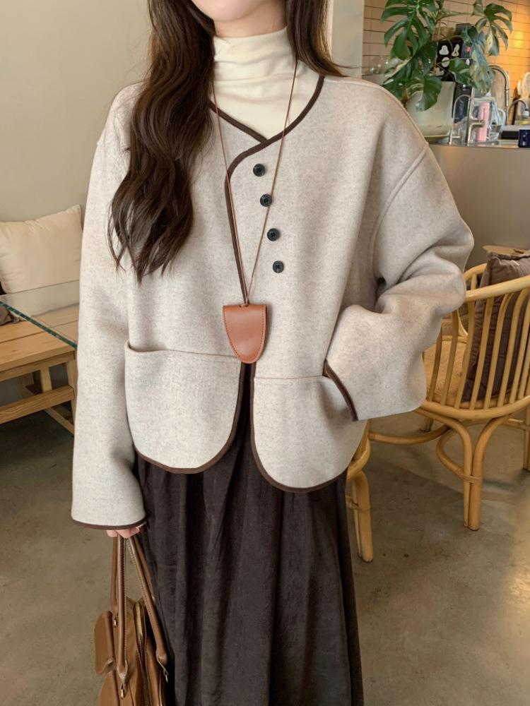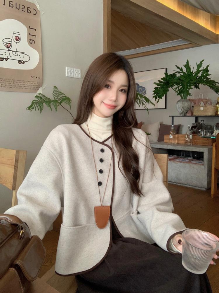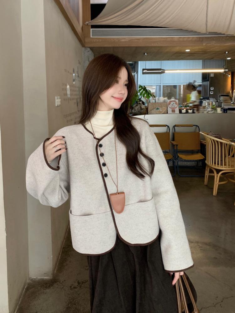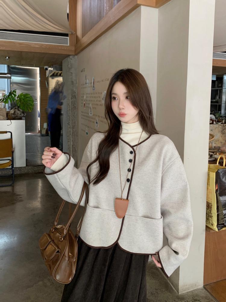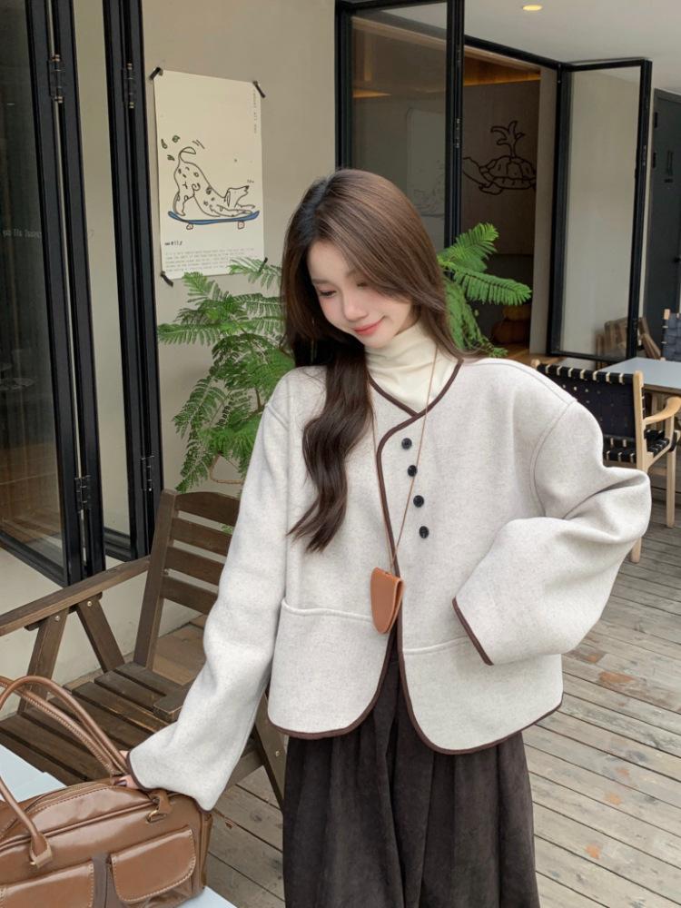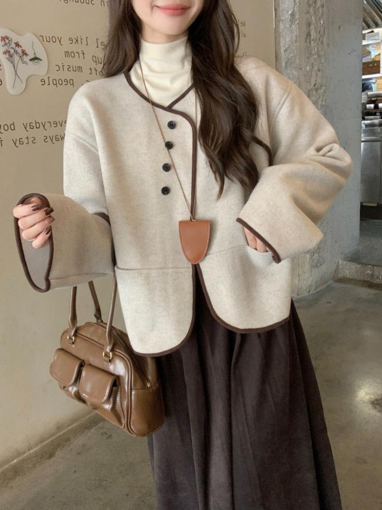 Estilo Coreano Chic Otoño e Invierno Sentido del Diseño Manga Hombro Abrigo Suelto Top de Lana de Cuello Redondo con Borde de Color en Contraste Retro para Mujer