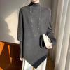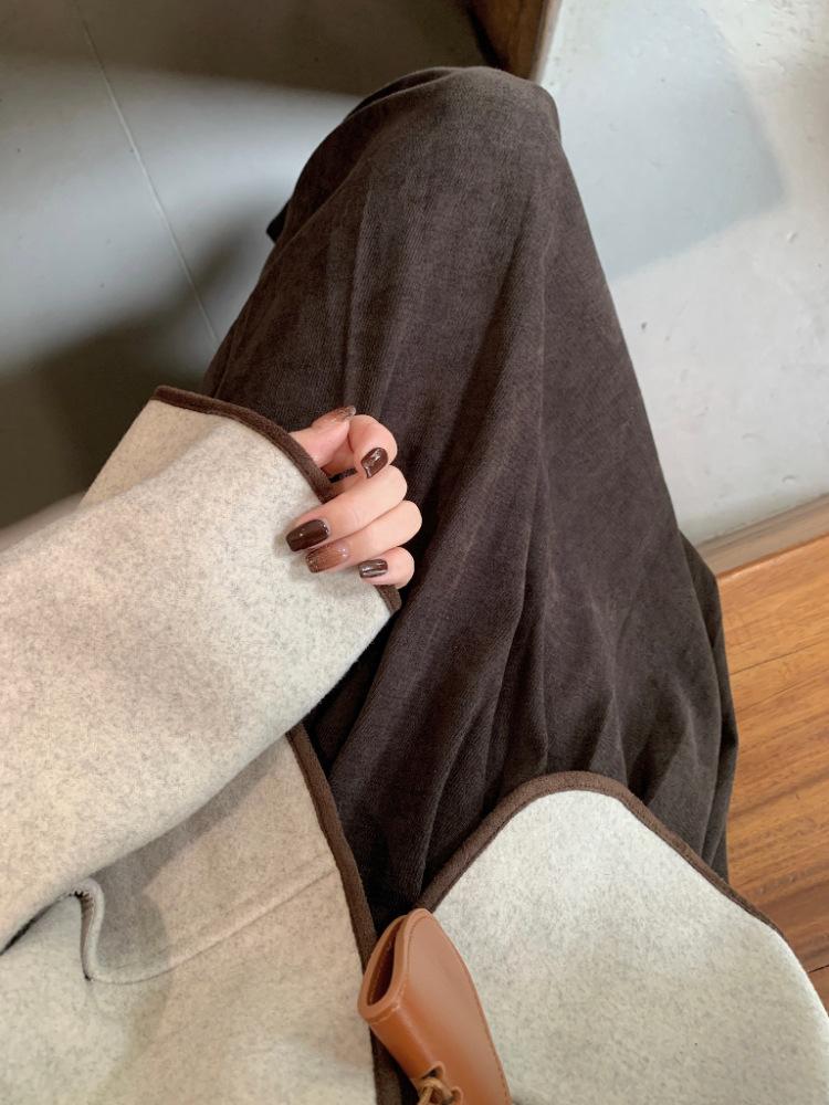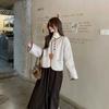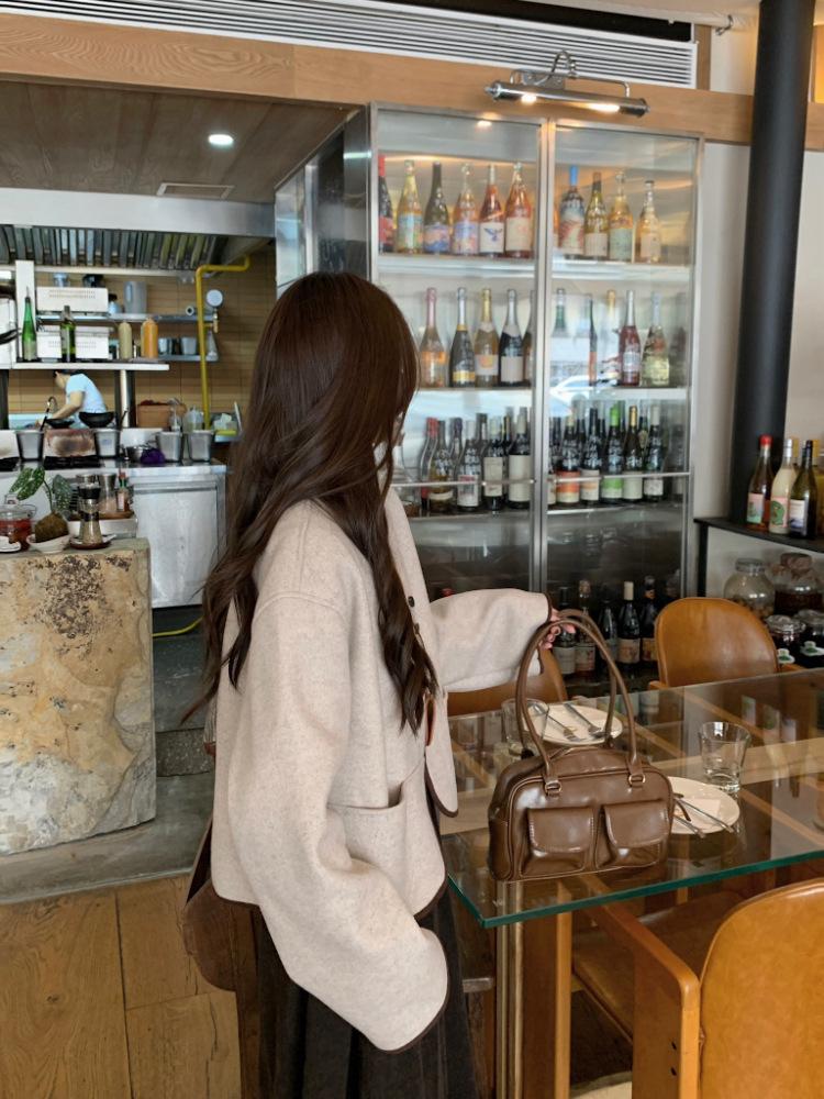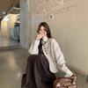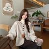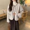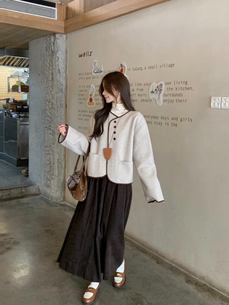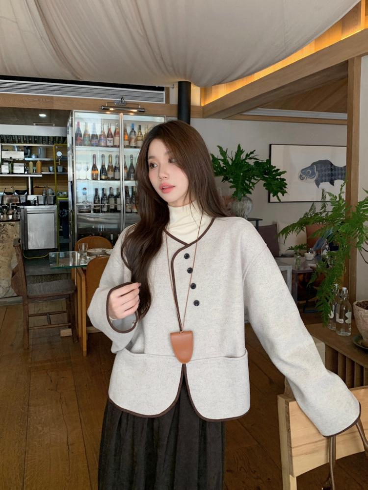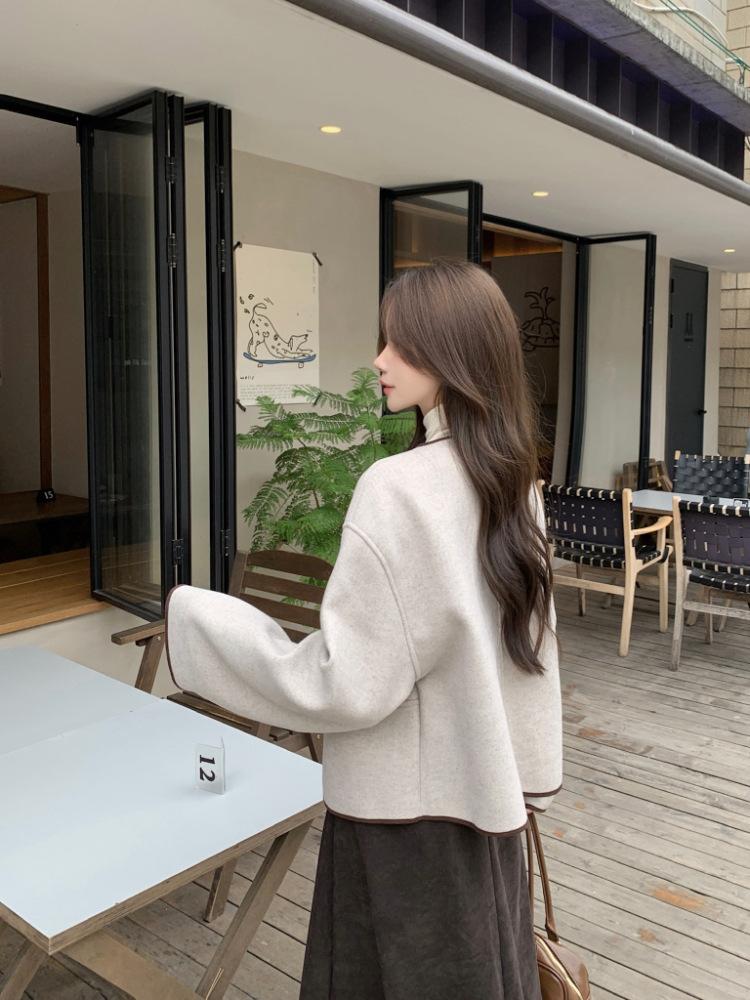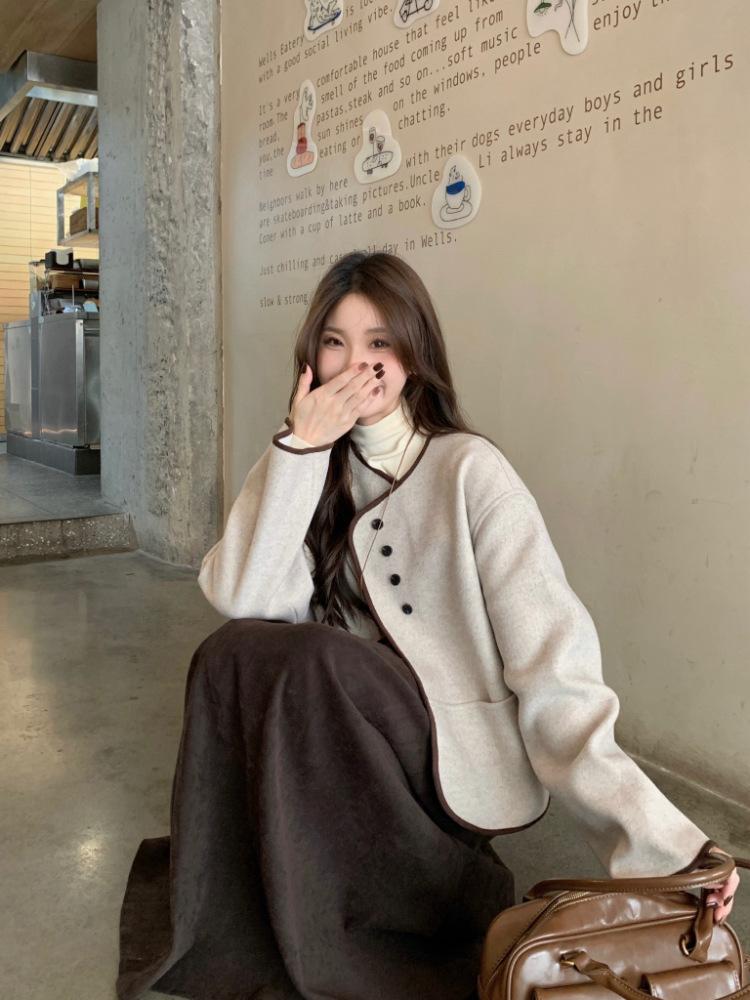 Estilo Coreano Chic Otoño e Invierno Sentido del Diseño Manga Hombro Abrigo Suelto Top de Lana de Cuello Redondo con Borde de Color en Contraste Retro para Mujer
