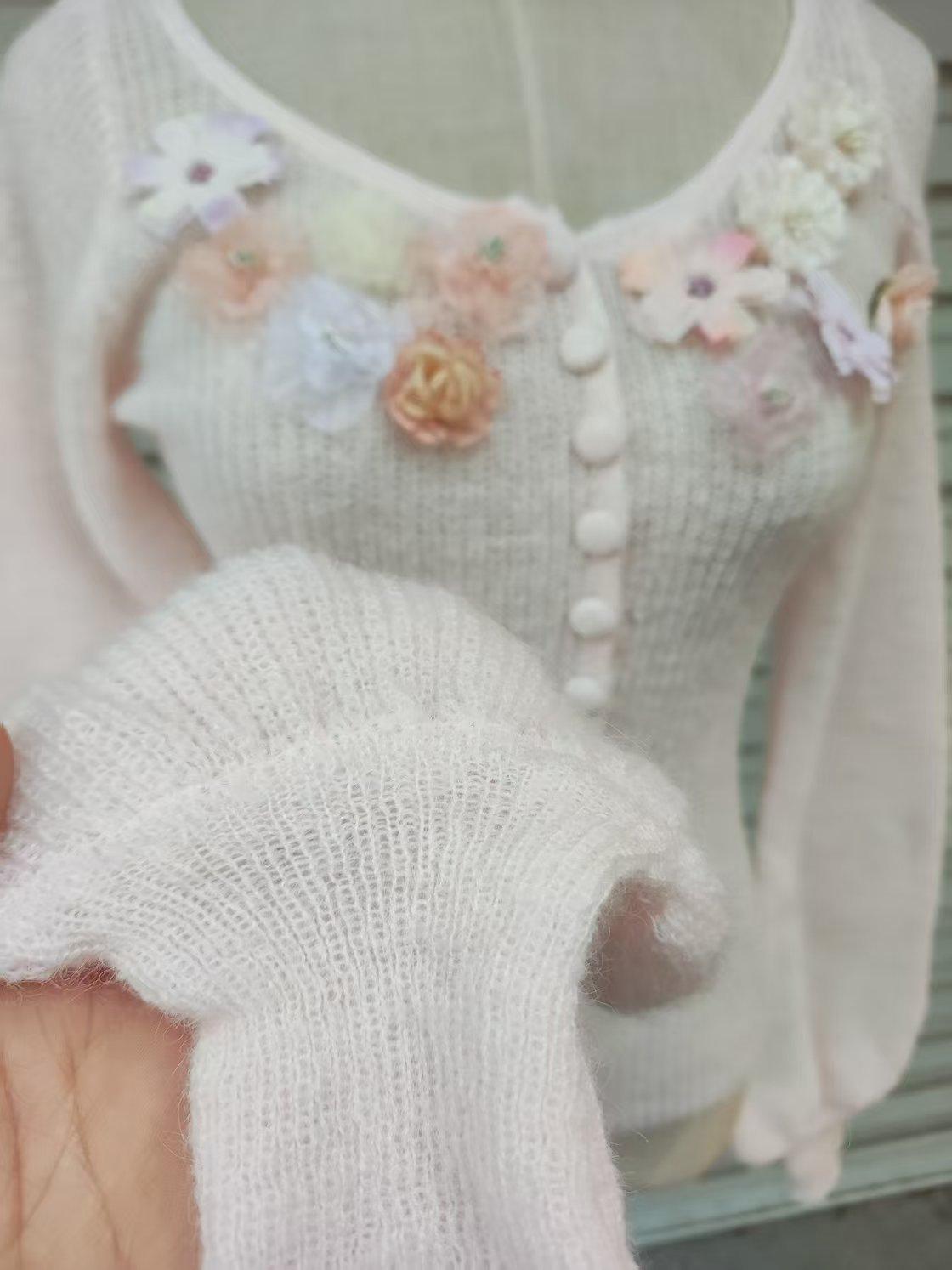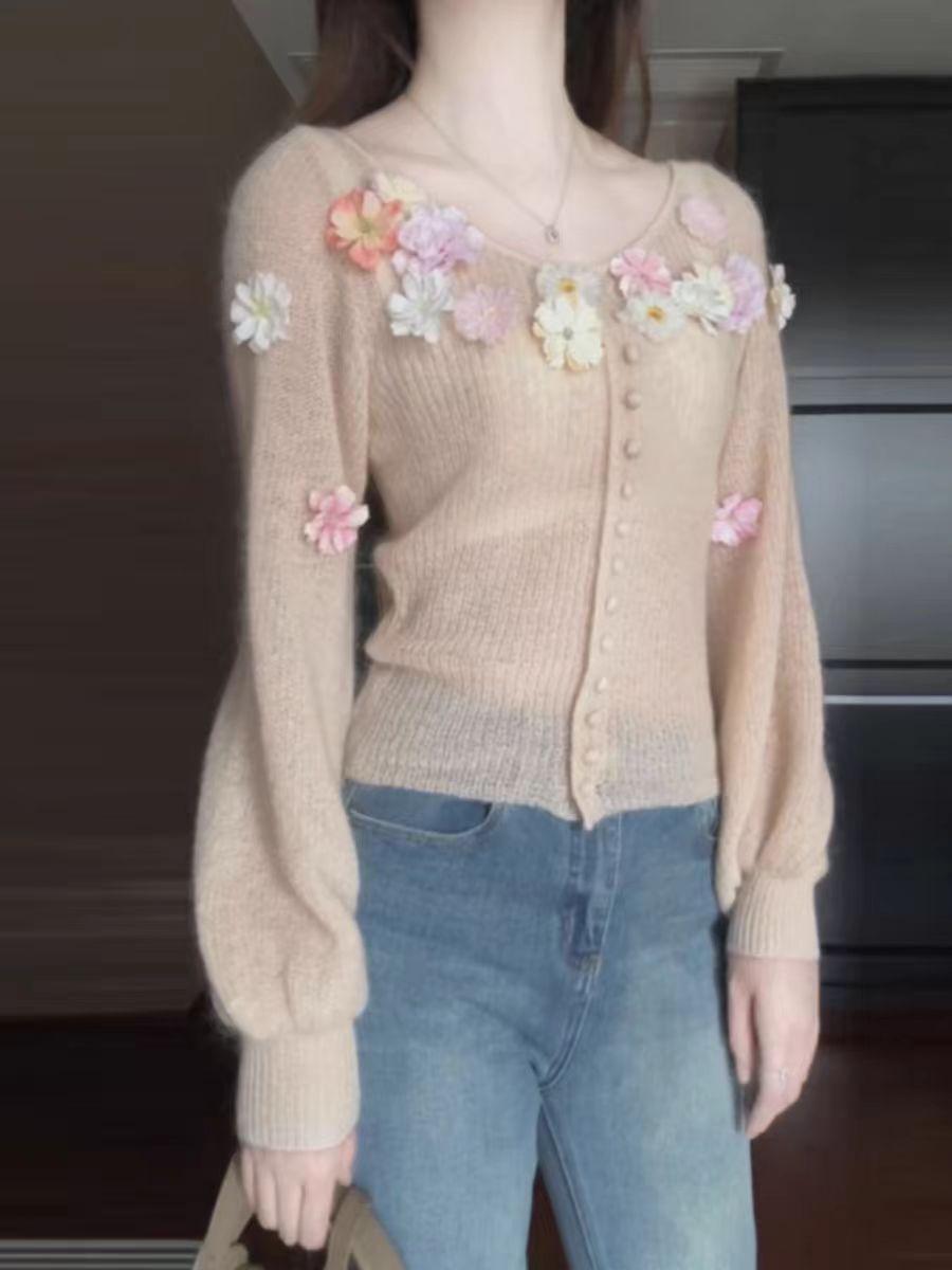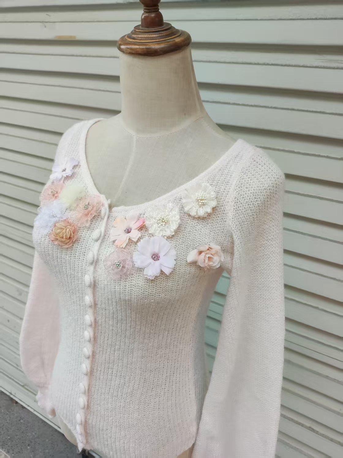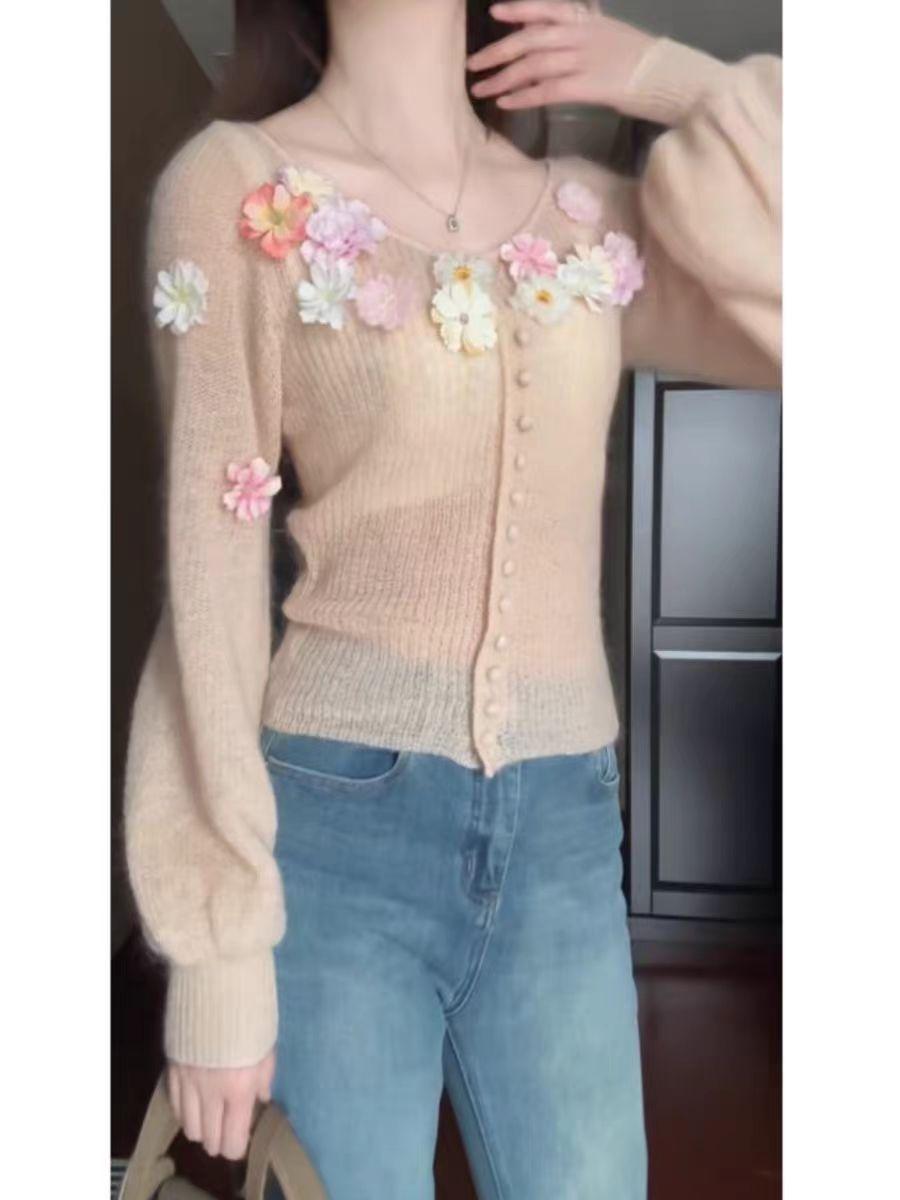 Cárdigan de punto de manga larga con escote en V y flores tridimensionales para mujer, primavera de 2025, nuevo suéter corto ajustado.