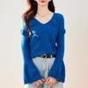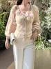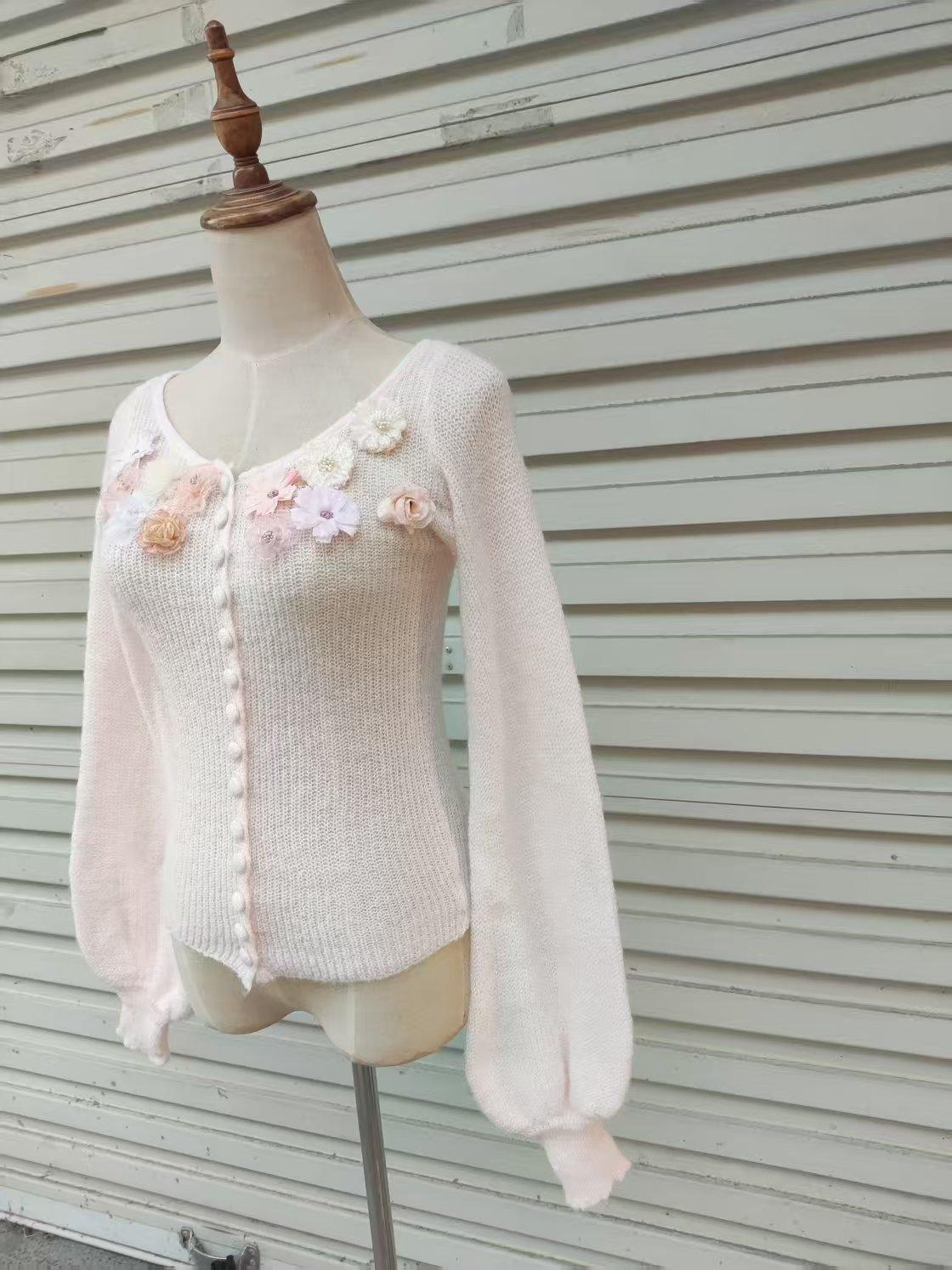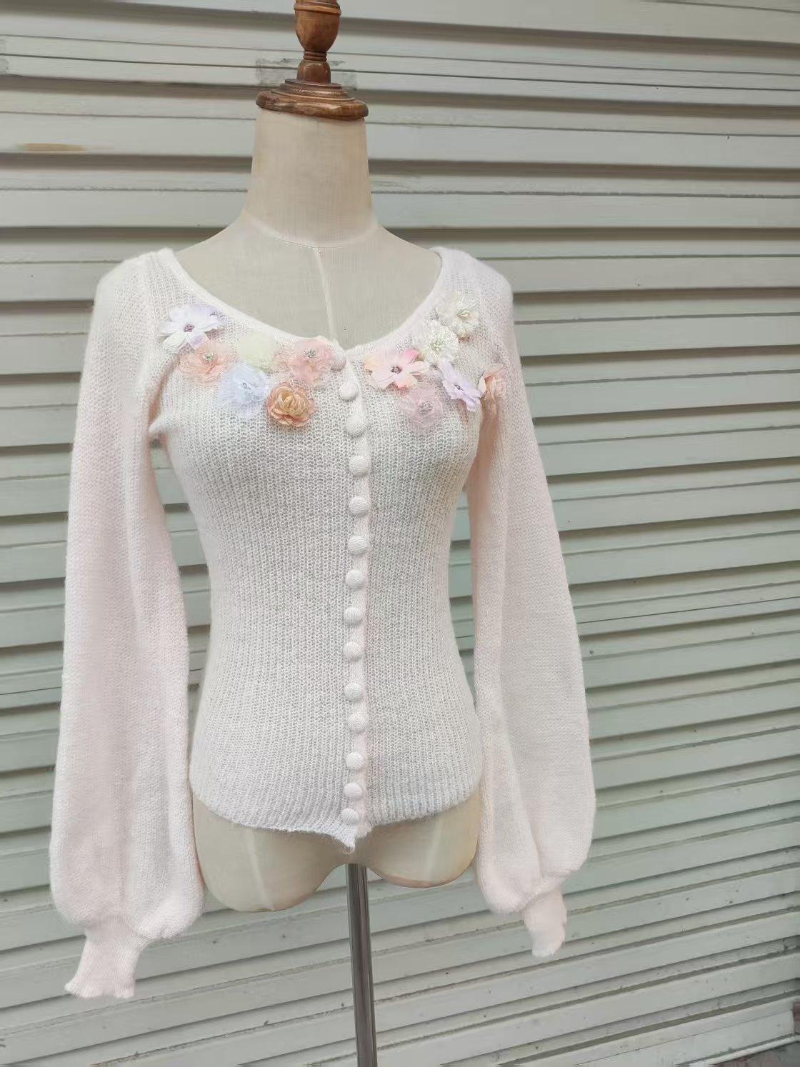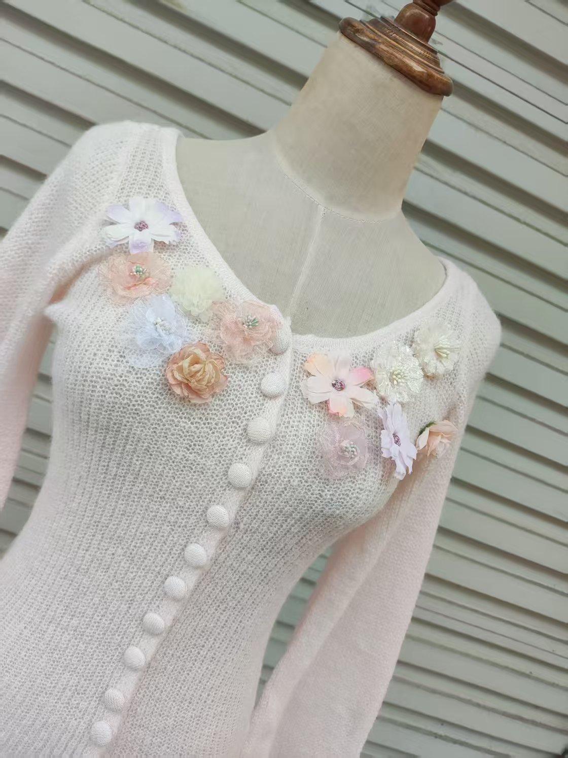 Cárdigan de punto de manga larga con escote en V y flores tridimensionales para mujer, primavera de 2025, nuevo suéter corto ajustado.