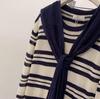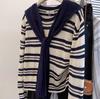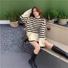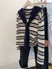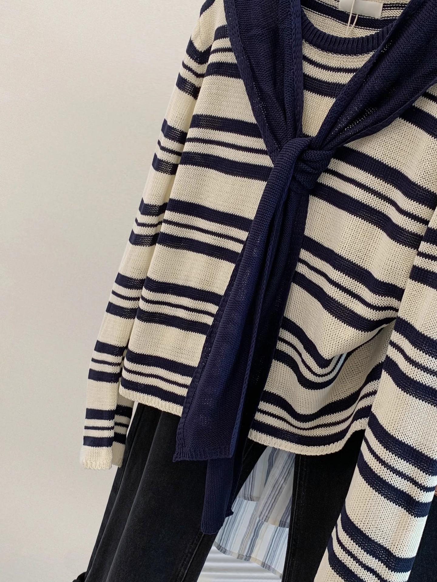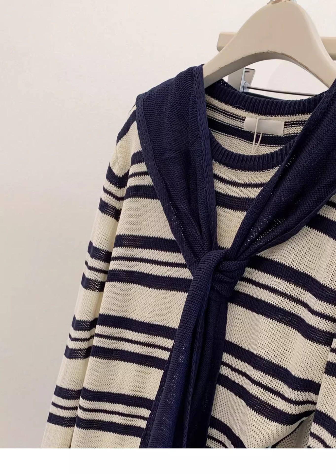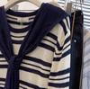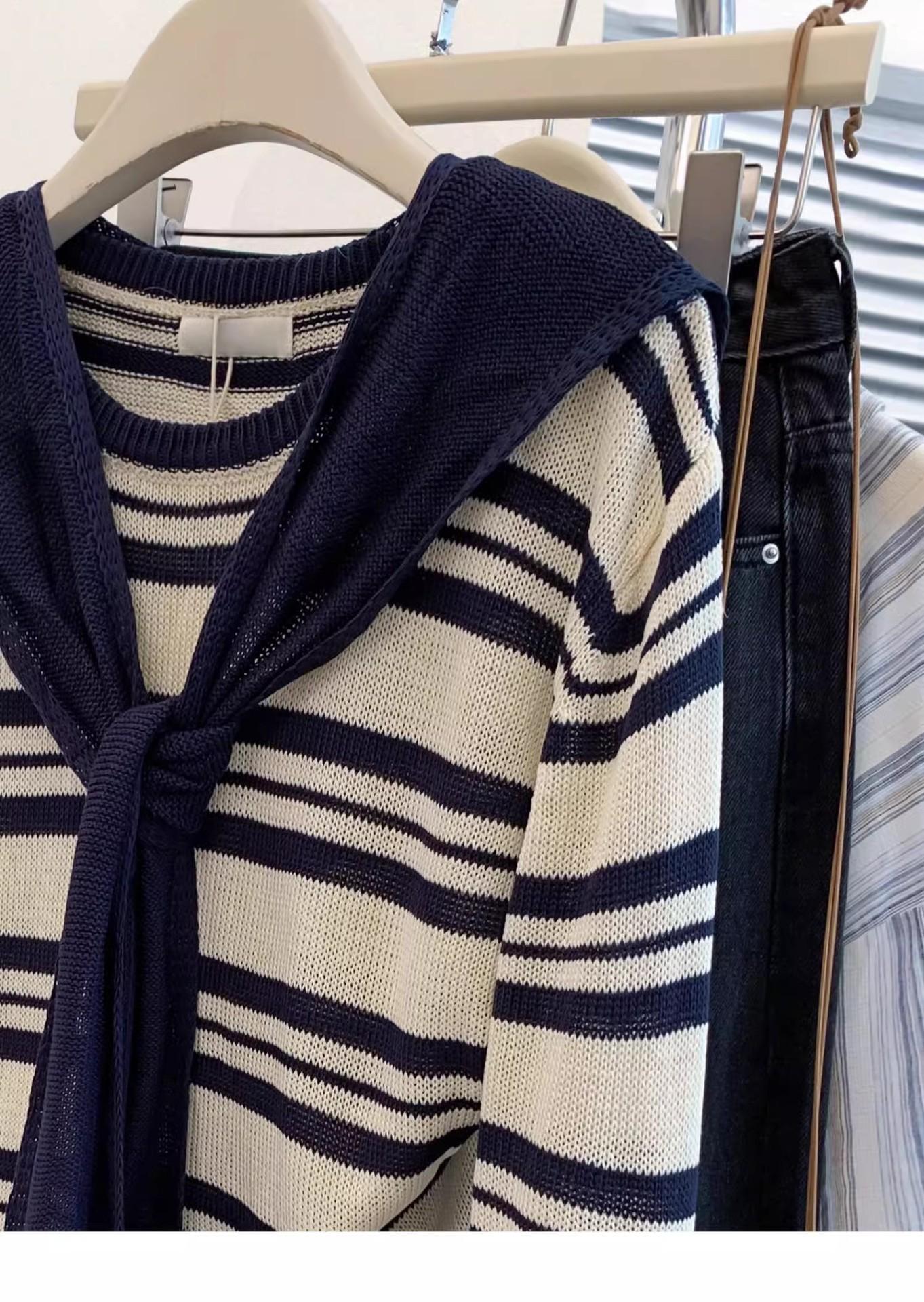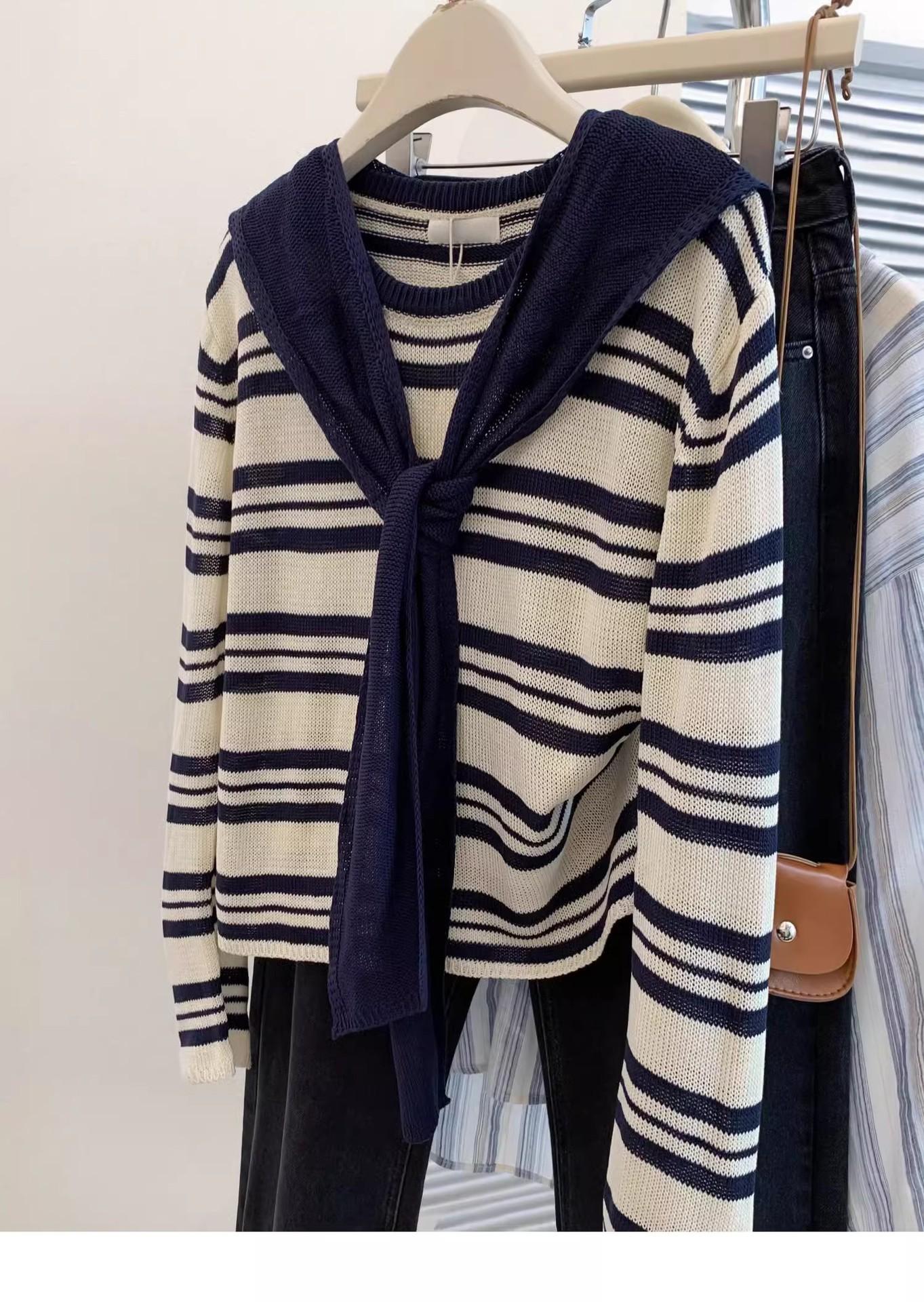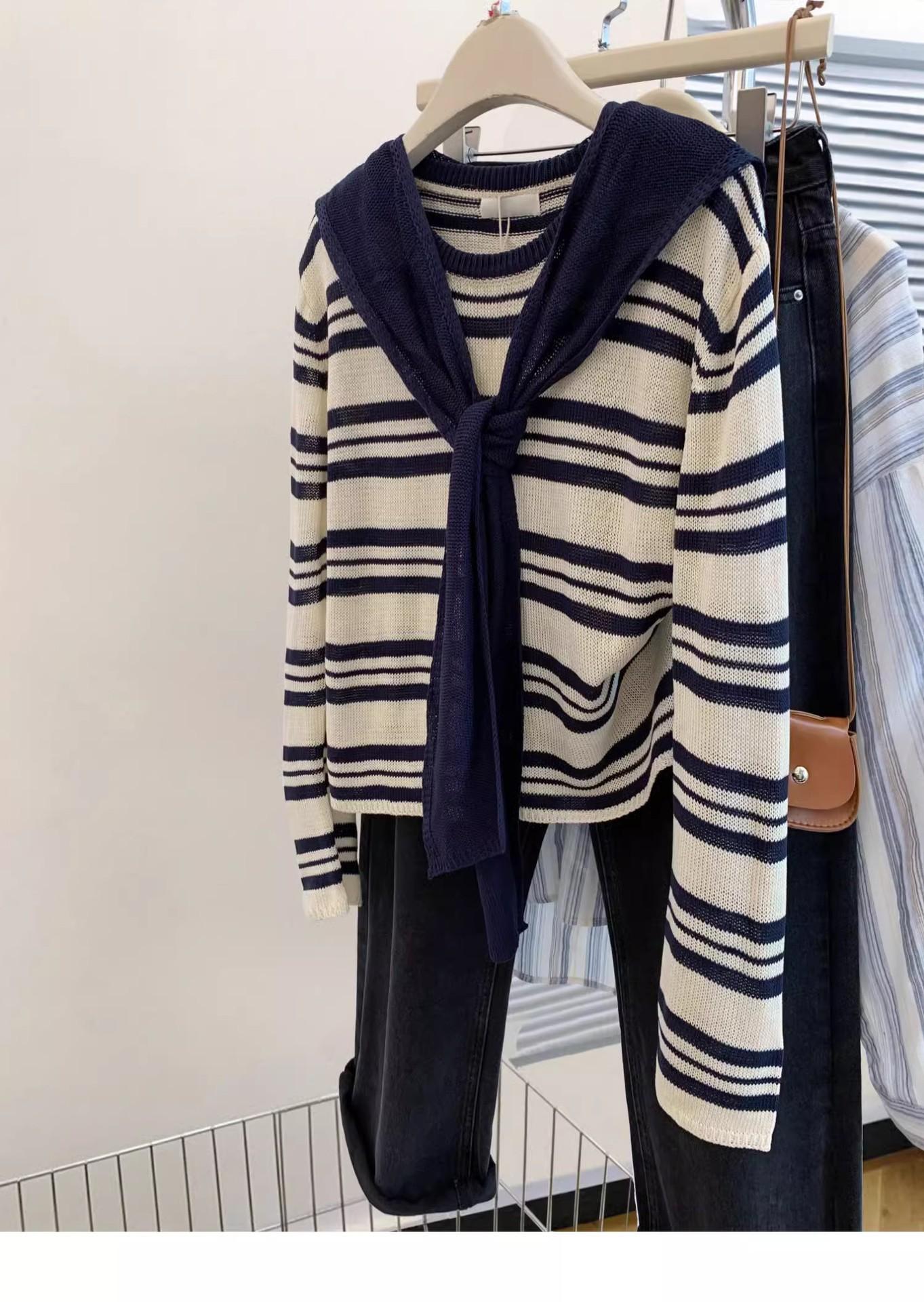 Suéter de punto con chal a rayas, conjunto de dos piezas para mujer, primavera y otoño, principios de otoño, hombros descubiertos, seda helada, color contrastante, parte superior de punto interior apilada