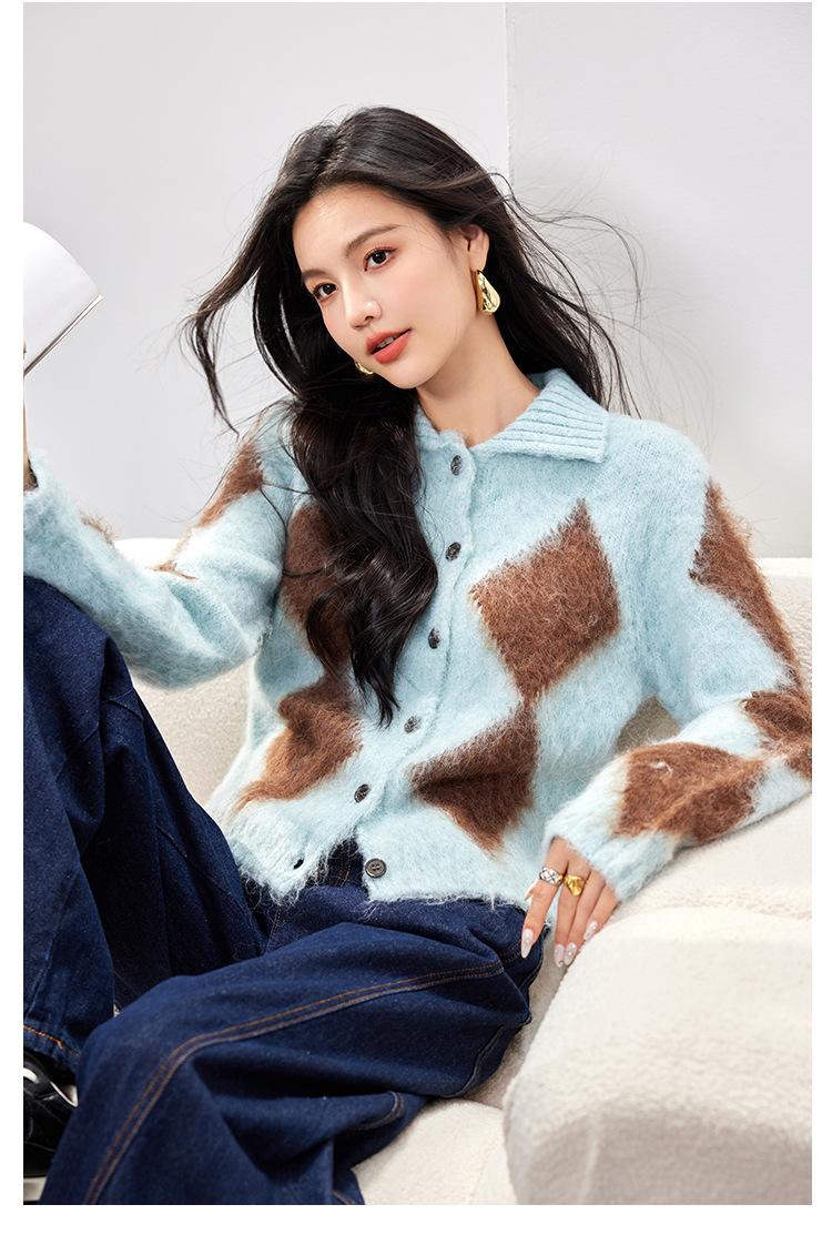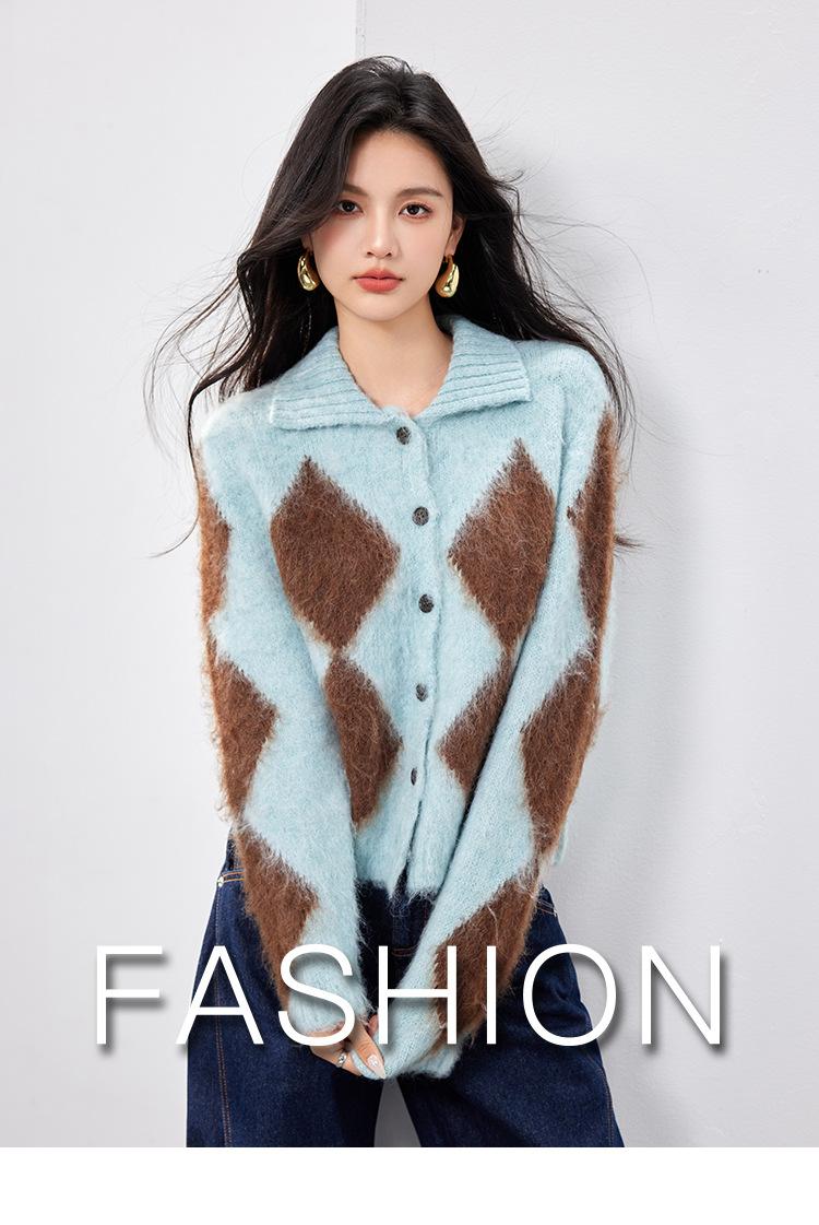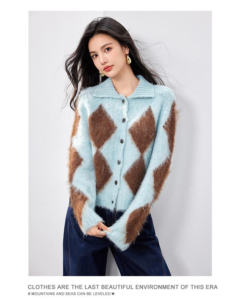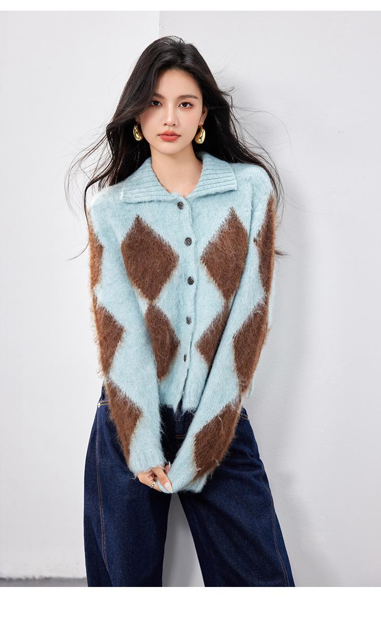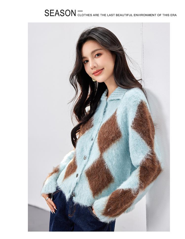 Nuevo suéter de lana cálido de contraste de alta gama para otoño e invierno 2024, cárdigan top de rombos retro francés para mujer