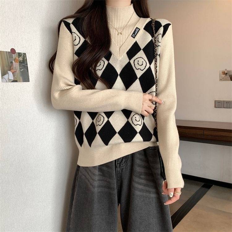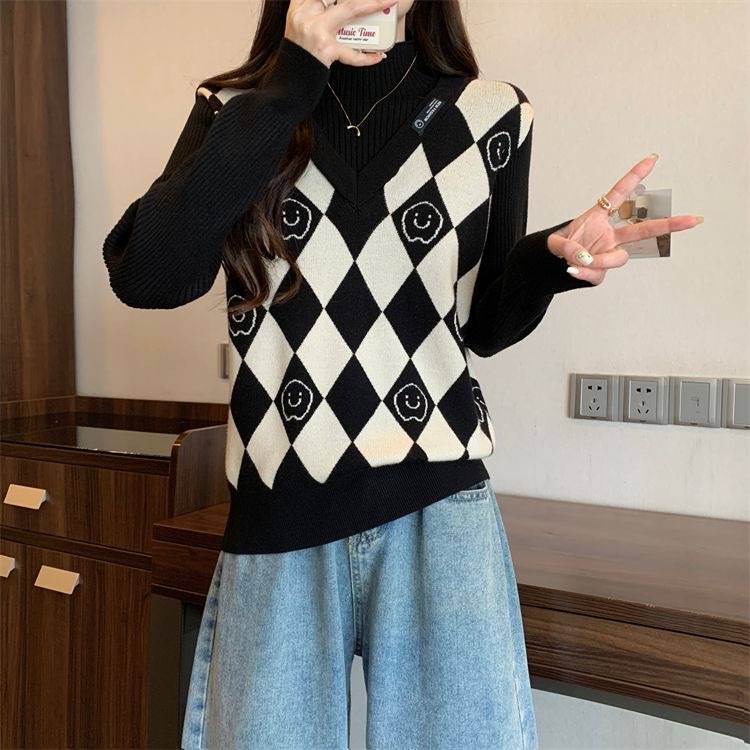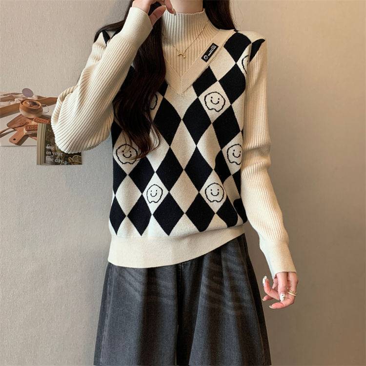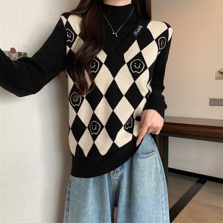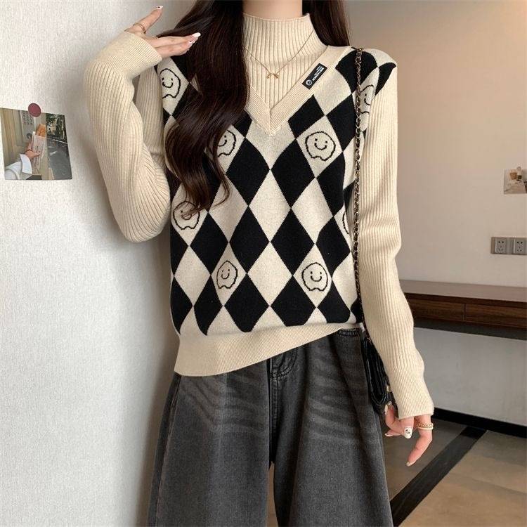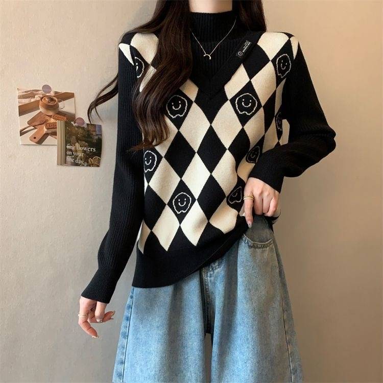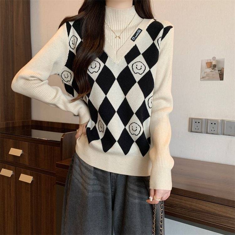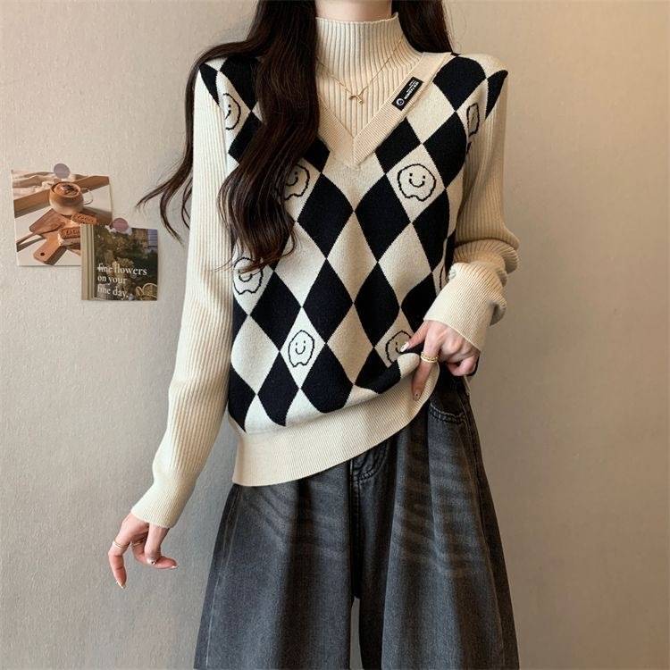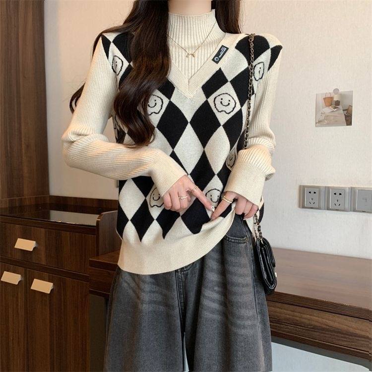 Camiseta de Punto para Fondo, Holgada, Aspecto Adelgazante, Color Contrastante, Top Exterior, Suéter de Cuello Alto Falso de Dos Piezas de Moda para Mujer en Otoño e Invierno