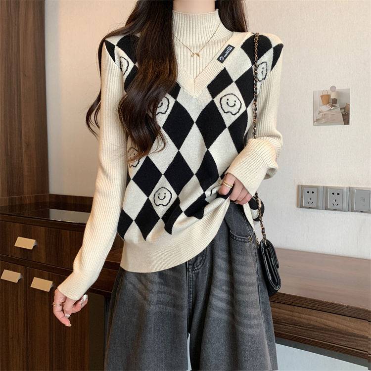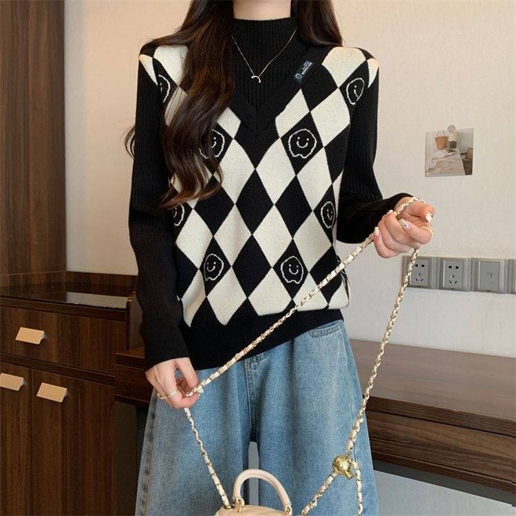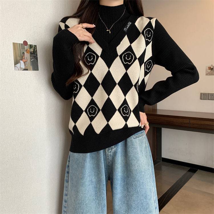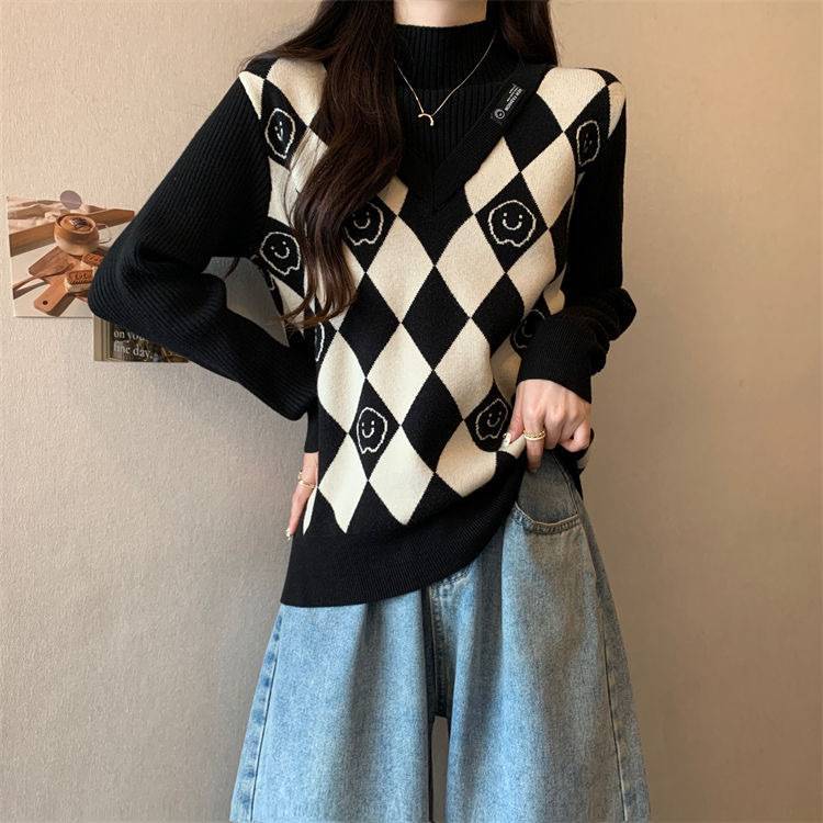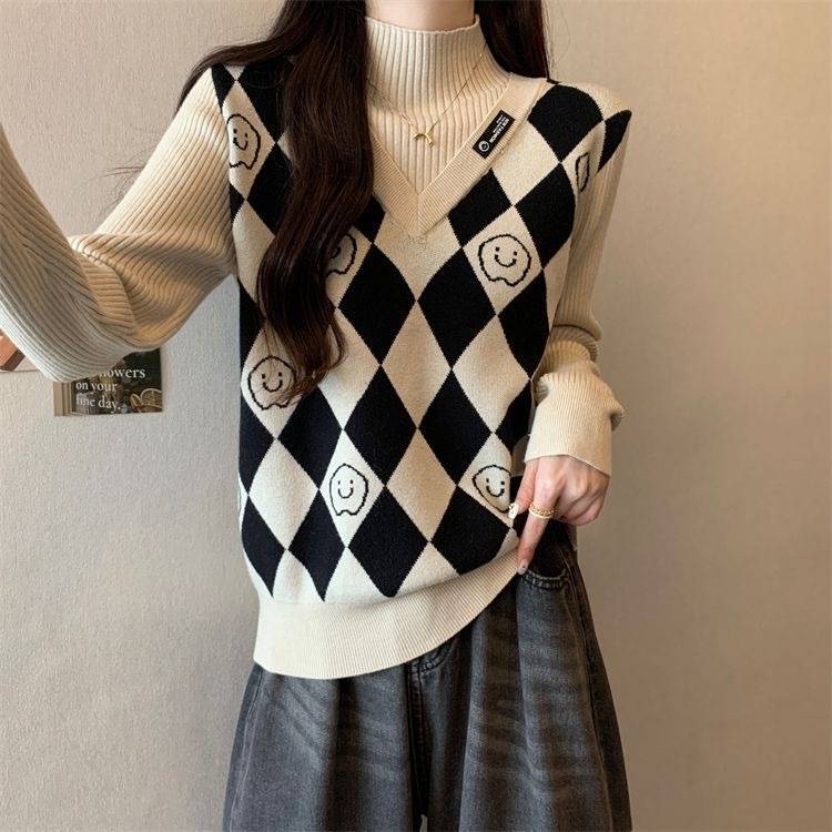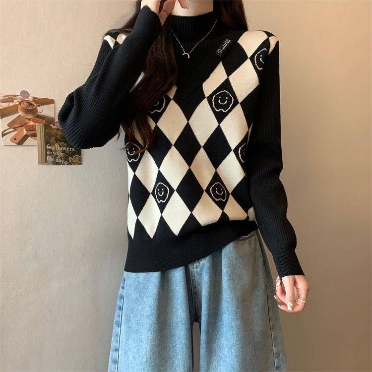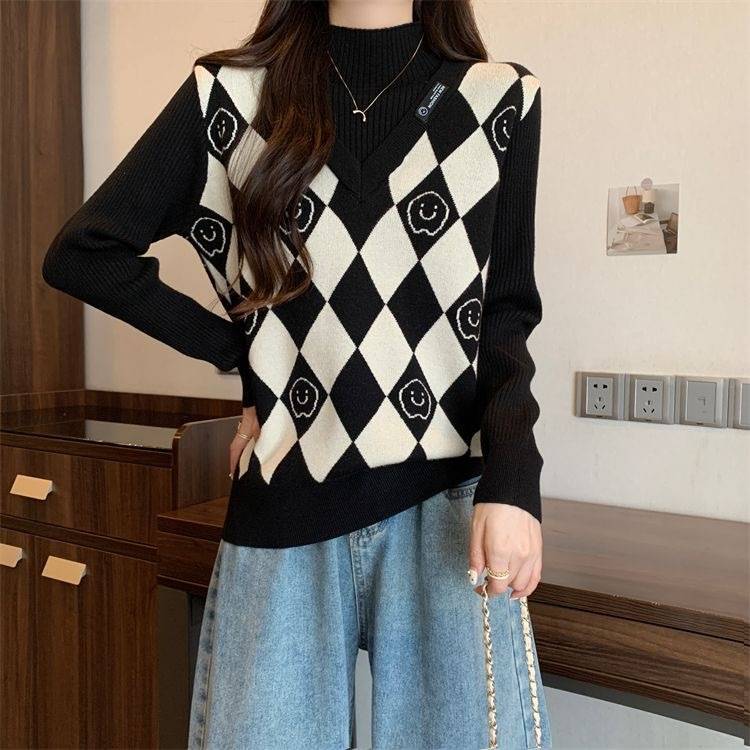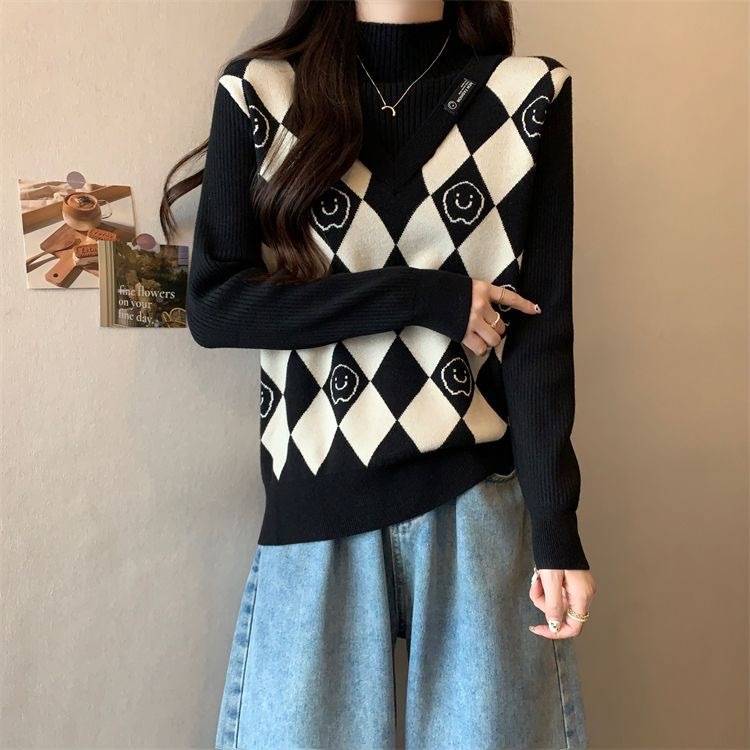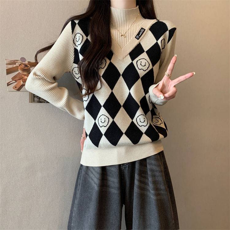 Camiseta de Punto para Fondo, Holgada, Aspecto Adelgazante, Color Contrastante, Top Exterior, Suéter de Cuello Alto Falso de Dos Piezas de Moda para Mujer en Otoño e Invierno