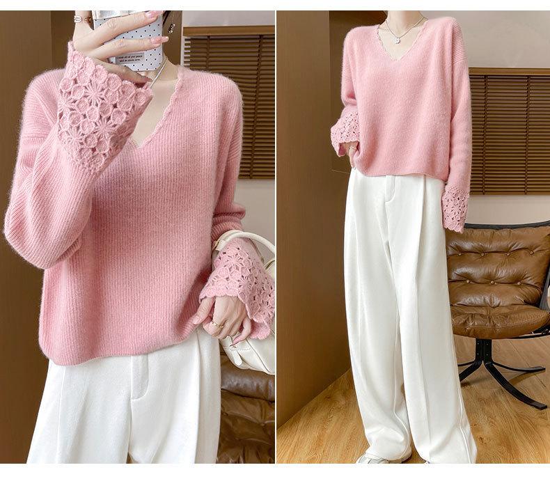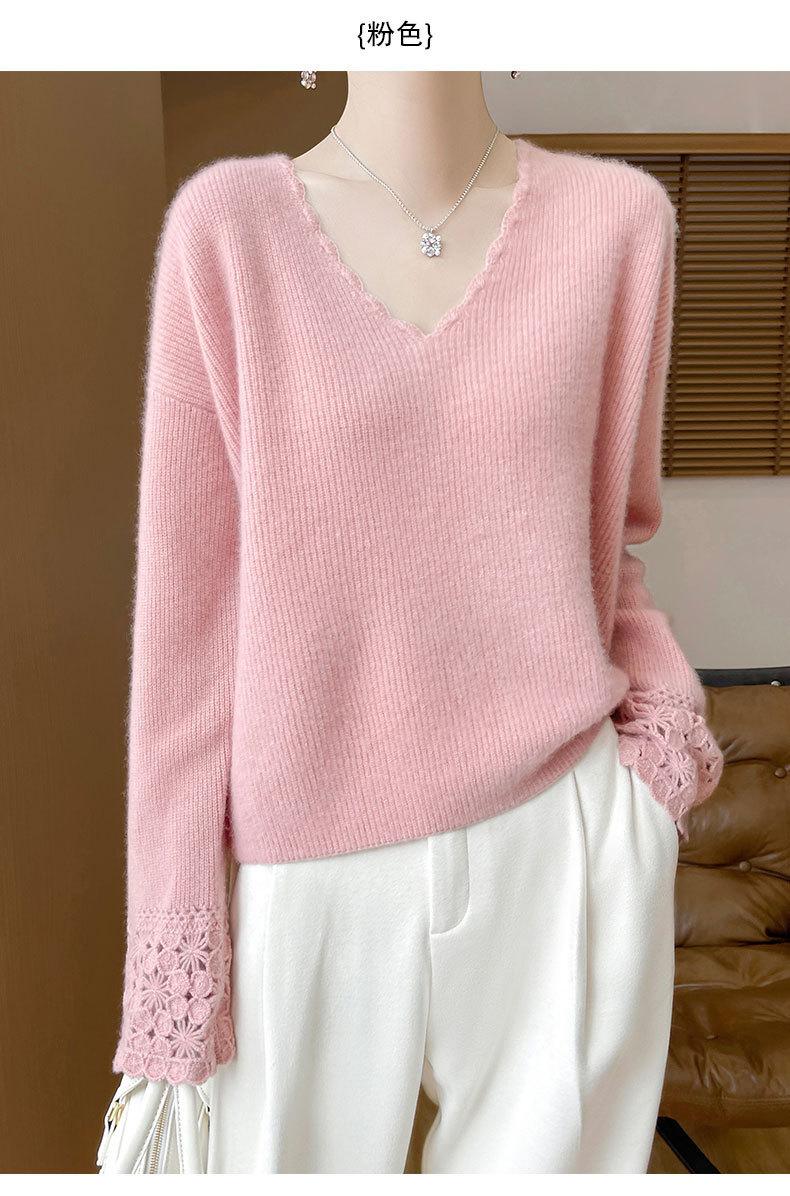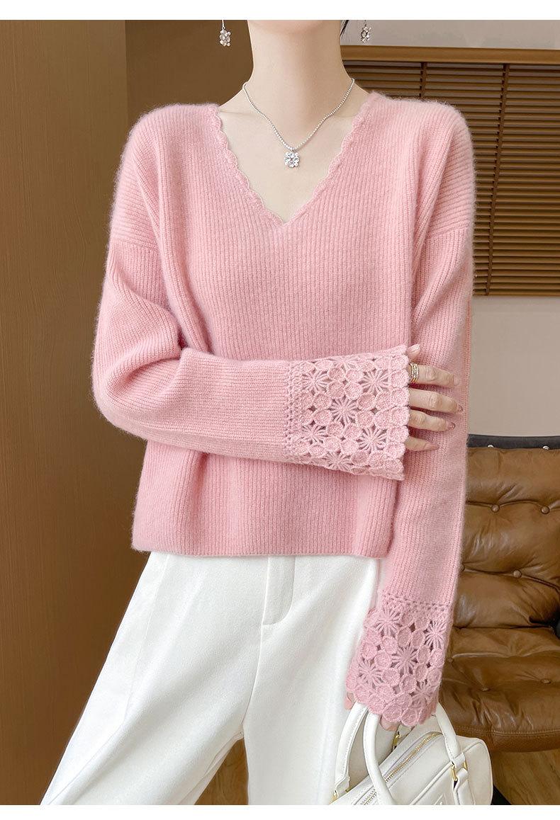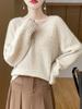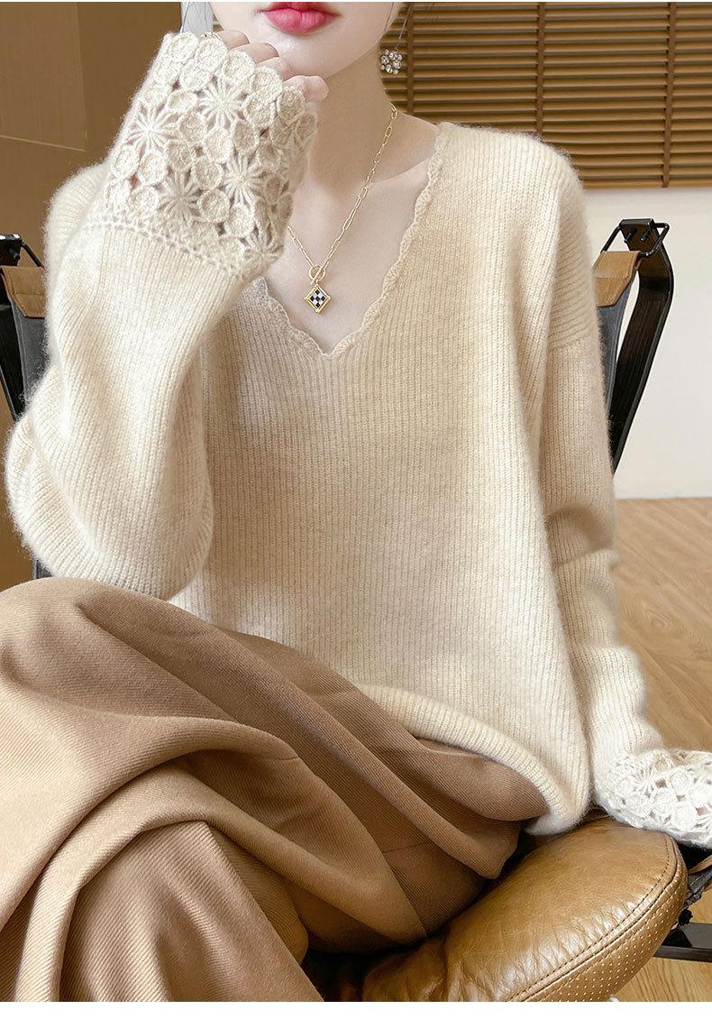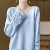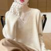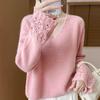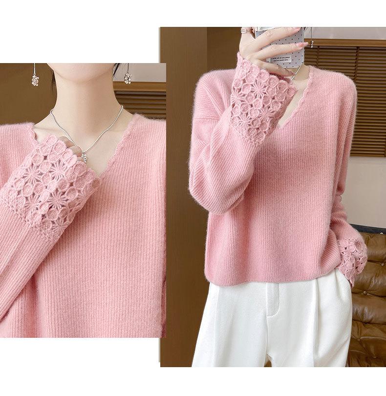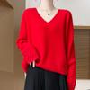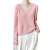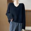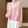 Suéter de lana calado de primavera y otoño para mujer, con cuello en V, manga larga, estilo holgado, elegante, ajustado, holgado, que cubre el vientre, suéter de cachemira que combina con todo.