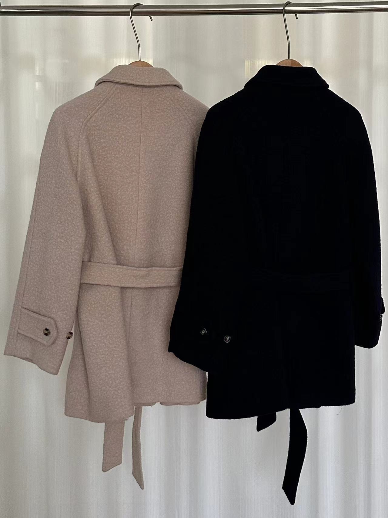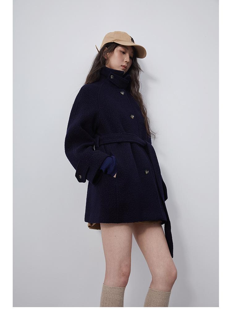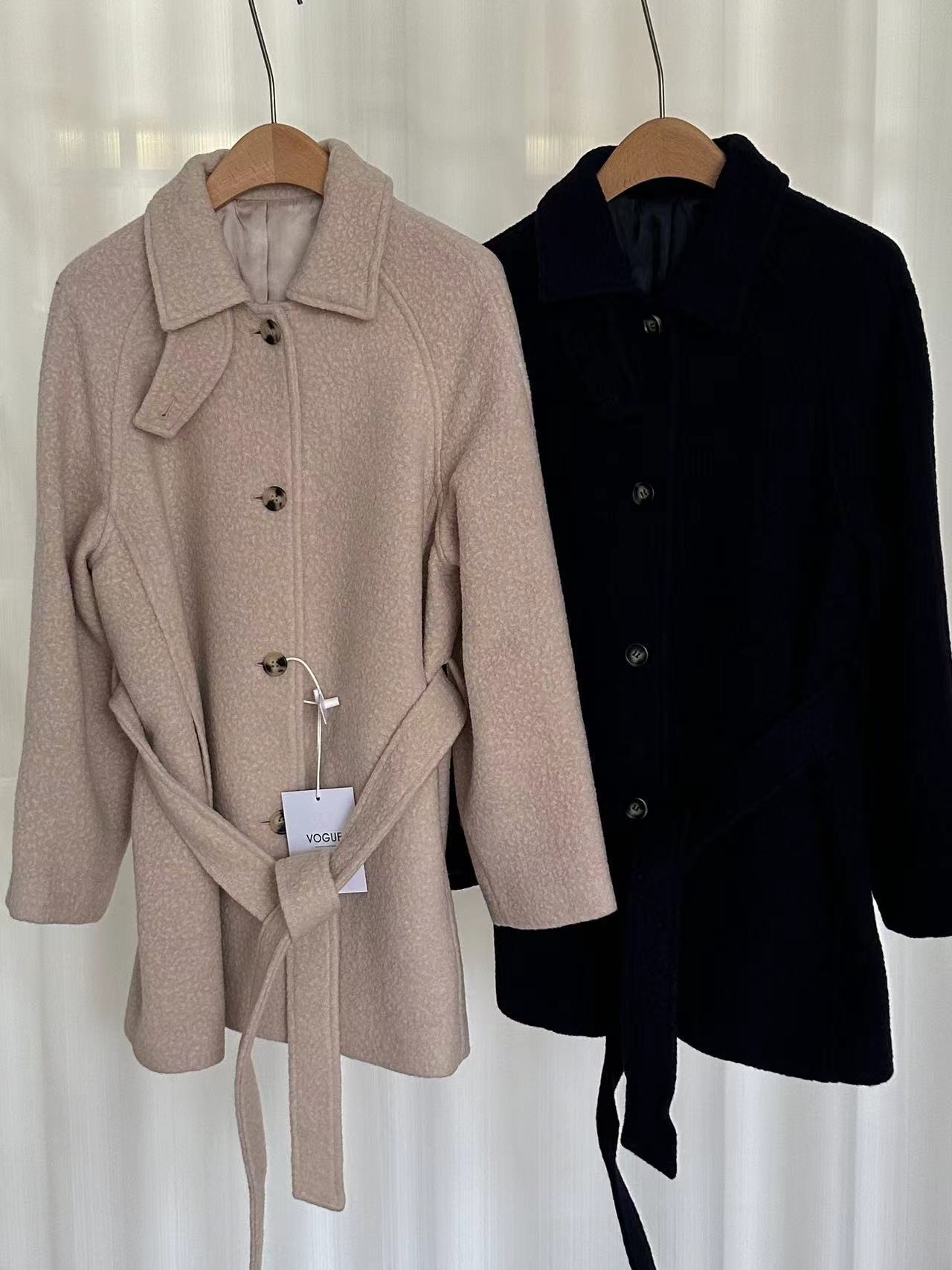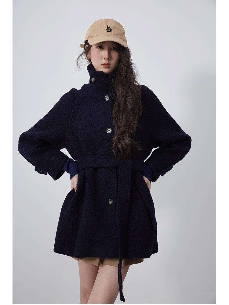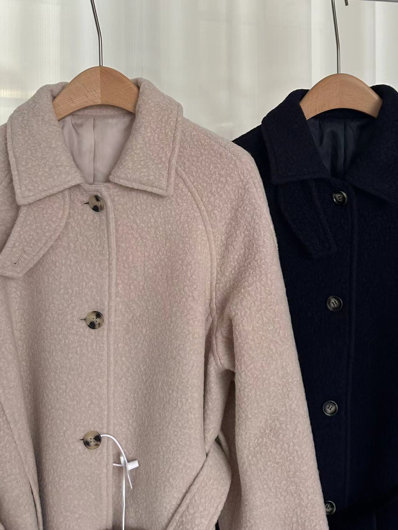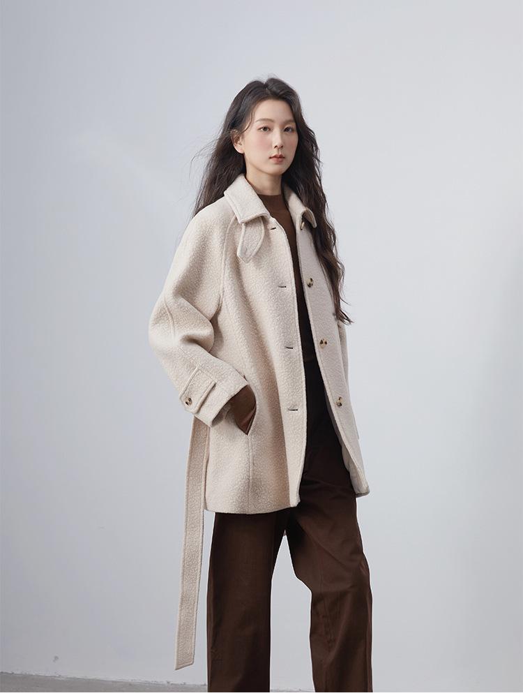 Abrigo de lana con cuello hecho en casa FP para mujer, abrigo coreano holgado de lana de longitud media con cordones para otoño e invierno, para mujeres pequeñas