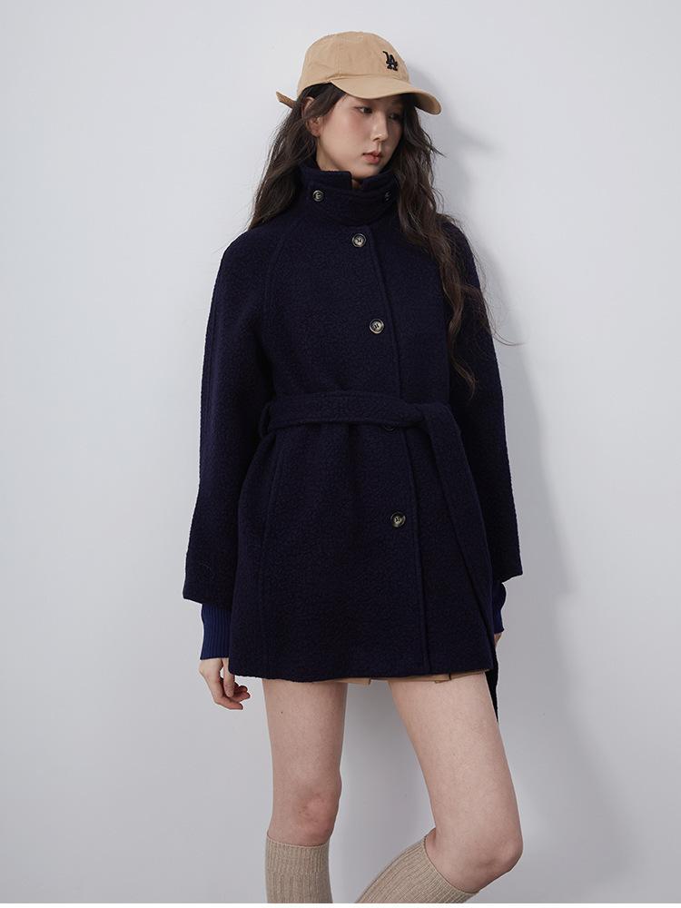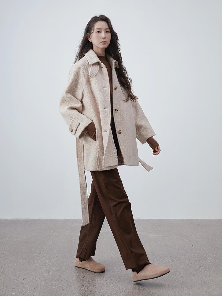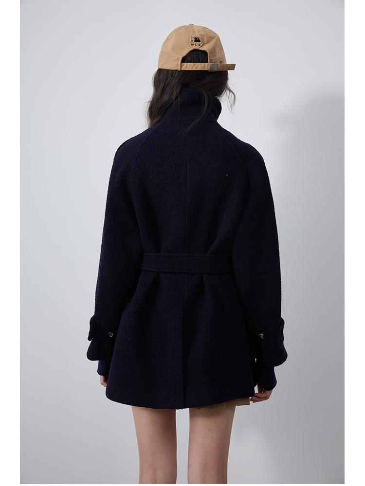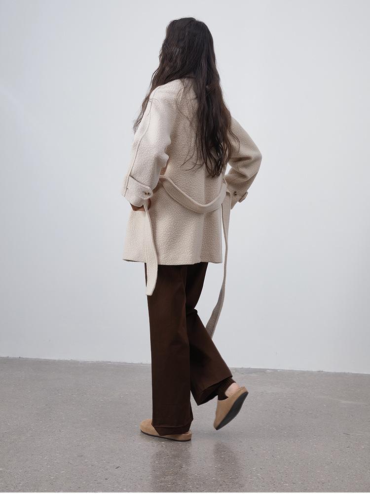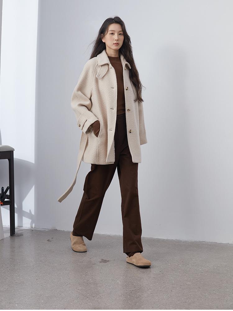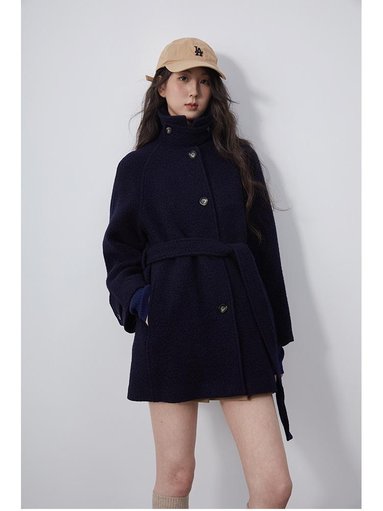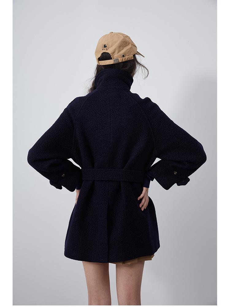Abrigo de lana con cuello hecho en casa FP para mujer, abrigo coreano holgado de lana de longitud media con cordones para otoño e invierno, para mujeres pequeñas