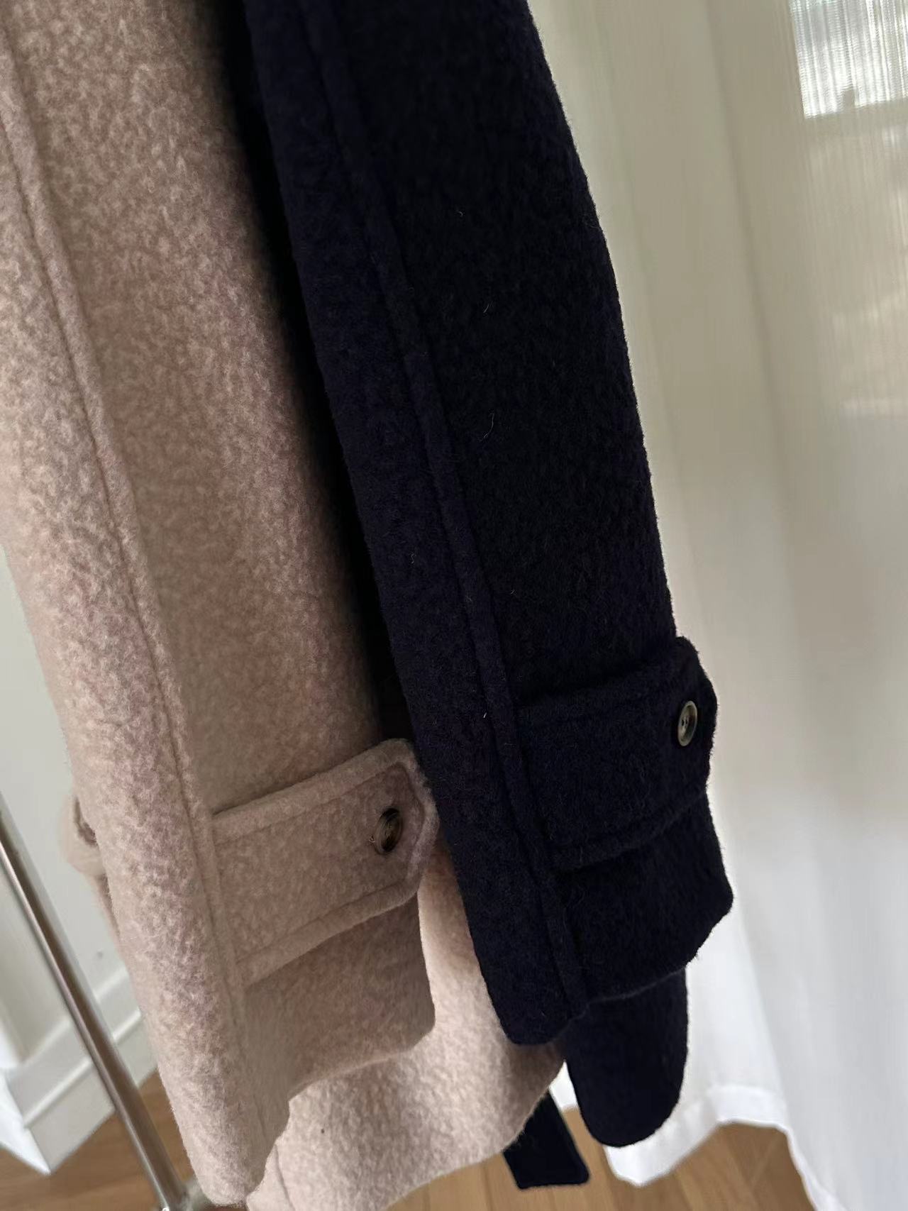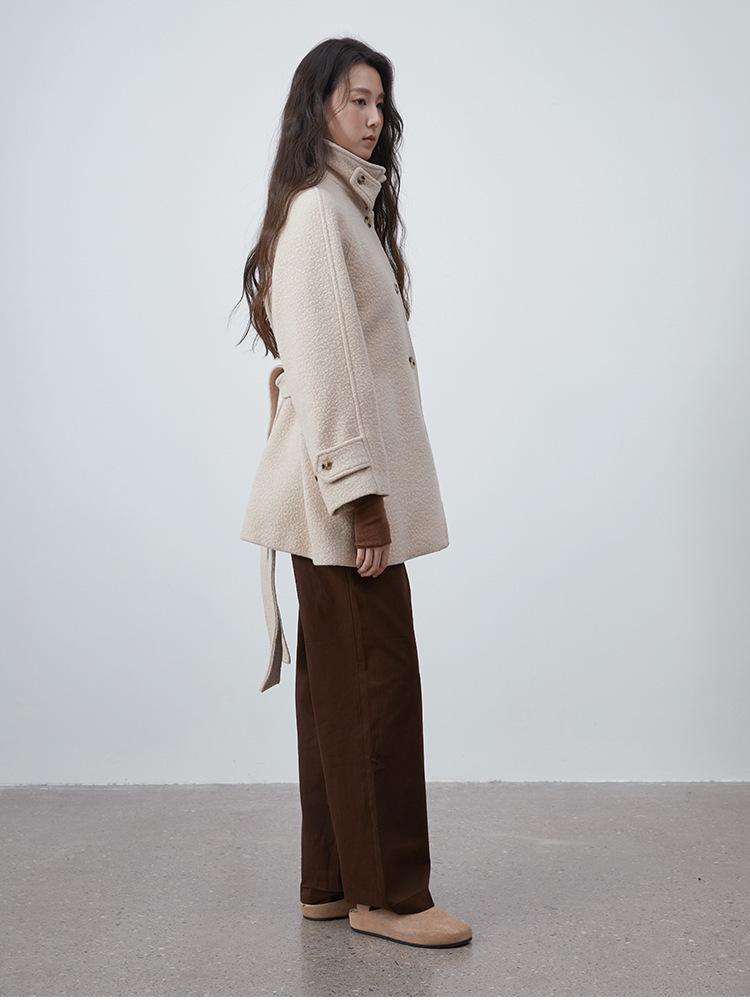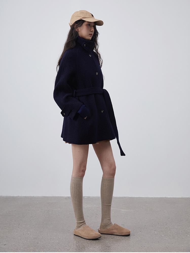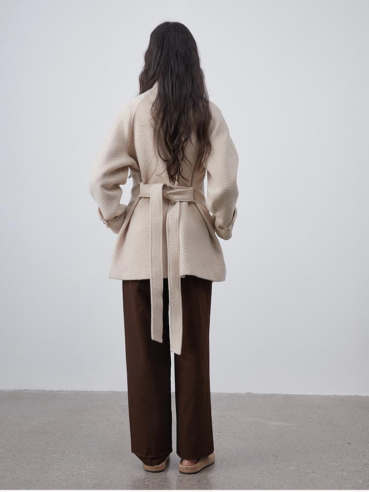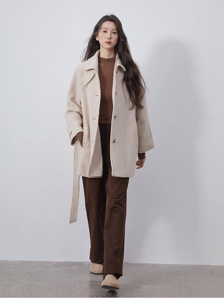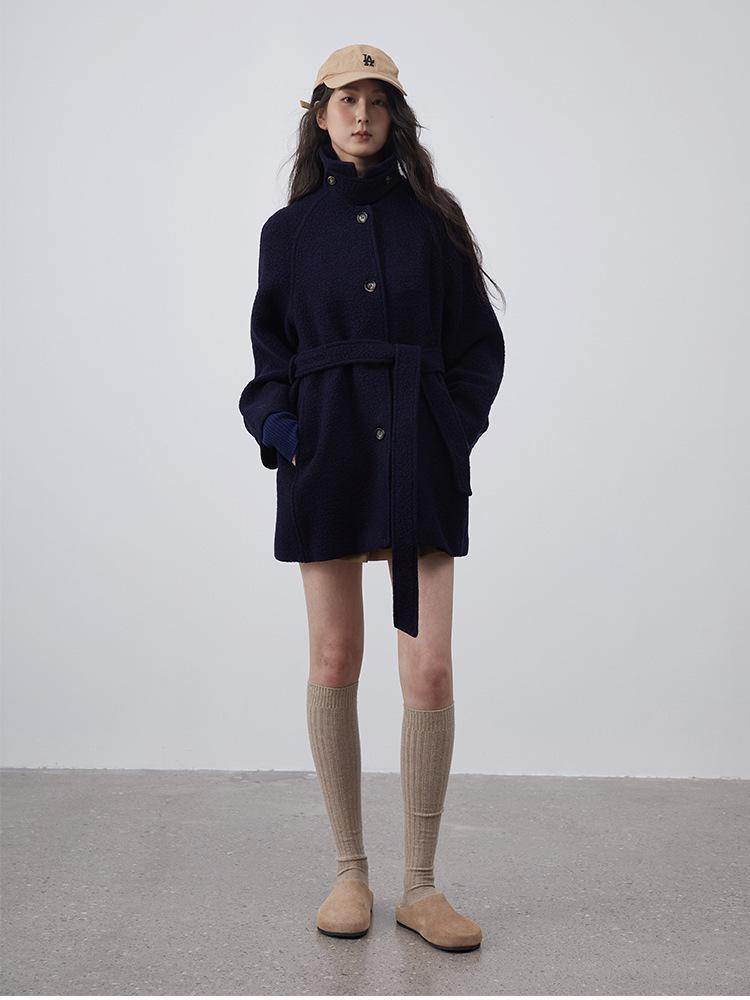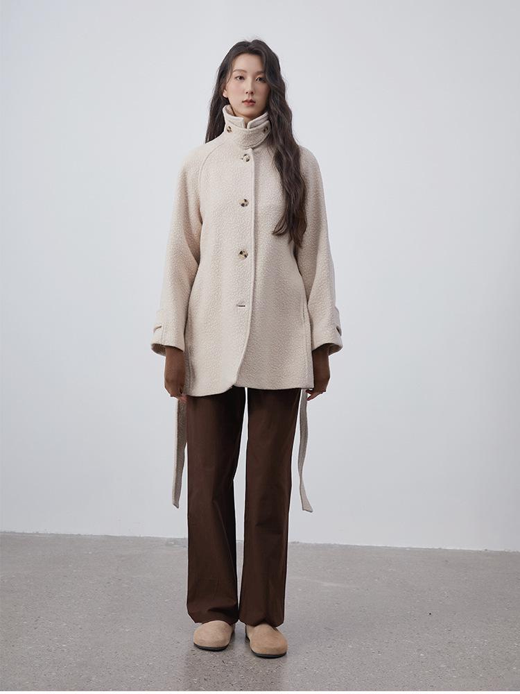 Abrigo de lana con cuello hecho en casa FP para mujer, abrigo coreano holgado de lana de longitud media con cordones para otoño e invierno, para mujeres pequeñas