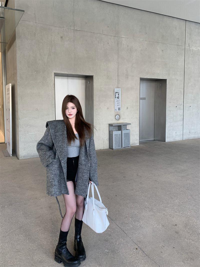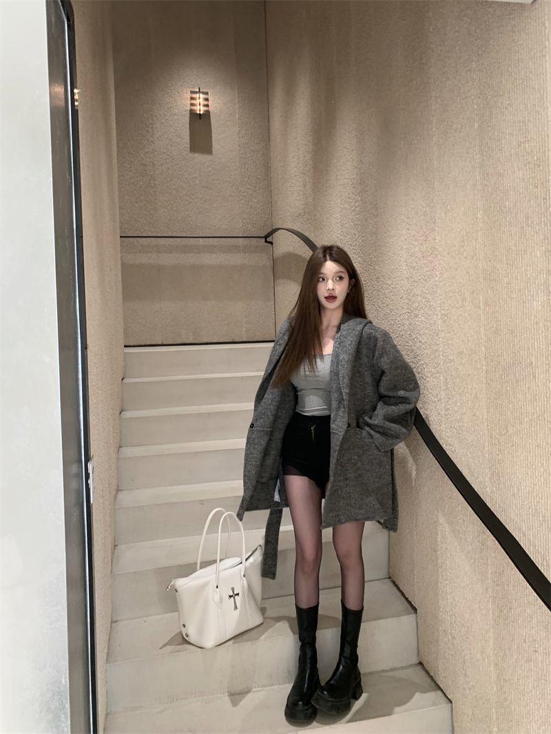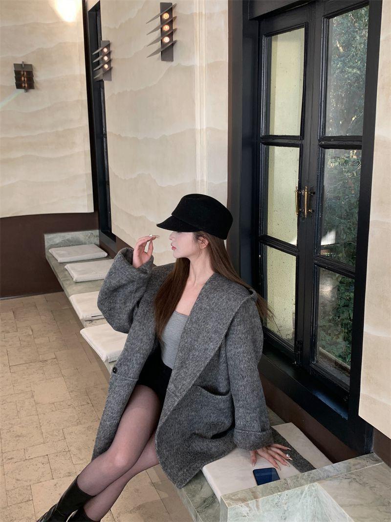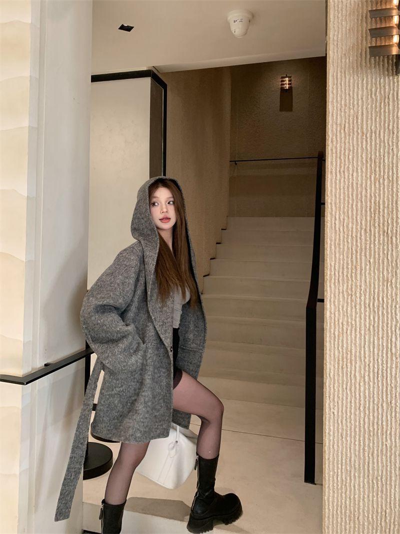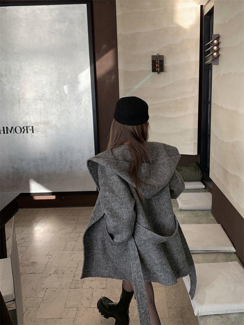 Abrigo de lana vintage gris con capucha y mangas largas para mujer, otoño e invierno, holgado, largo medio, elegante, tipo cárdigan de lana