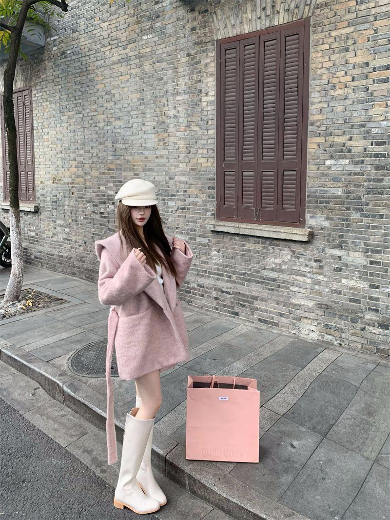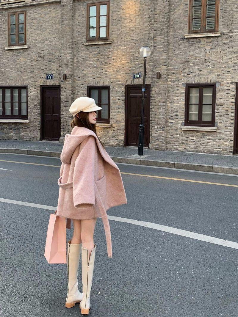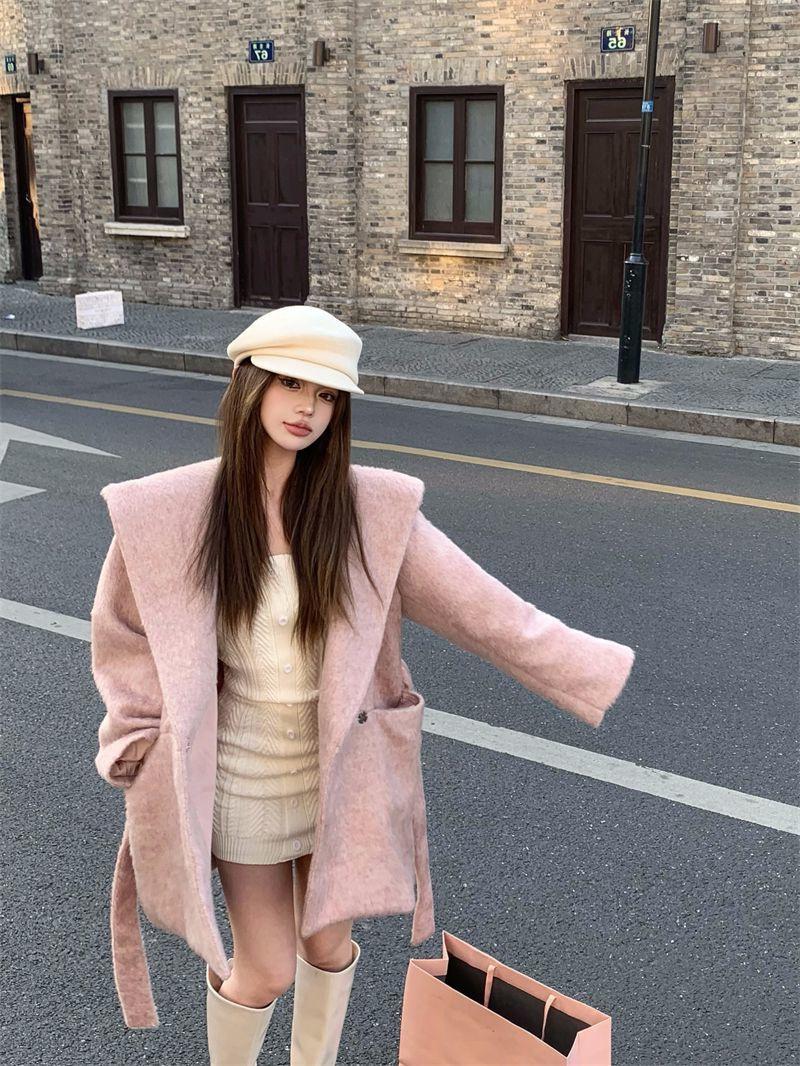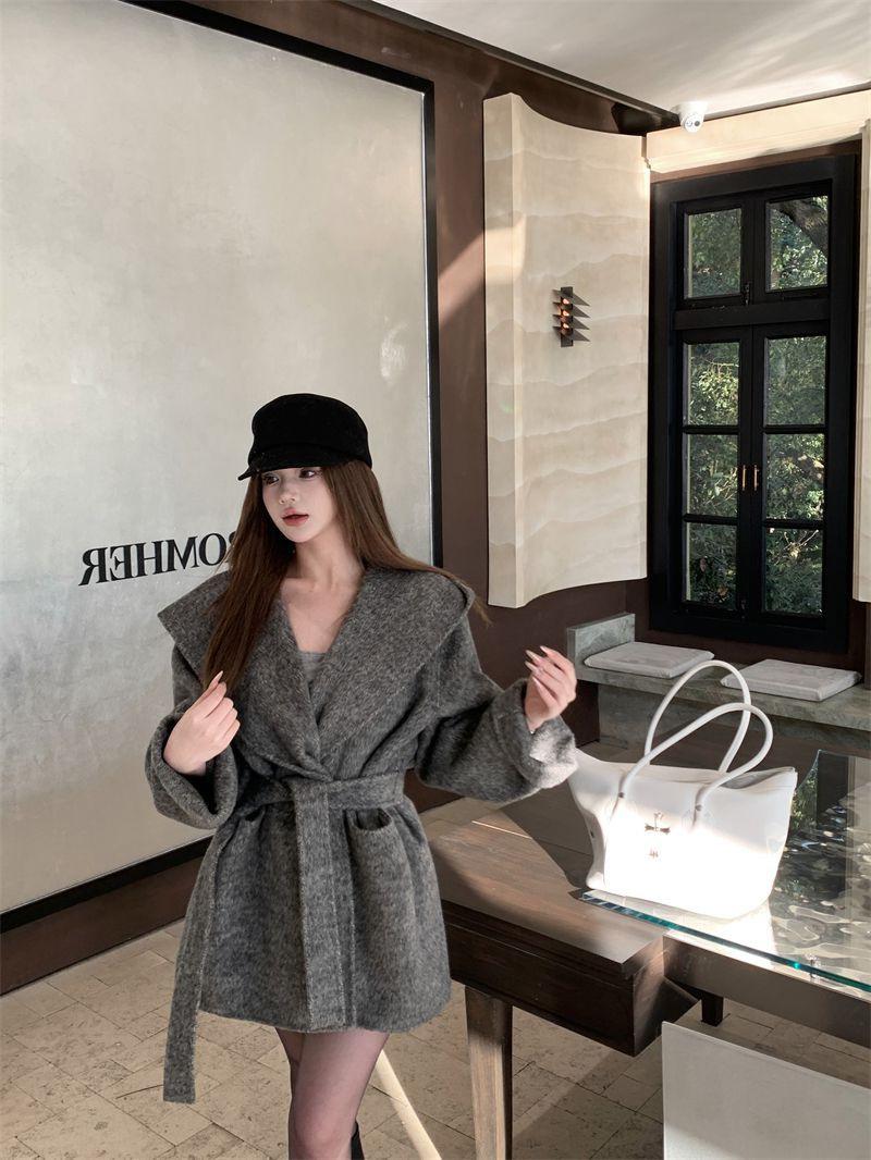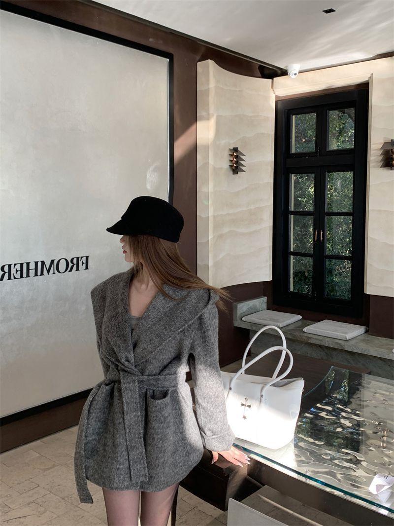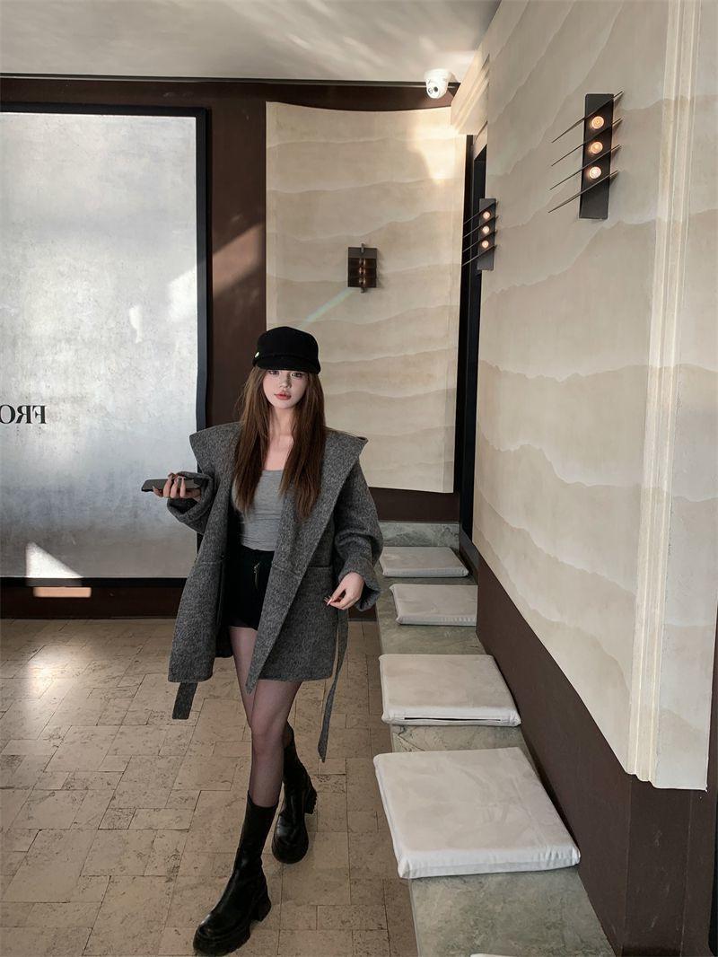 Abrigo de lana vintage gris con capucha y mangas largas para mujer, otoño e invierno, holgado, largo medio, elegante, tipo cárdigan de lana