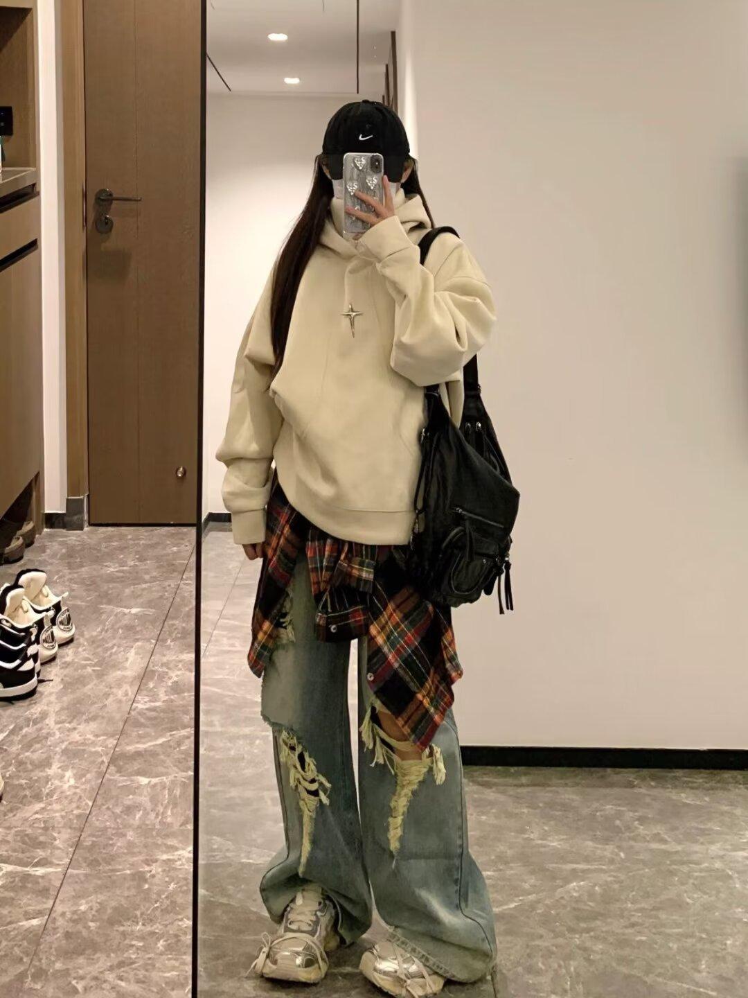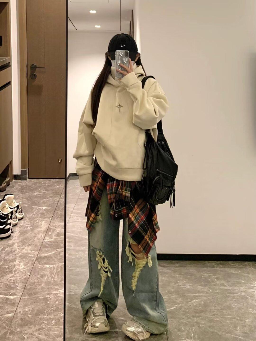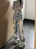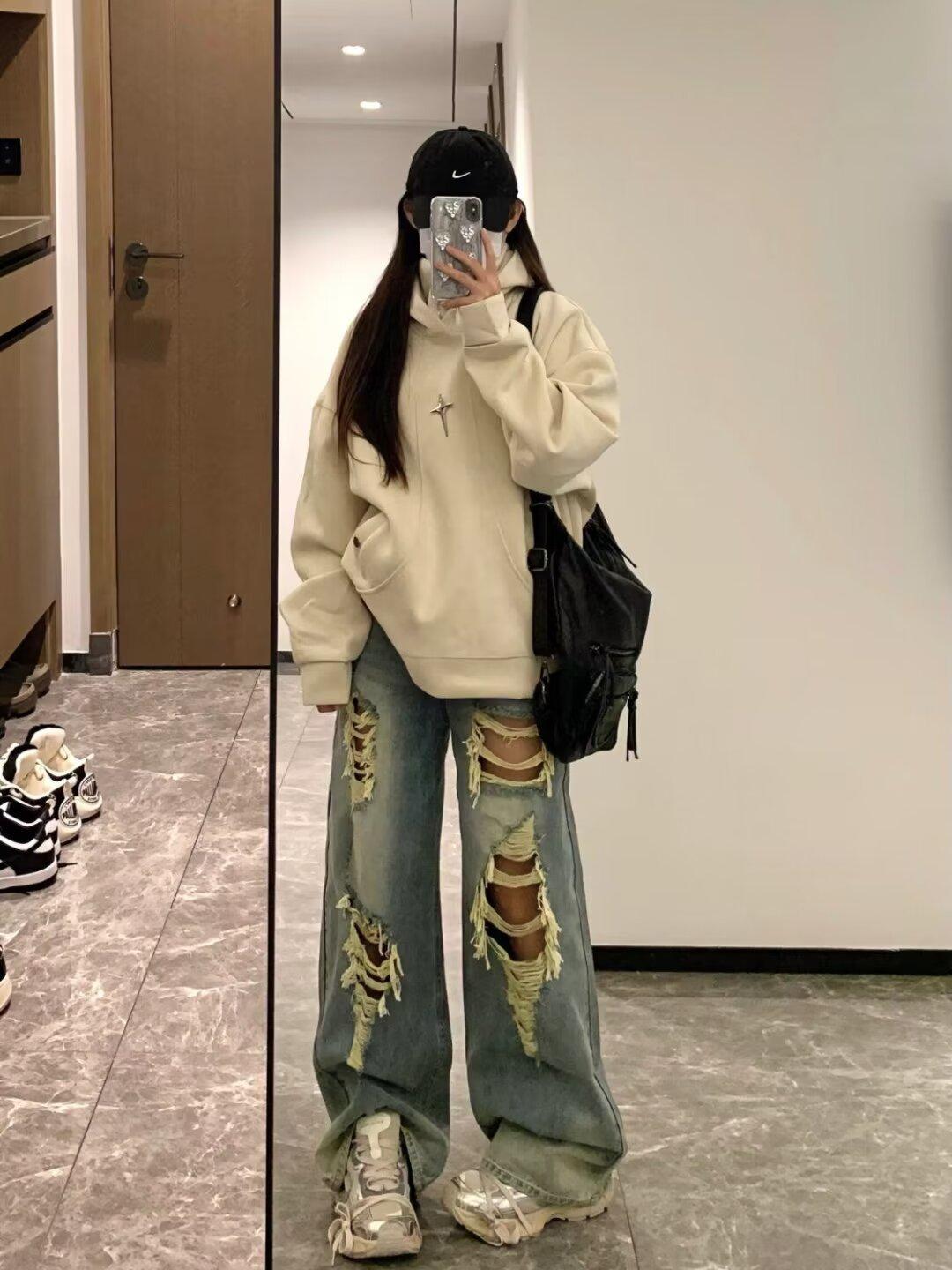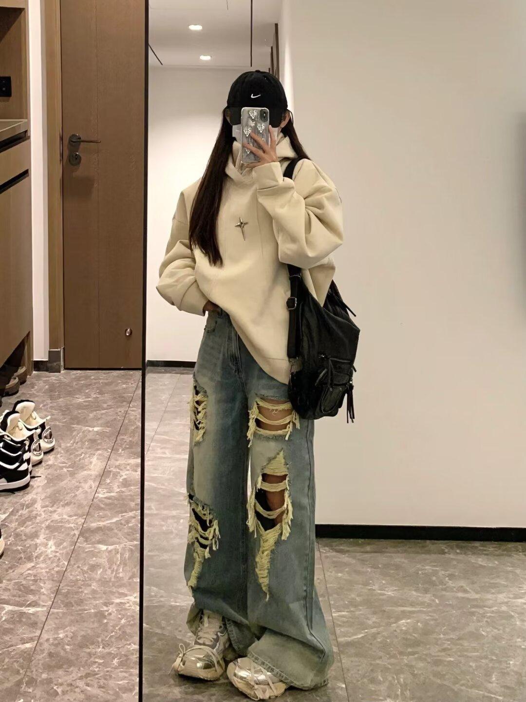 Pantalones vaqueros rasgados estilo americano retro lavados para mujer, novedad de verano 2024, cintura alta, sueltos, adelgazantes, pierna recta, pierna ancha
