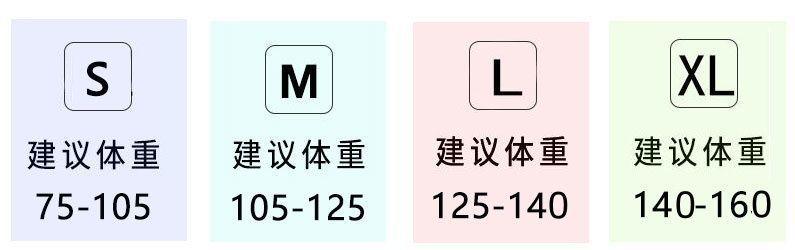 S recommend 37.5-52.5kg, M recommend 52.5-62.5kg, L recommend 62.5-70kg, Xl recommended 70-80kg