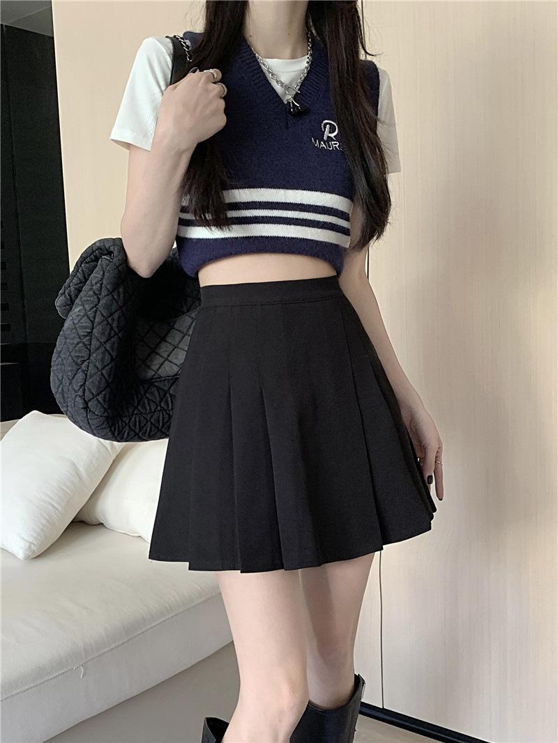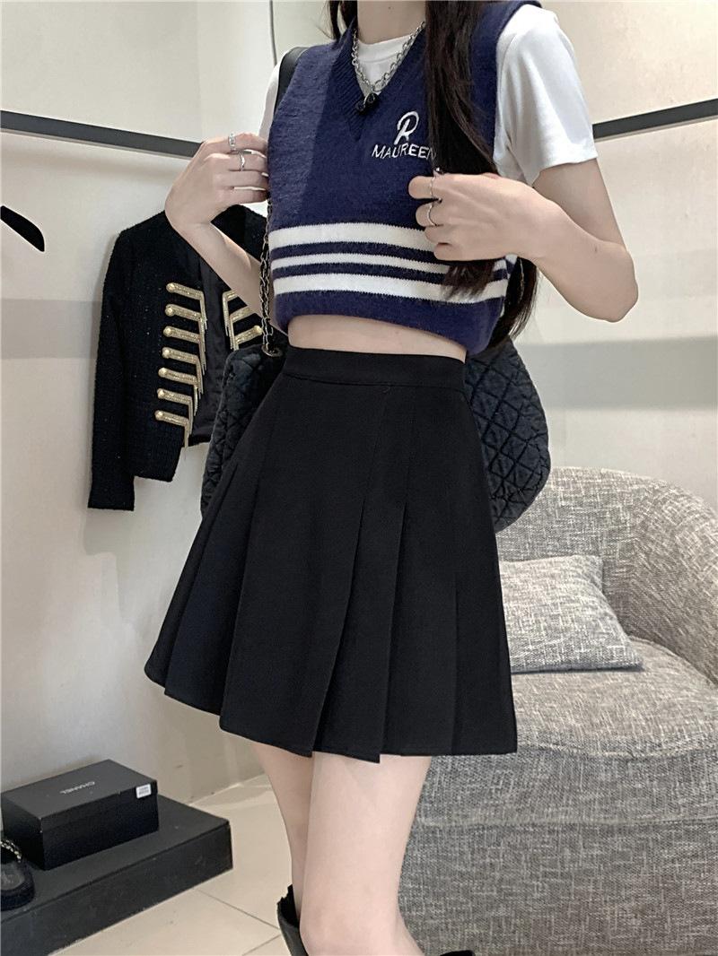 Falda Corta Plisada Negra de Talla Grande para Mujer Traje Otoño 2024 Petite Cintura Alta Adelgazante Falda Línea A