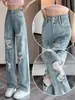 Pantalones vaqueros rasgados claros para mujer, nuevos pantalones de verano para chica gordita, de talla grande, de pierna ancha, pantalones rectos sueltos de cintura alta