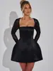 Vestido Sexy Escotado de Color Sólido con Cuello Cuadrado y Corte A para Mujer Invierno 2024 Nuevo Distintivo Encaje con Costuras Vestido de Manga Larga