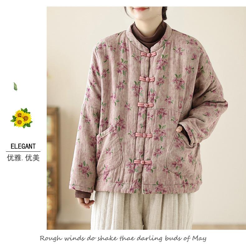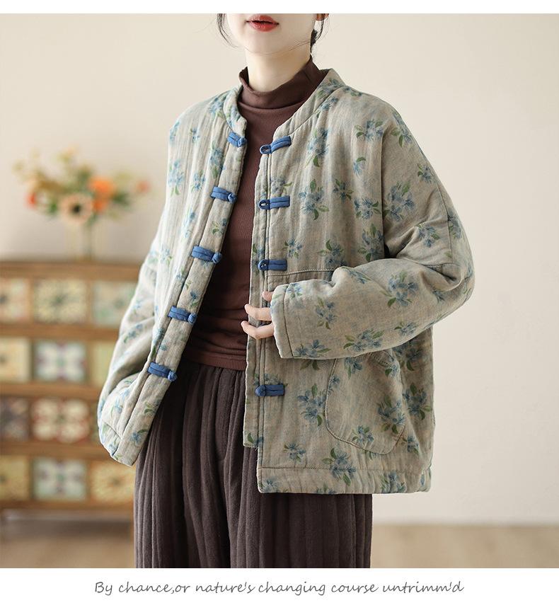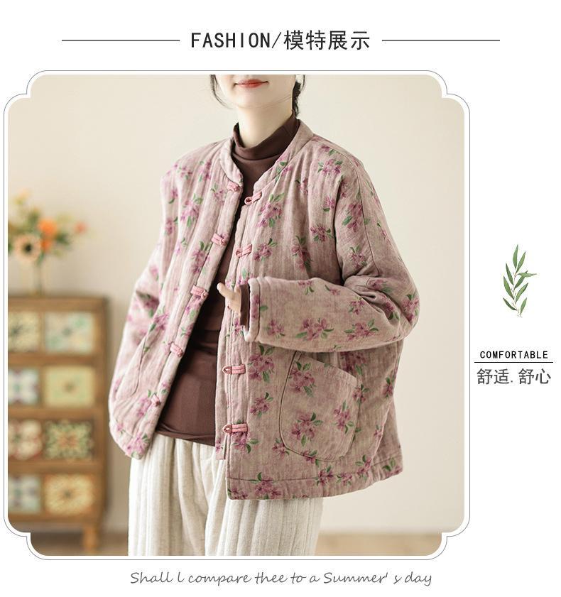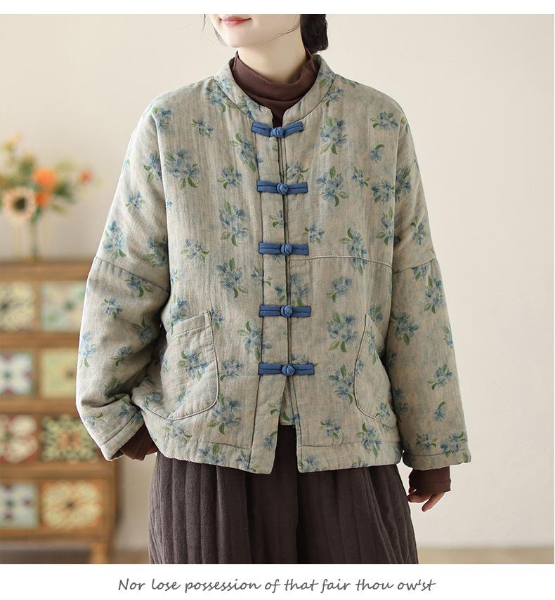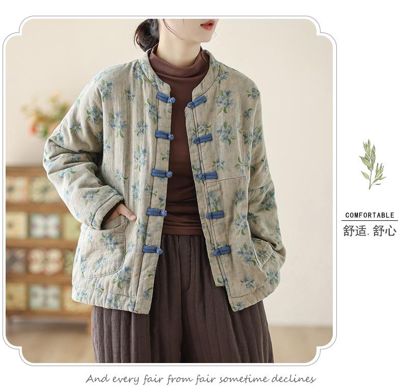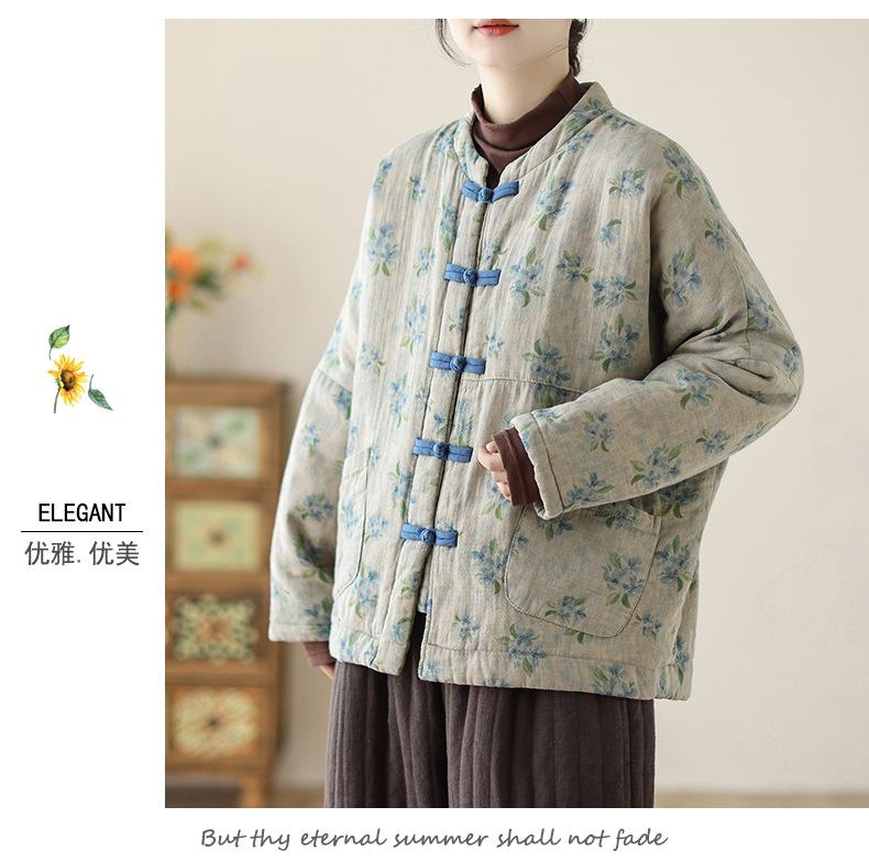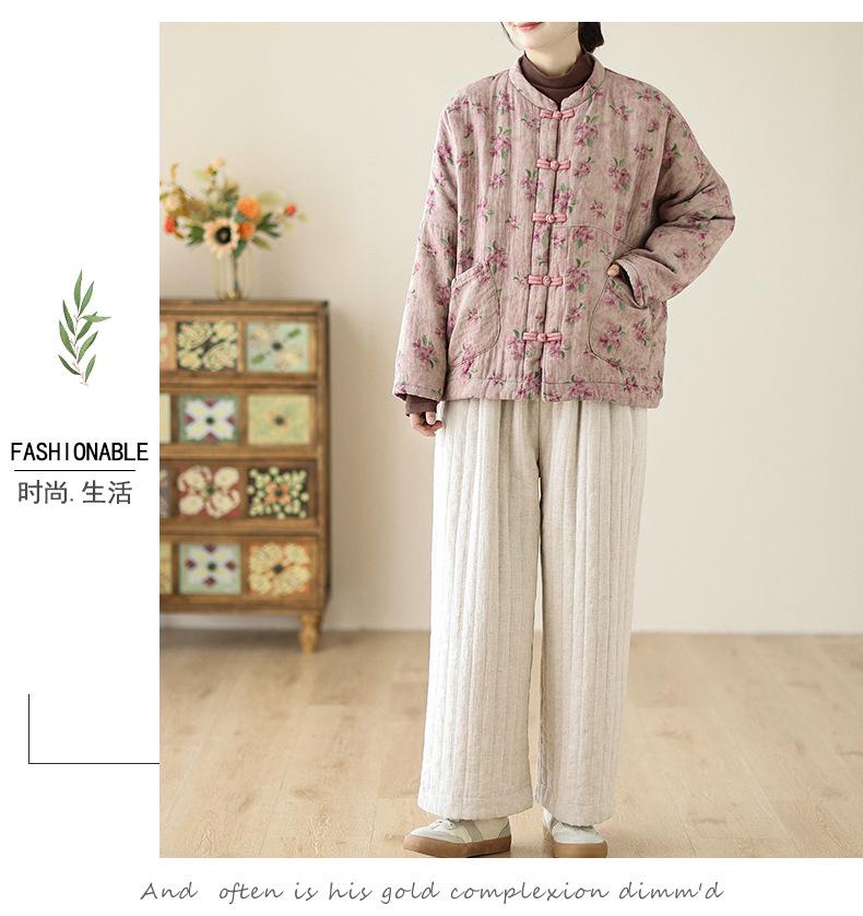 Nueva chaqueta acolchada de algodón estilo chino con botones retro, abrigo cálido holgado y acolchado de algodón con estampado artístico para mujer