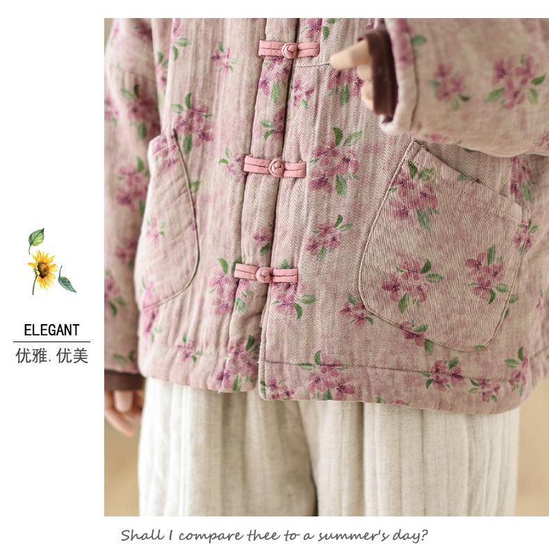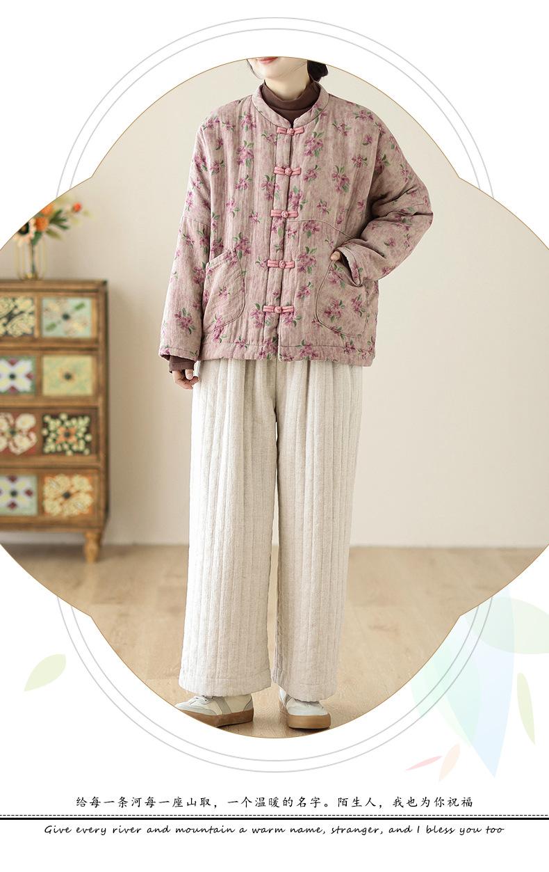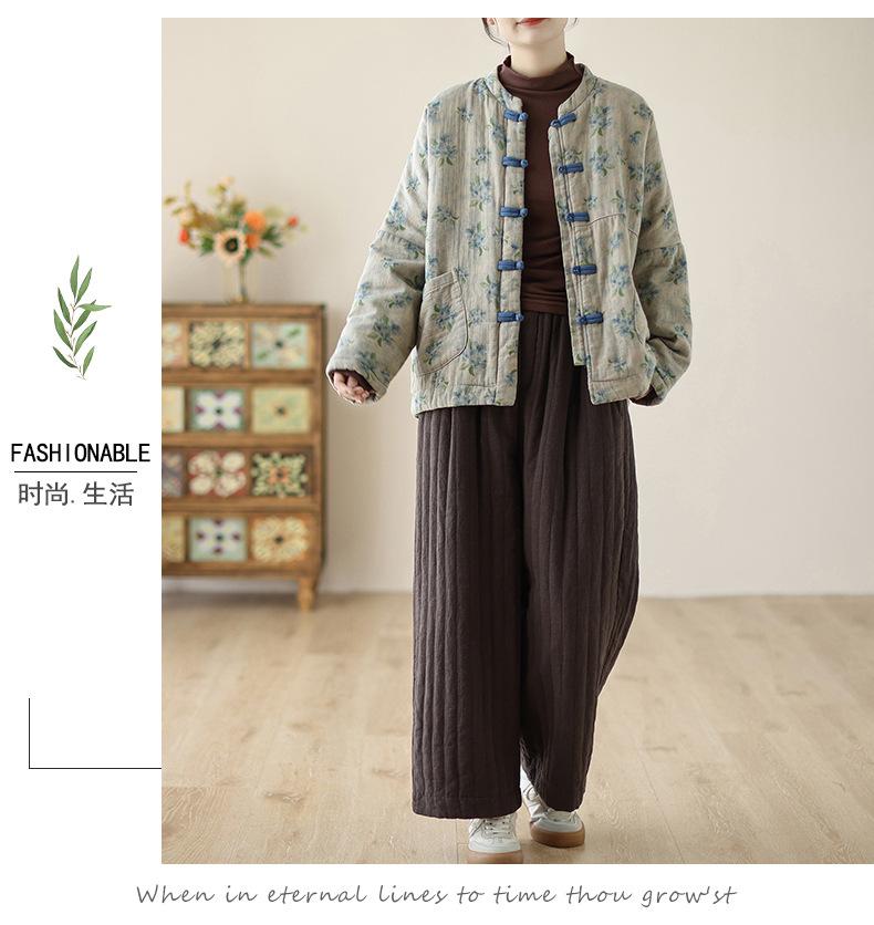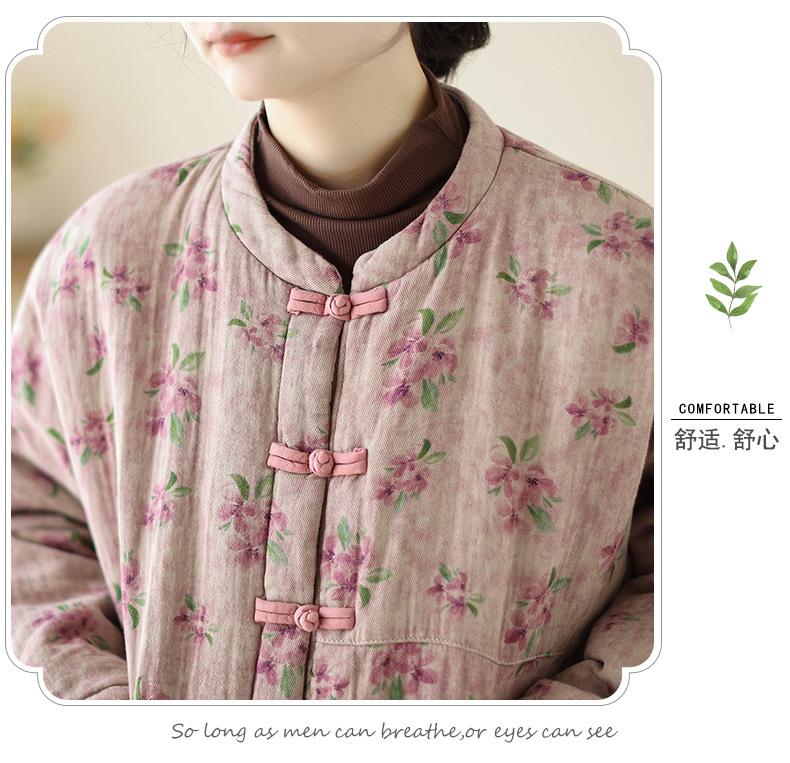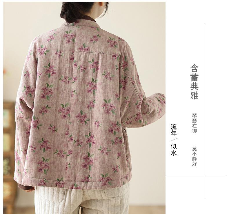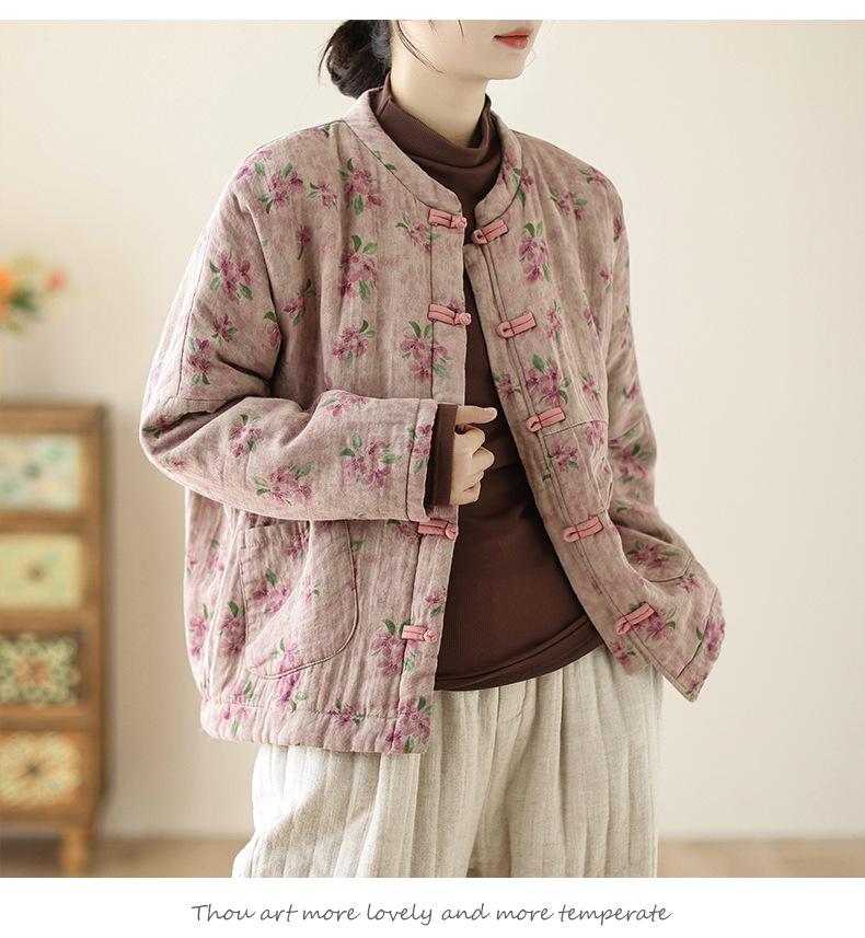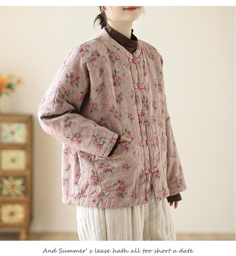 Nueva chaqueta acolchada de algodón estilo chino con botones retro, abrigo cálido holgado y acolchado de algodón con estampado artístico para mujer