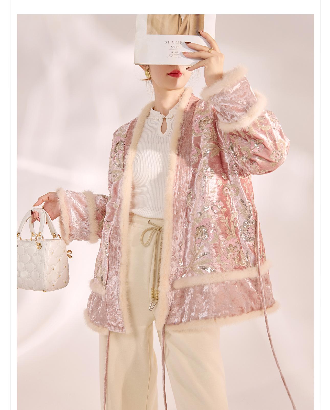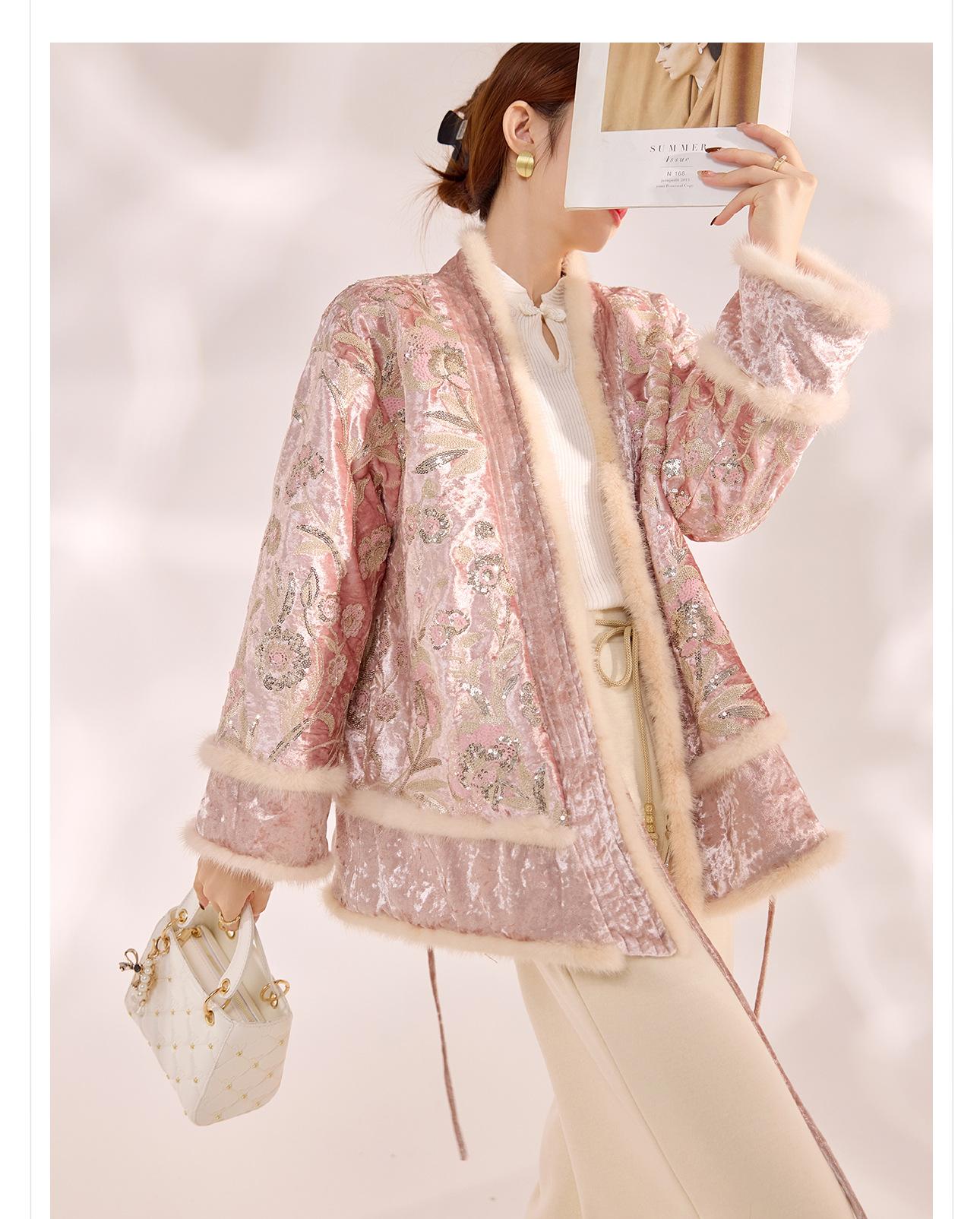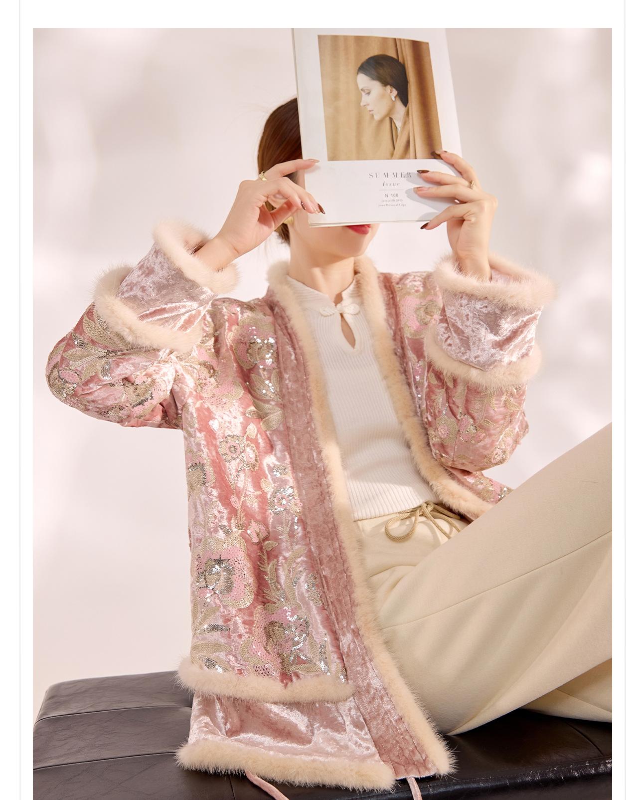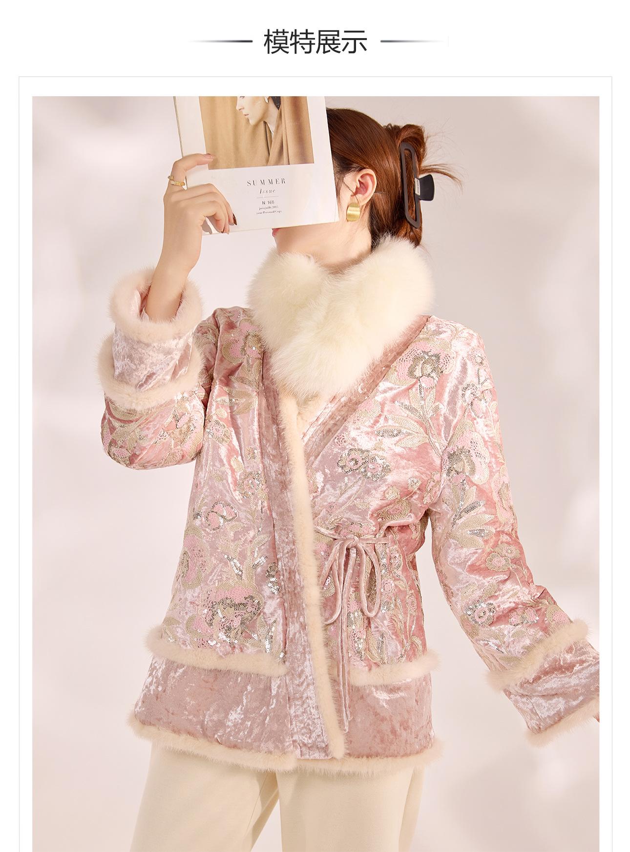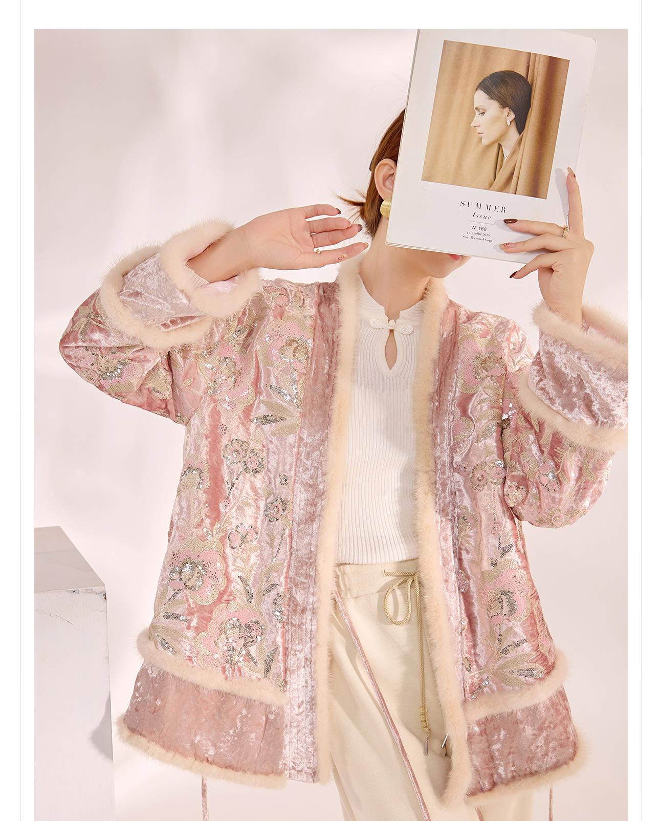 Invierno 2025 Nuevo Estilo Estilo Nacional Lentejuelas Bordadas Diseño de Empalme de Piel Nueva Chaqueta de Algodón Chinoiserie para Mujer Mx128