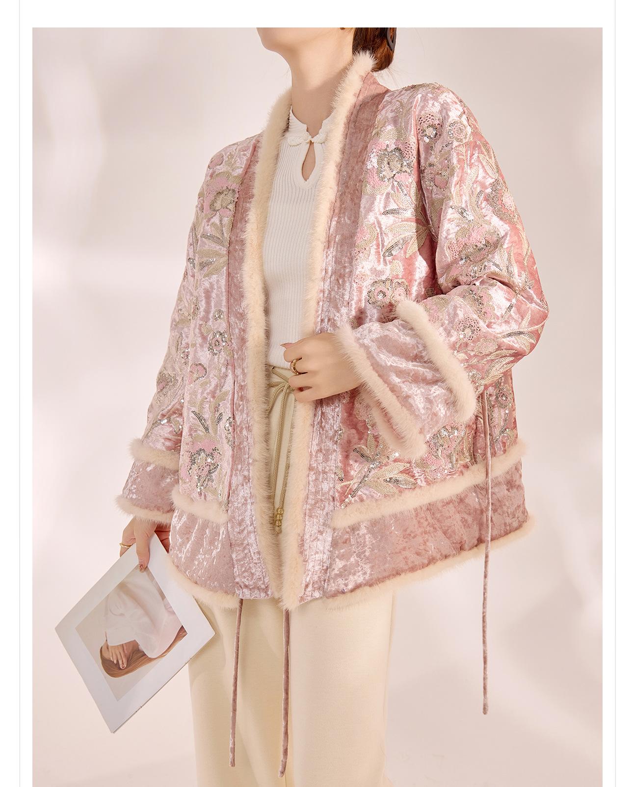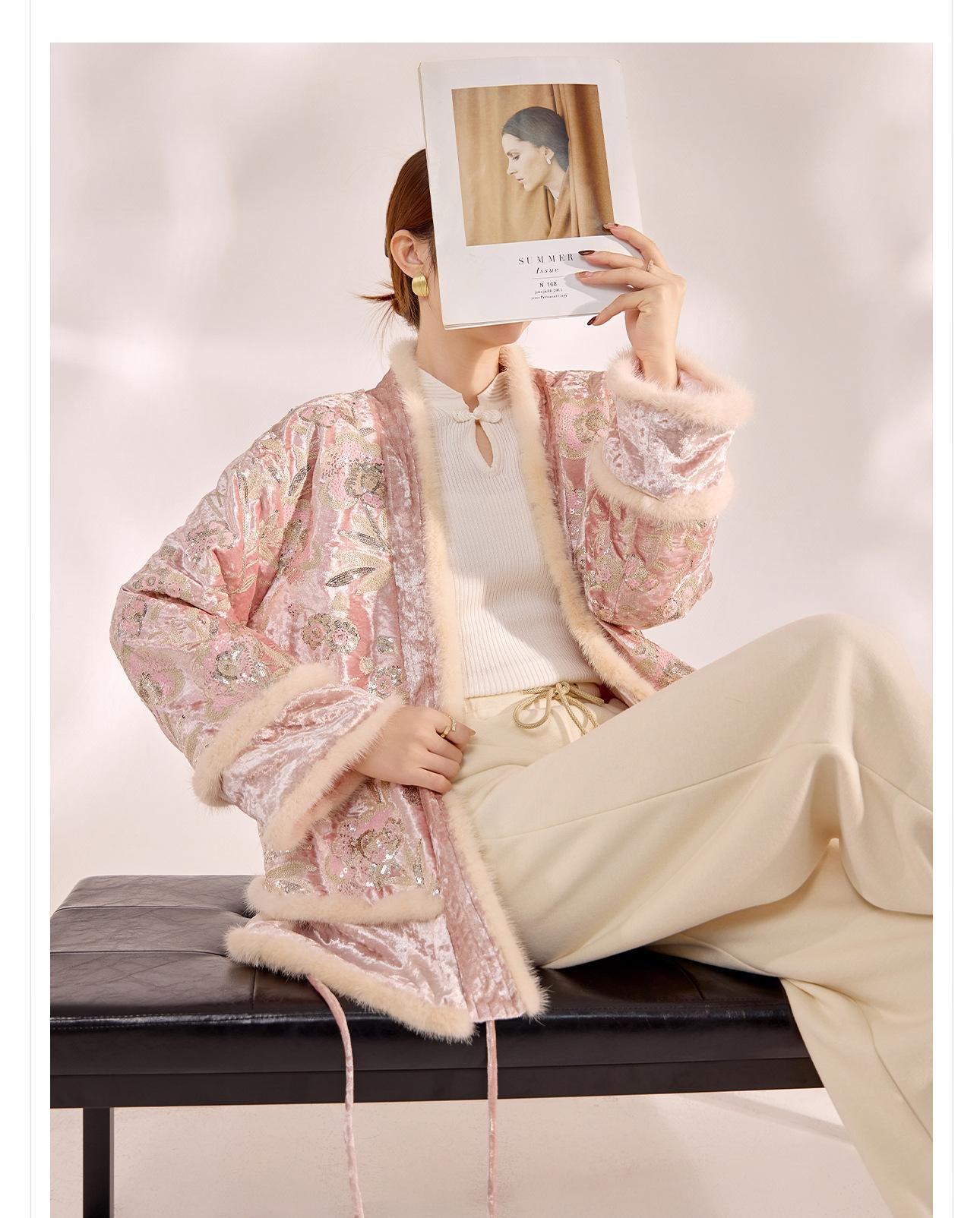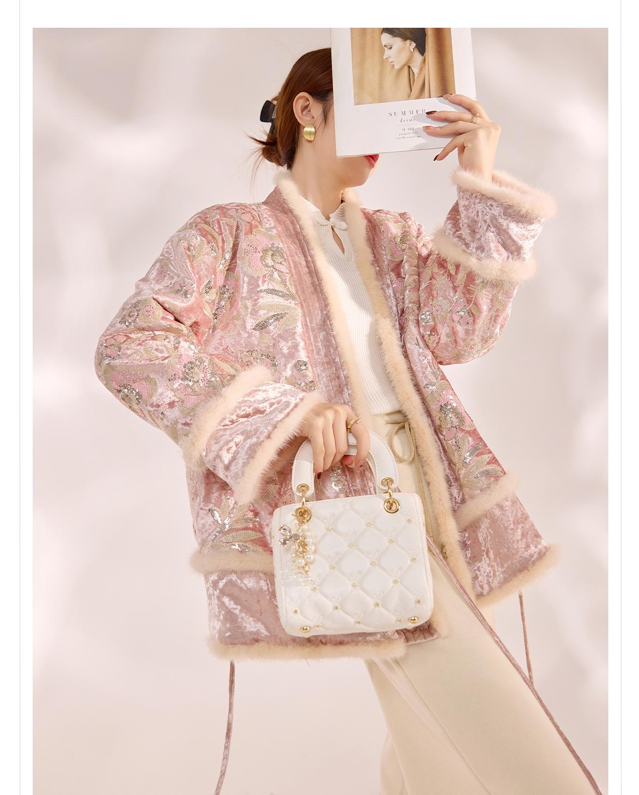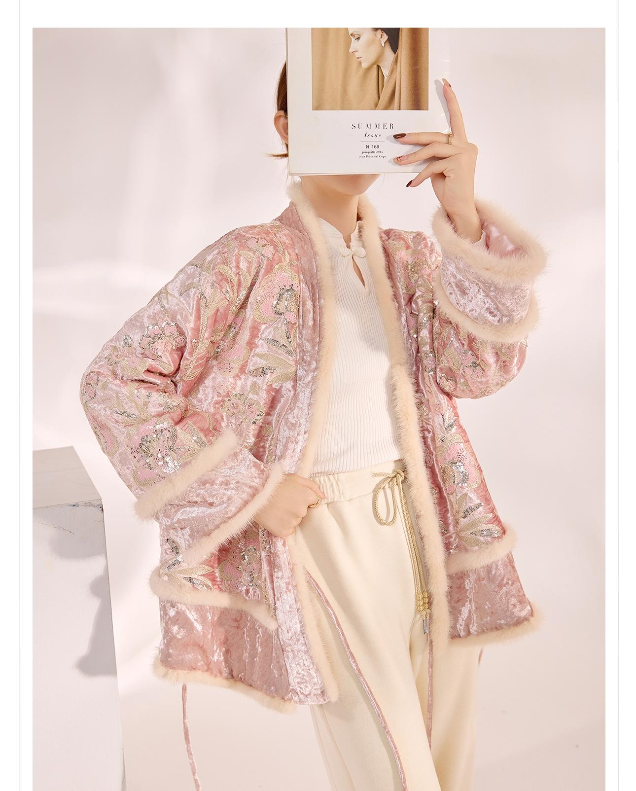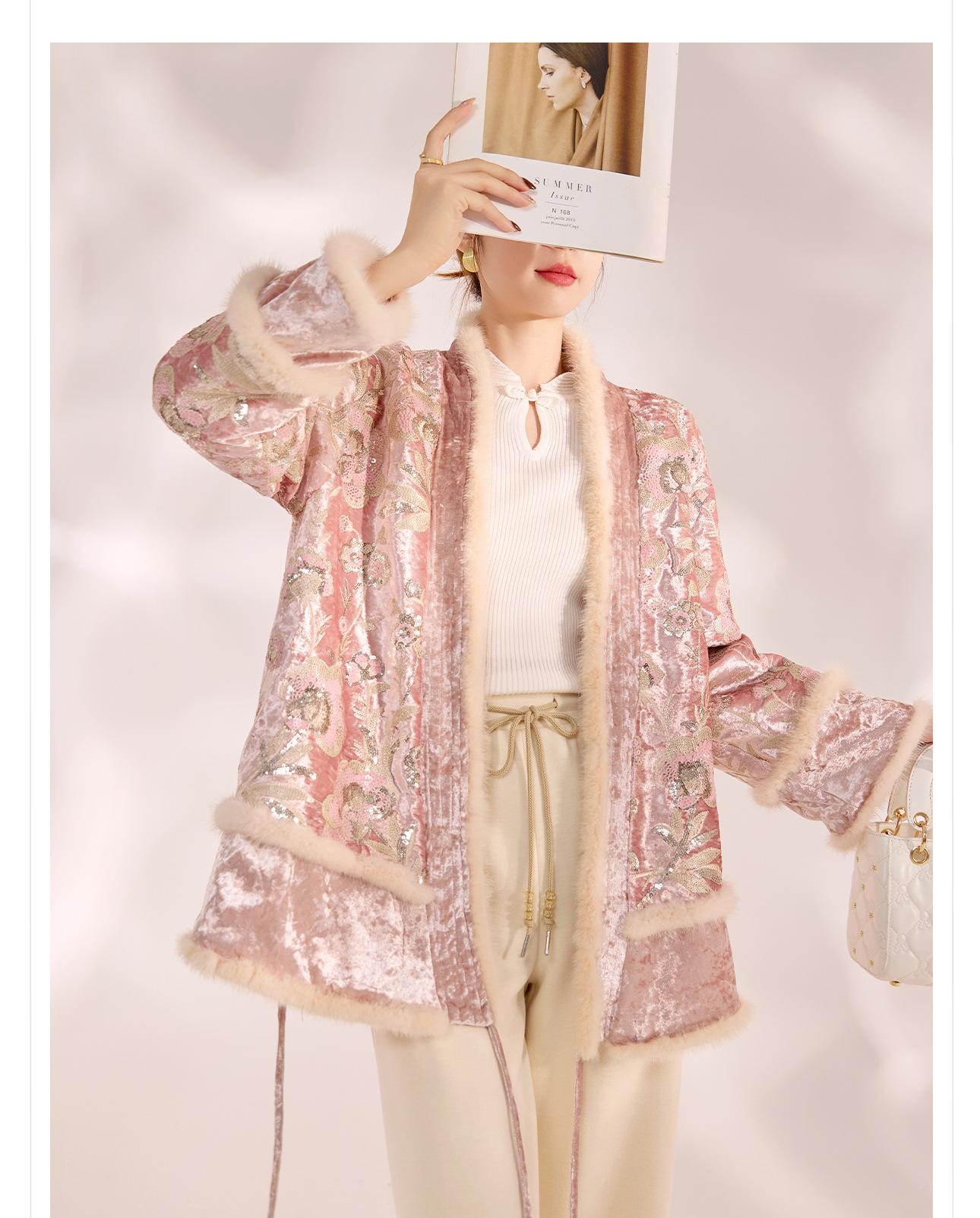 Invierno 2025 Nuevo Estilo Estilo Nacional Lentejuelas Bordadas Diseño de Empalme de Piel Nueva Chaqueta de Algodón Chinoiserie para Mujer Mx128