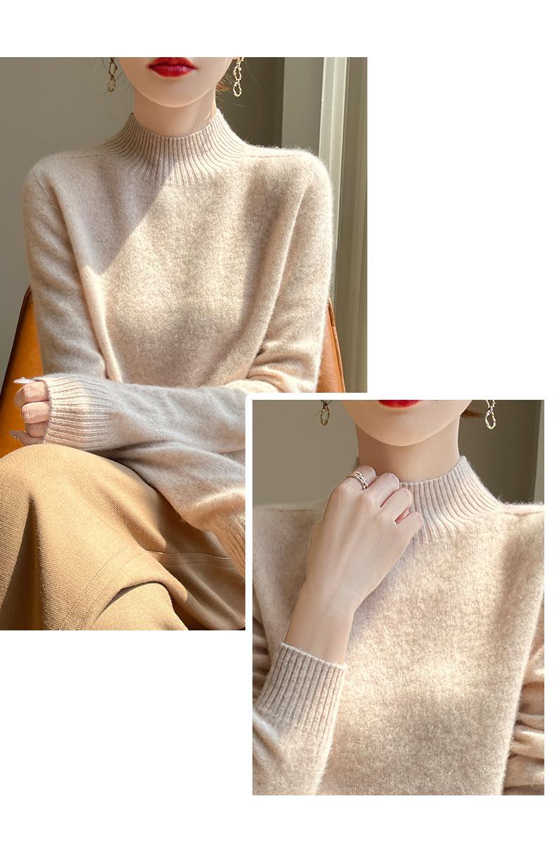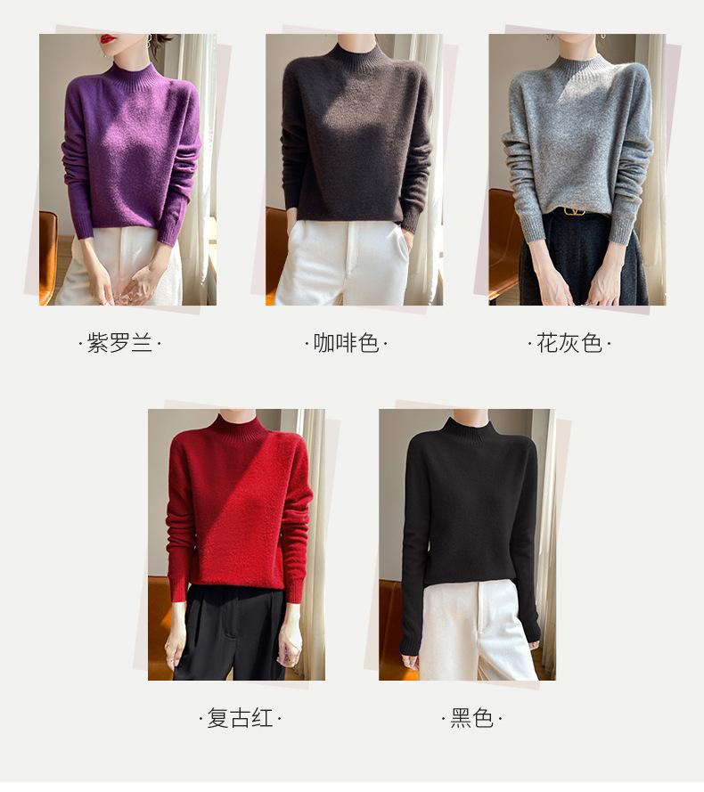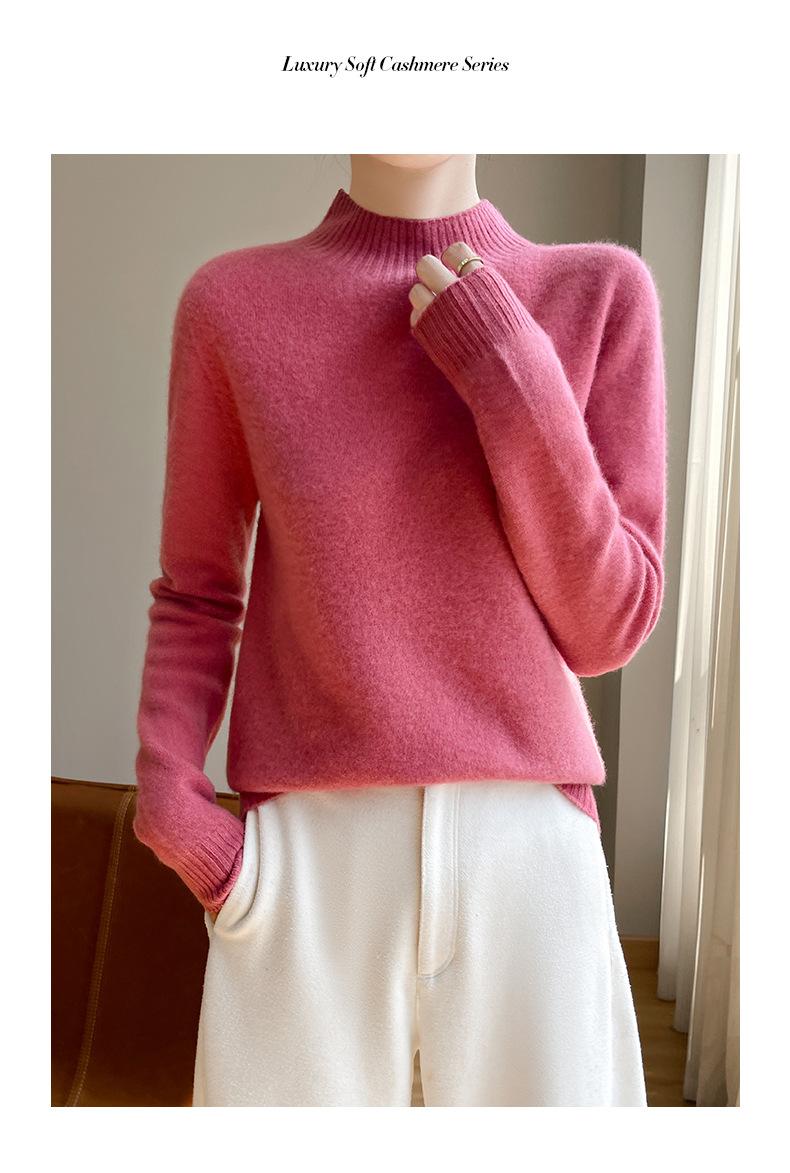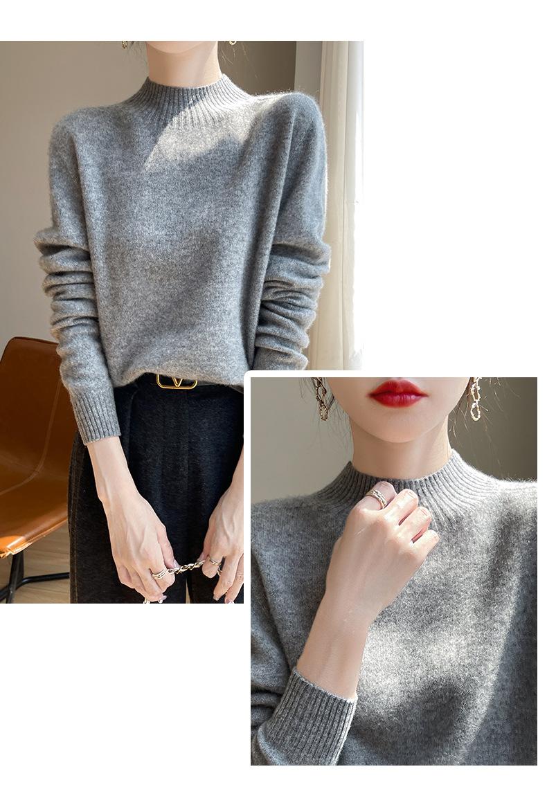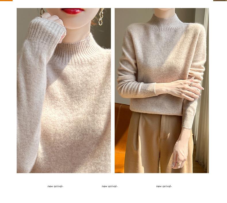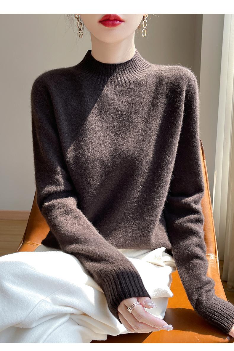 Ropa de primera línea de otoño e invierno, suéter 100% de lana pura, suéter de mujer de cuello medio alto, suéter de manga larga, suéter suelto, abrigo base de cachemira